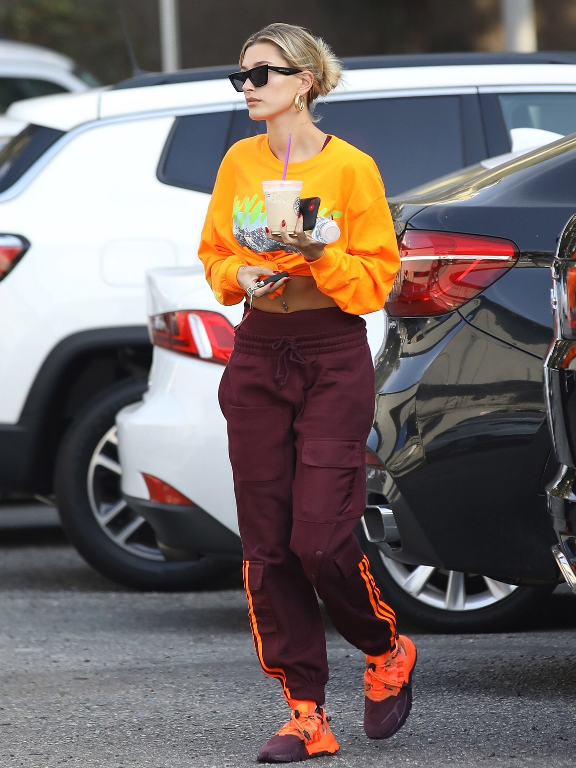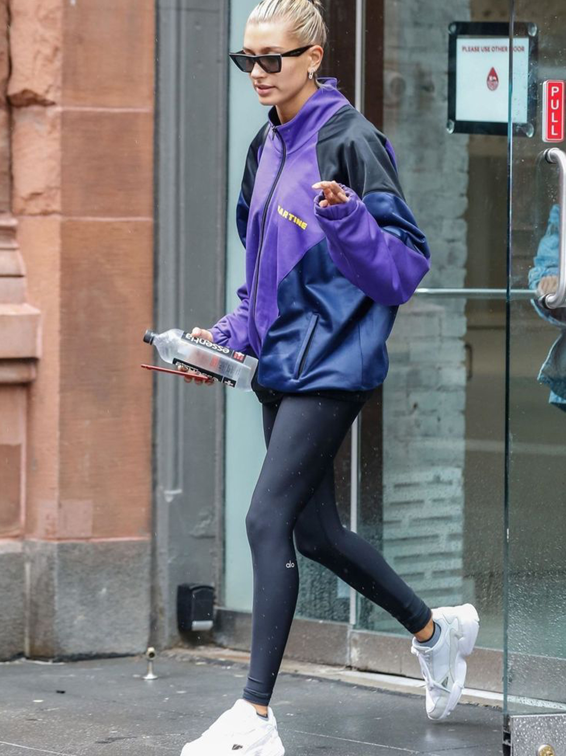 Обогатите свой гардероб велосипедками, леггинсами и объемными худи. Миссис Бибер носит такие сочетания, вдохновляясь стиле 90-х, в особенности образами принцессы Дианы. В спортивных луках вы можете выходить на улицы города или в кафе. Звезда доказывает нам, что такая одежда подходит не только для тренировок в зале, но и для других целей.