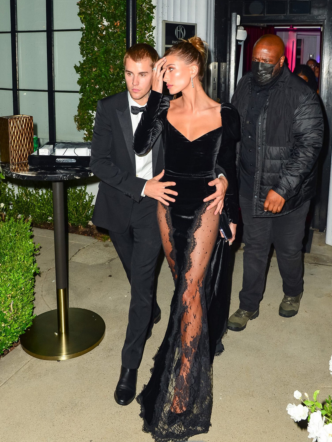 Вечерний аутфит Бибер на афтепати Оскар 2022 затмил окружающих красавиц своей женственностью. Бежевое платье было декорировано вырезами на боках и спине, а запястья девушки украшали массивные браслеты. Несмотря на нюдовую палитру лука, Хейли выглядела очень свежо.