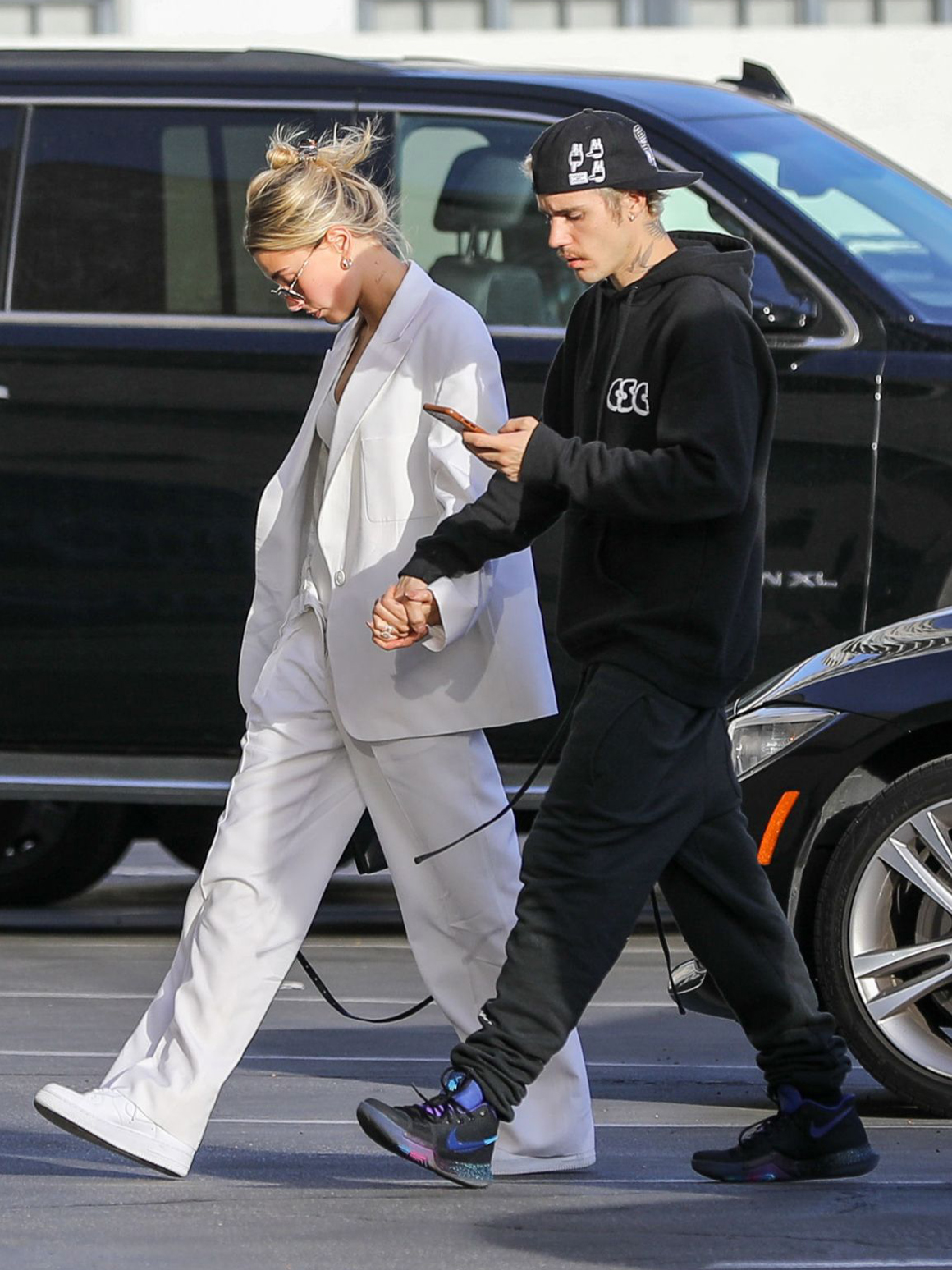 Самым сексуальным образом нужно признать платье-пиджак на голое тело в сочетании с черными босоножками на платформе и каблуке. Такая интересная вариация сопровождала Хейли в ресторан Nobu.