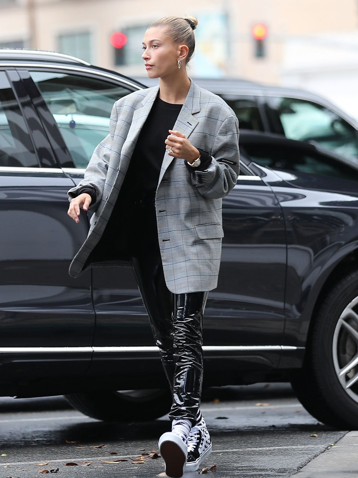 Для Хейли базовым вариантом считается укороченный топ с широкими брюками. Этим приемом селебрити пользуется очень часто. Воспользуйтесь им при первой же возможности. Джинсы или брюки могут быть любой посадки. Низкая — для тех, кому нравится гламур 00-х. Высокая и средняя — для девушек, не готовых оголять свой животик. На Новый год вы можете воспользоваться такой базой, надев золотой кроп-топ с черными брюками.