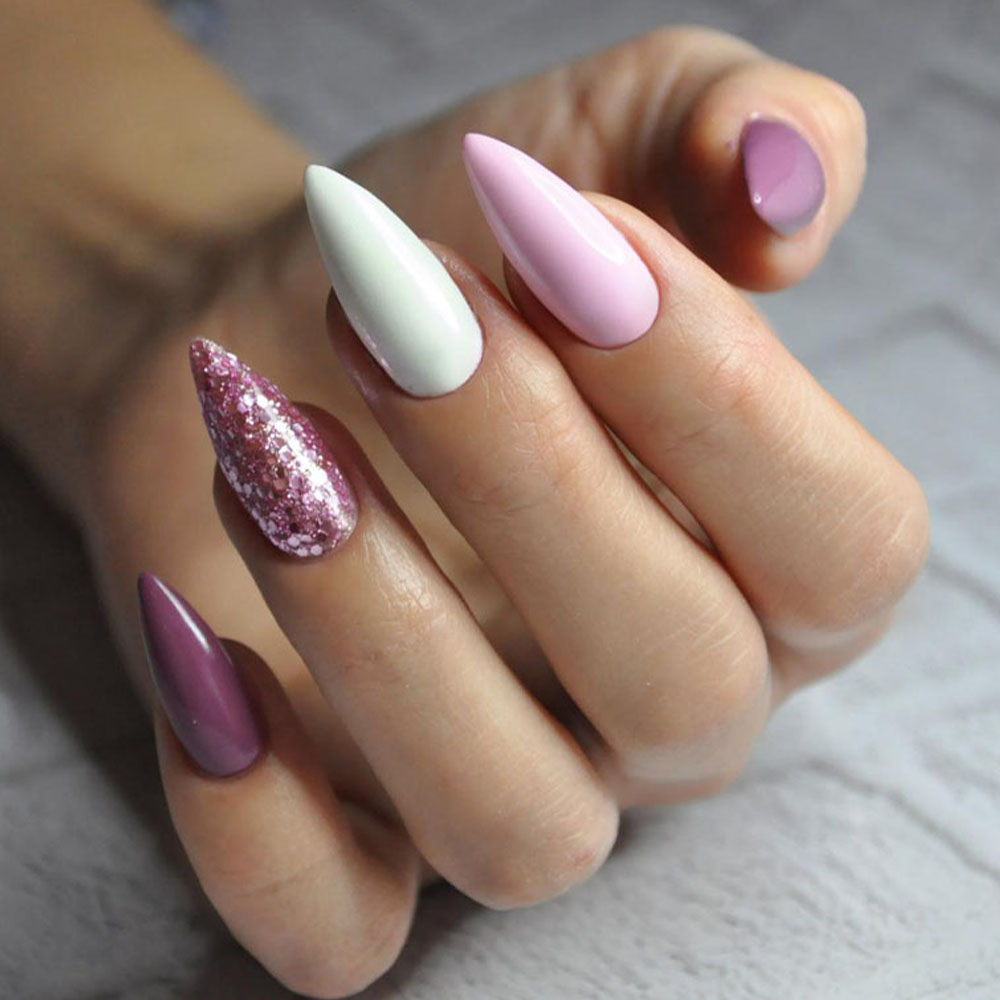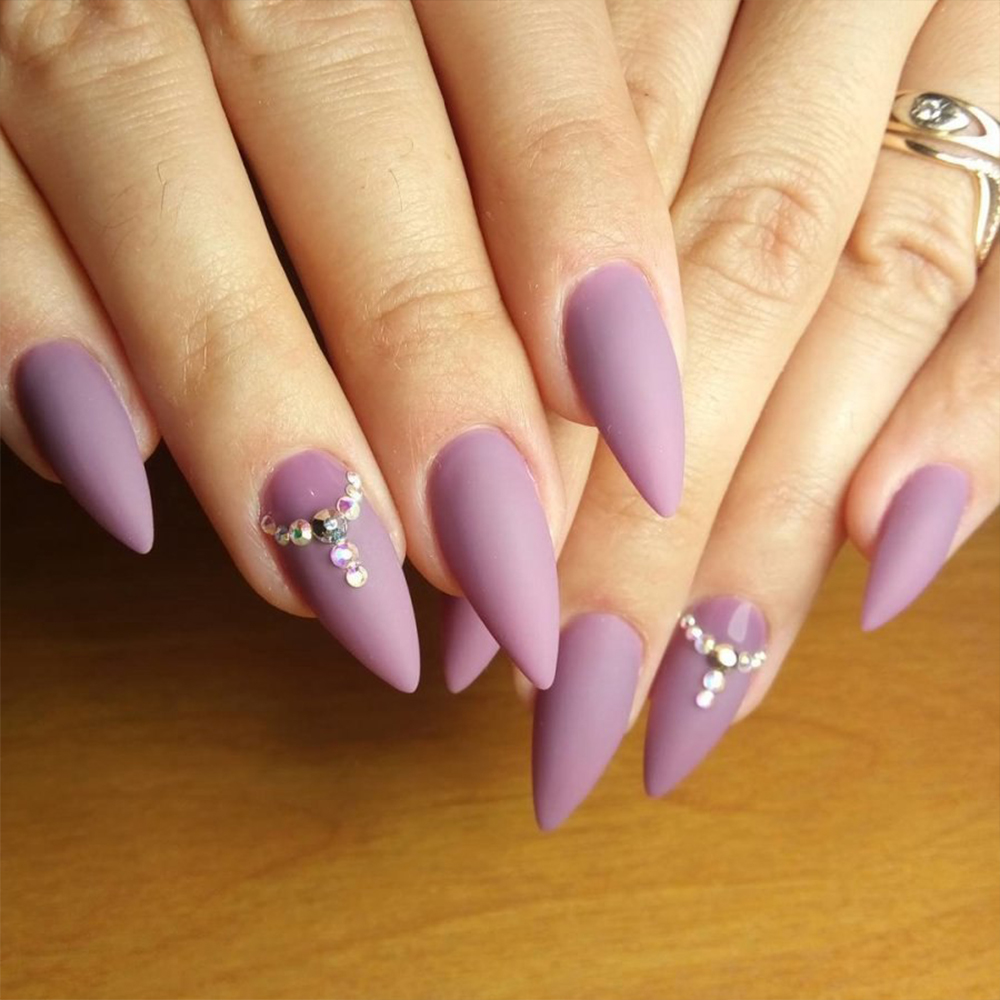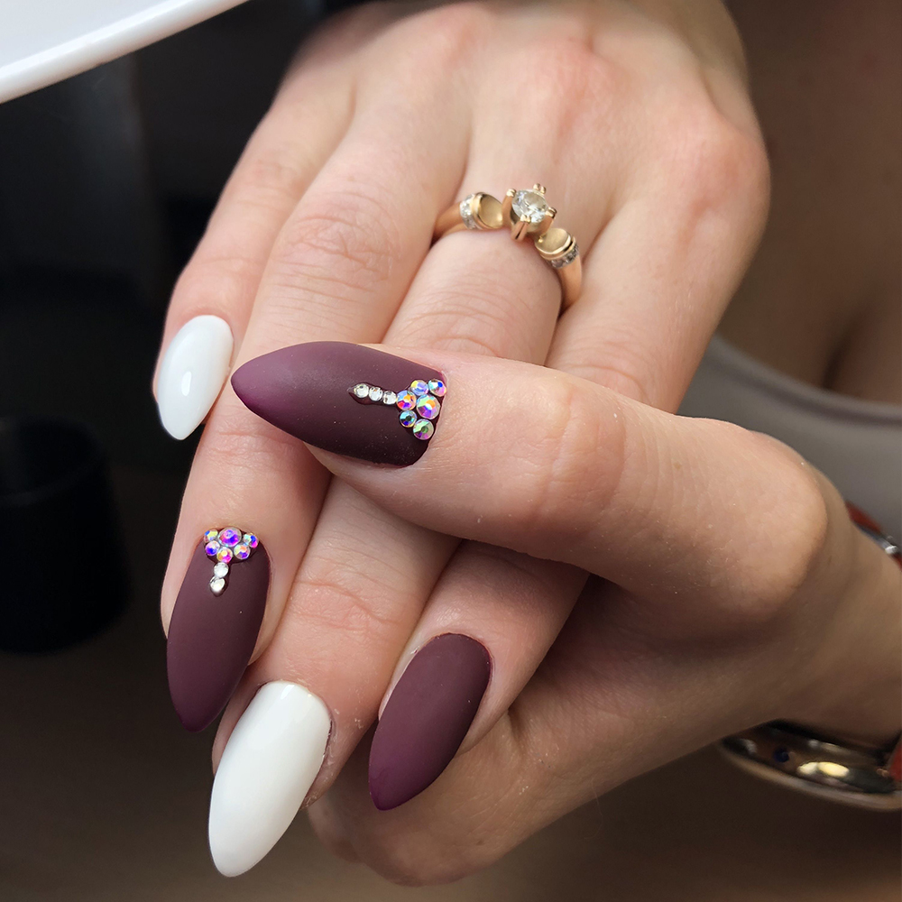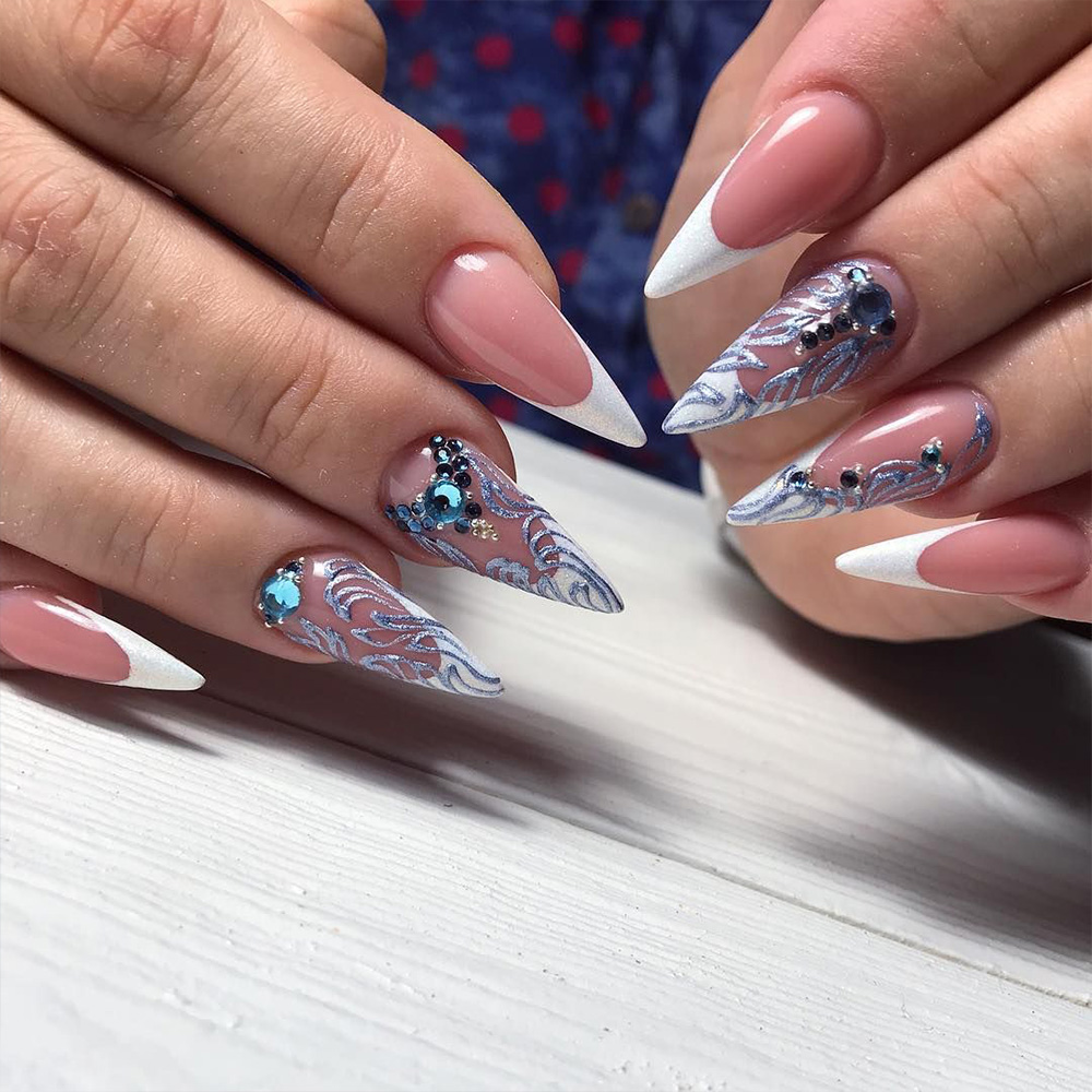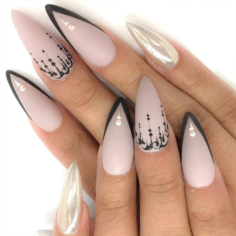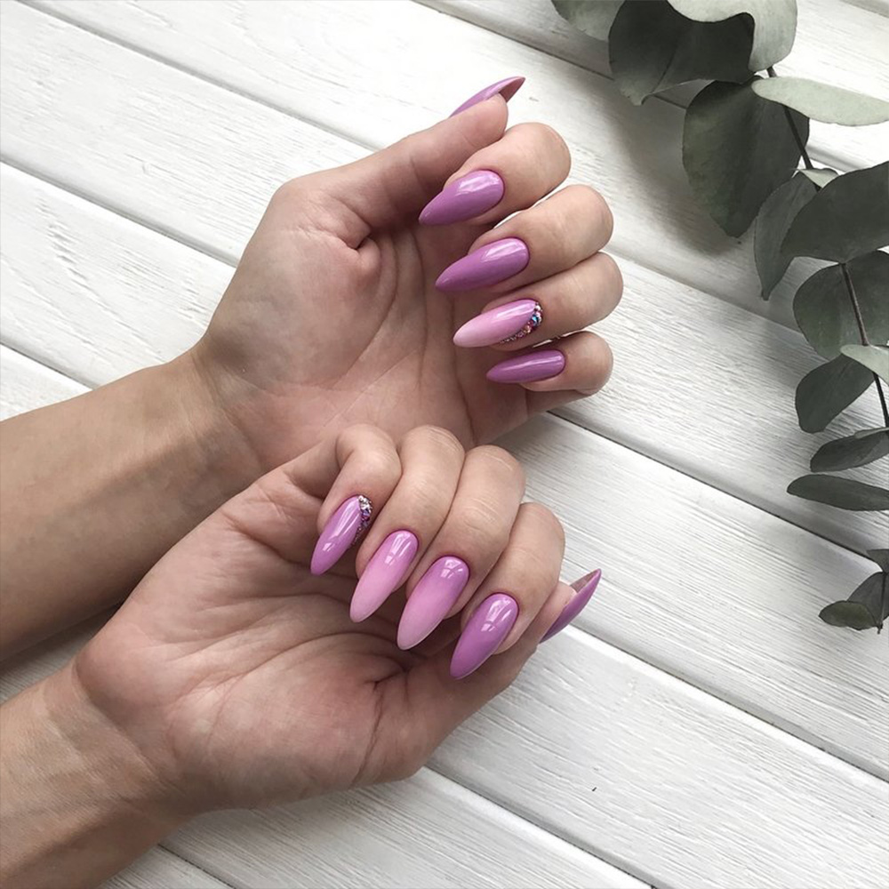 | Заостренная | Схожа с миндалевидной, но требует осторожности с яркими цветами, т.к. форма привлекает внимание сама по себе. На ней отлично будут смотреться графика, нюдовые, матовые оттенки. Если вам хочется добавить больше «праздника», то на помощь придут стразы и камни. Их можно расположить у начала роста ногтя вдоль кутикулы или повторить линию белой лунки (обратной дугой).Единственный минус — на заостренных ногтях любые элементы дизайна лучше размещать ближе к началу ногтевой пластины, а не на свободной части. У края ногтя высокая вероятность того, что весь декор отвалится.На заостренной форме будет отлично смотреться градиент, втирка и «кошачий глаз». Не бойтесь переборщить с узорами и росписью тонкой кистью, они прекрасно вписываются в эту форму. |