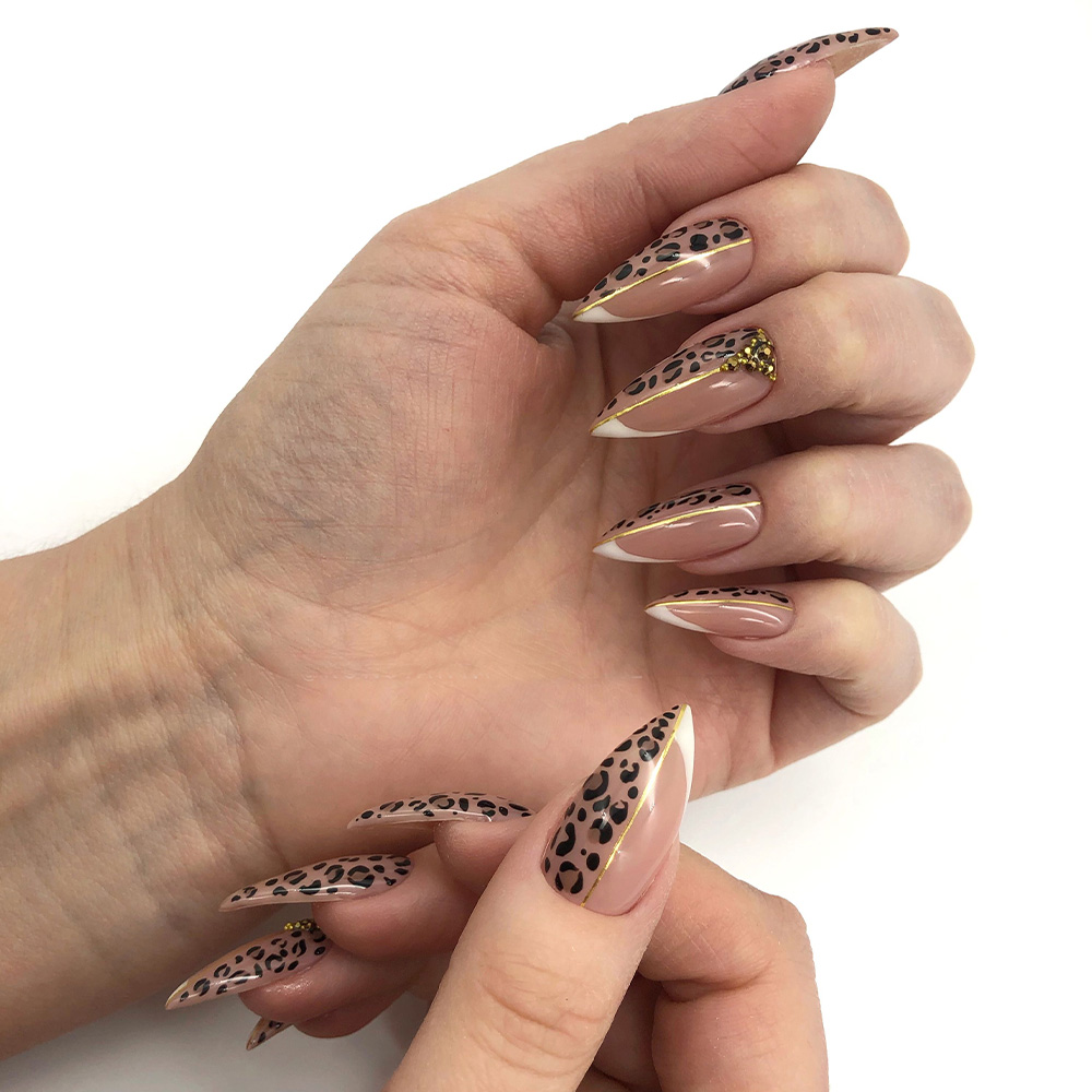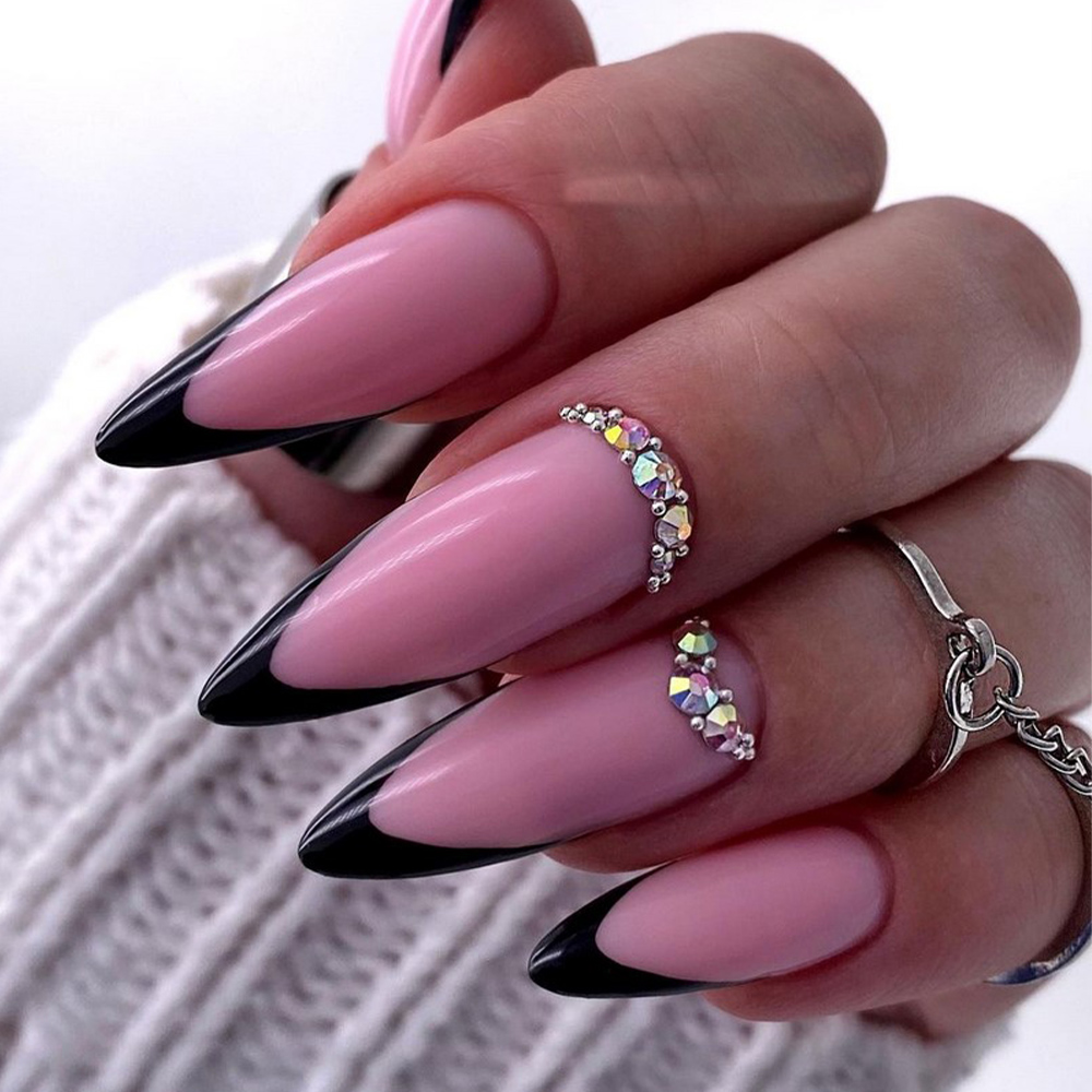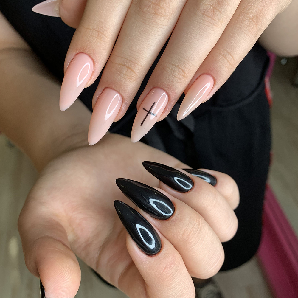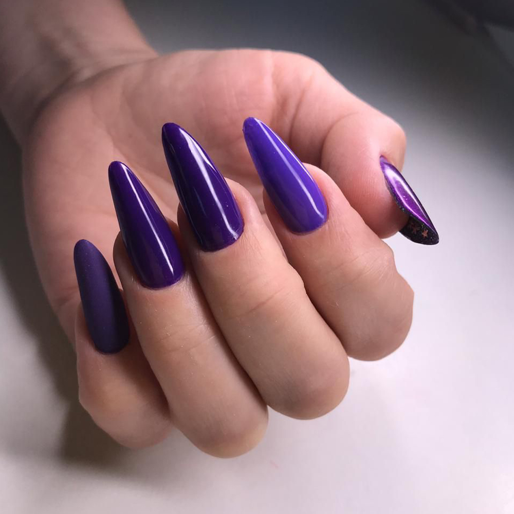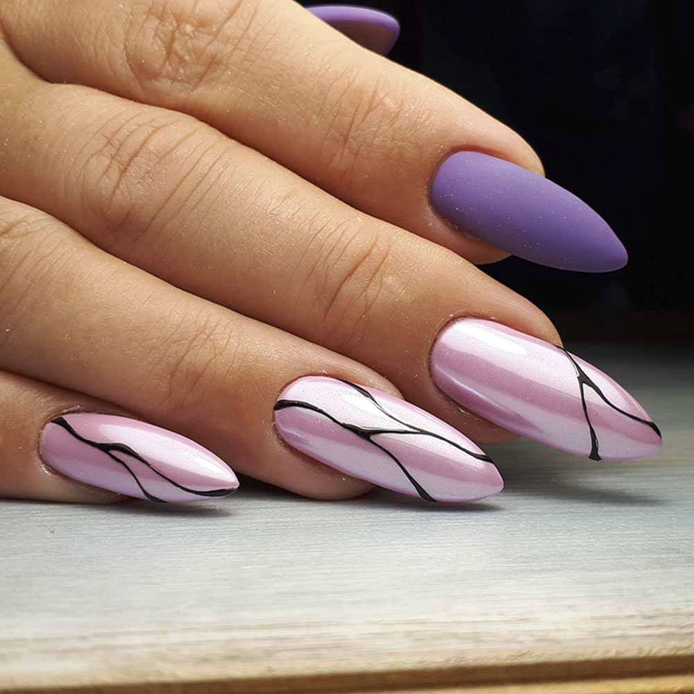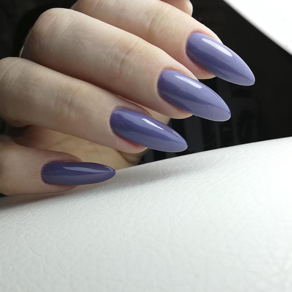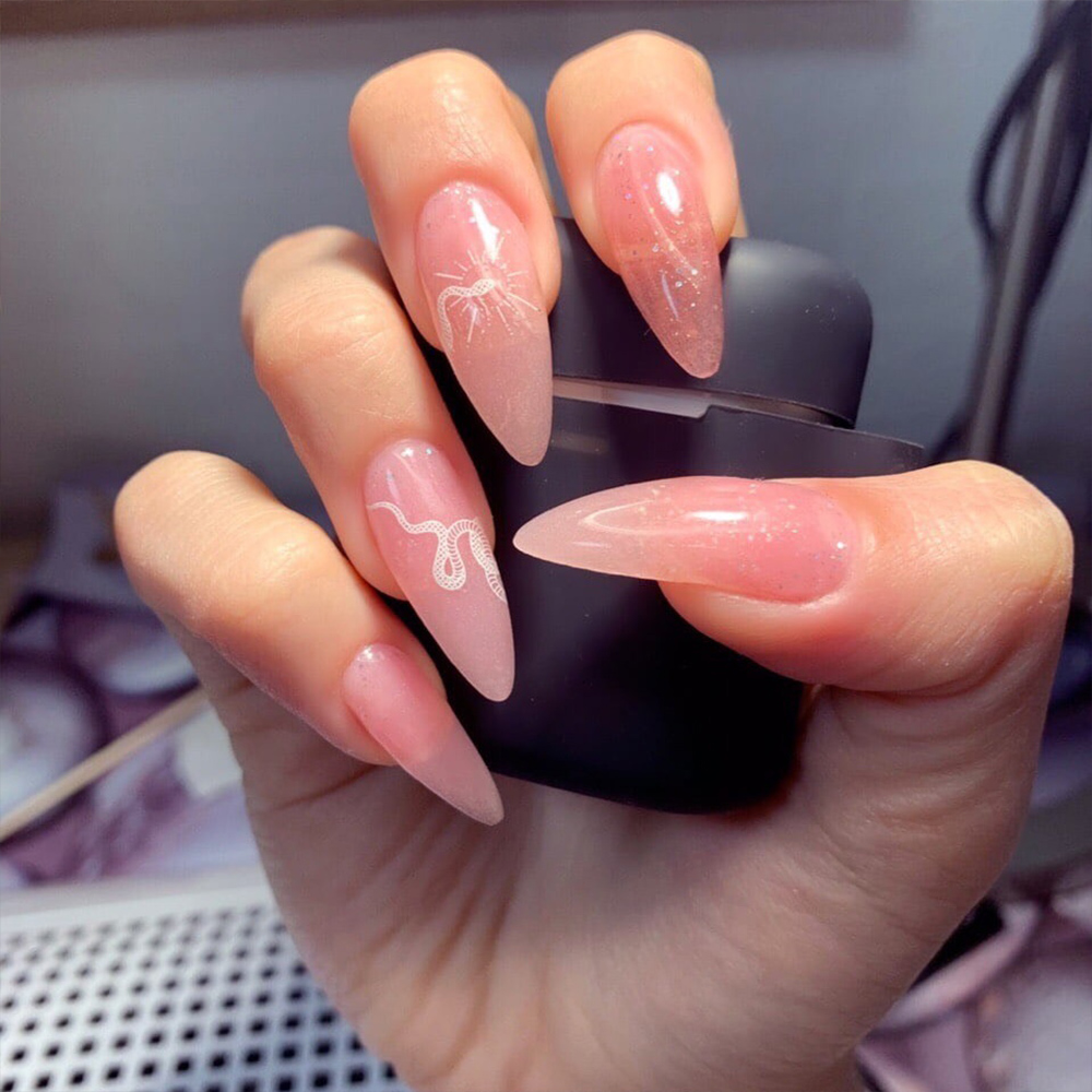 | Заостренная | Схожа с миндалевидной, но требует осторожности с яркими цветами, т.к. форма привлекает внимание сама по себе. На ней отлично будут смотреться графика, нюдовые, матовые оттенки. Если вам хочется добавить больше «праздника», то на помощь придут стразы и камни. Их можно расположить у начала роста ногтя вдоль кутикулы или повторить линию белой лунки (обратной дугой).Единственный минус — на заостренных ногтях любые элементы дизайна лучше размещать ближе к началу ногтевой пластины, а не на свободной части. У края ногтя высокая вероятность того, что весь декор отвалится.На заостренной форме будет отлично смотреться градиент, втирка и «кошачий глаз». Не бойтесь переборщить с узорами и росписью тонкой кистью, они прекрасно вписываются в эту форму. |