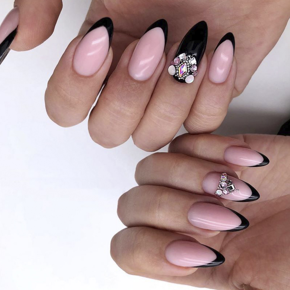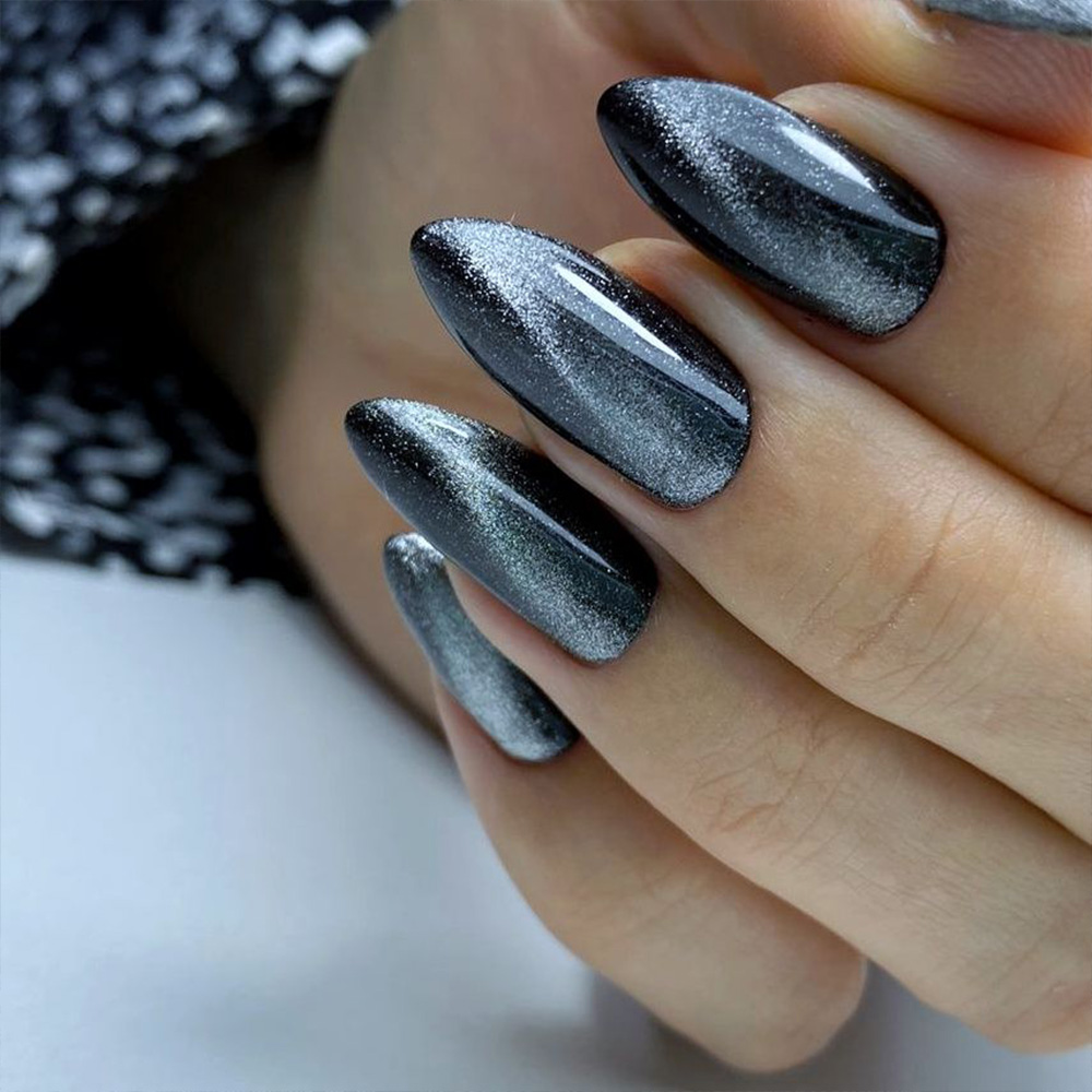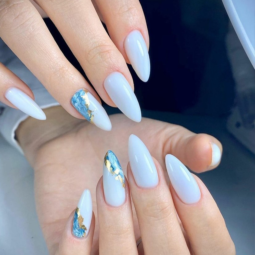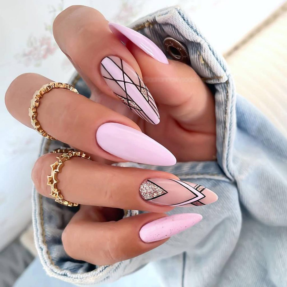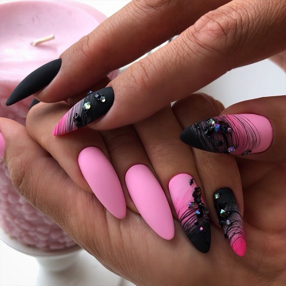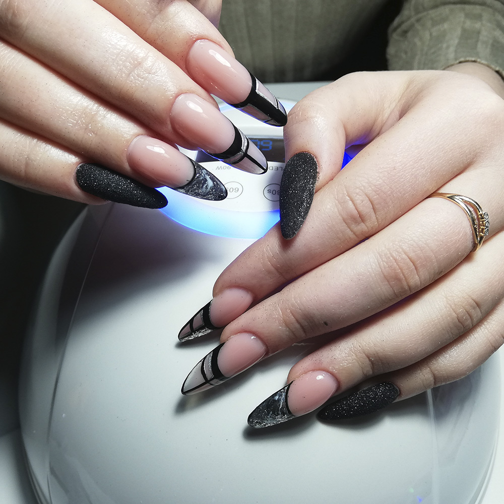| Заостренная | Схожа с миндалевидной, но требует осторожности с яркими цветами, т.к. форма привлекает внимание сама по себе. На ней отлично будут смотреться графика, нюдовые, матовые оттенки. Если вам хочется добавить больше «праздника», то на помощь придут стразы и камни. Их можно расположить у начала роста ногтя вдоль кутикулы или повторить линию белой лунки (обратной дугой).Единственный минус — на заостренных ногтях любые элементы дизайна лучше размещать ближе к началу ногтевой пластины, а не на свободной части. У края ногтя высокая вероятность того, что весь декор отвалится.На заостренной форме будет отлично смотреться градиент, втирка и «кошачий глаз». Не бойтесь переборщить с узорами и росписью тонкой кистью, они прекрасно вписываются в эту форму. |