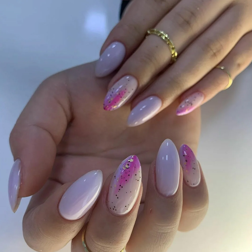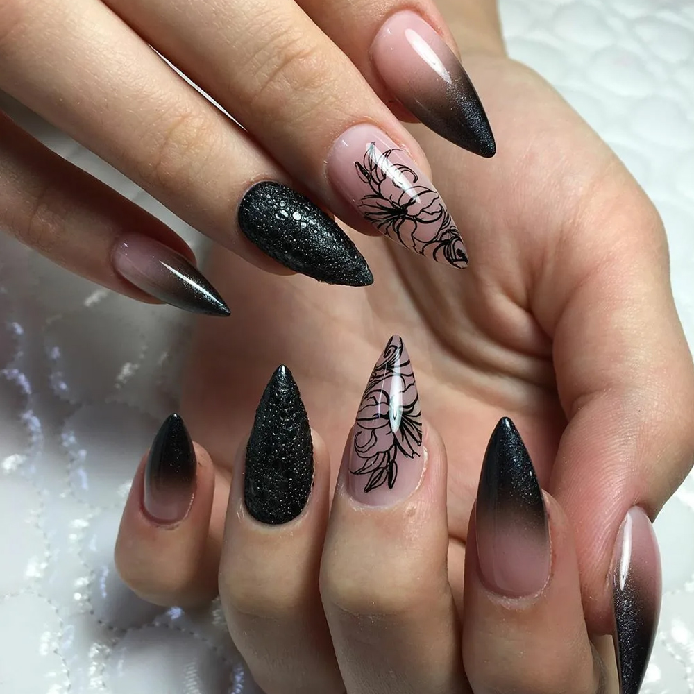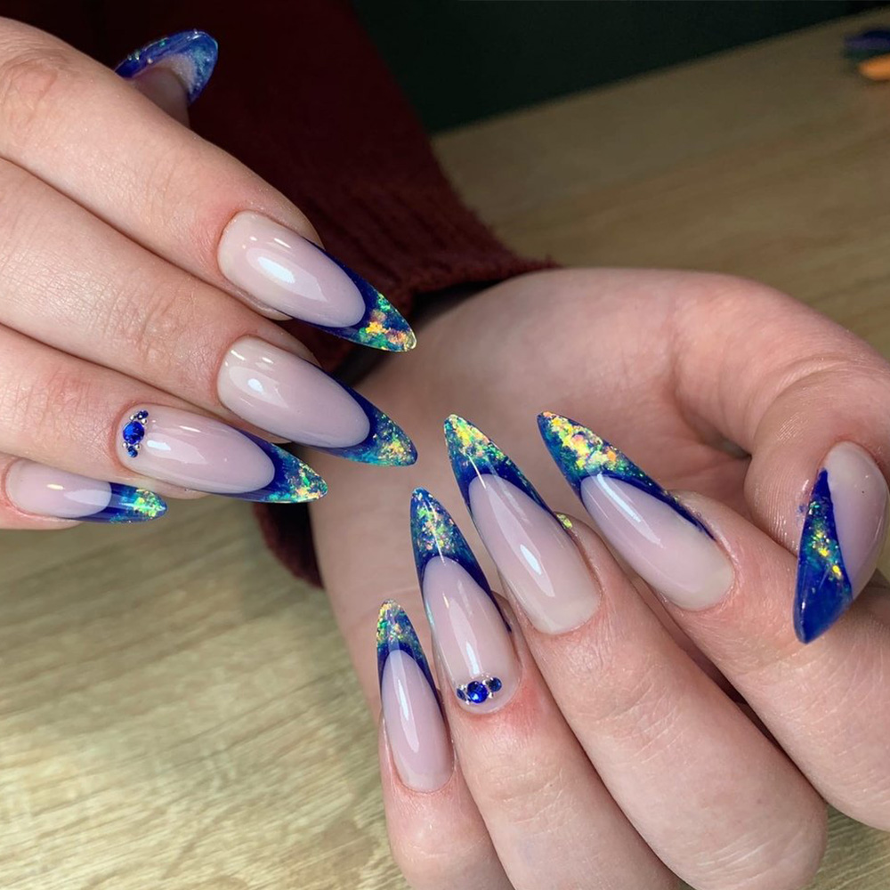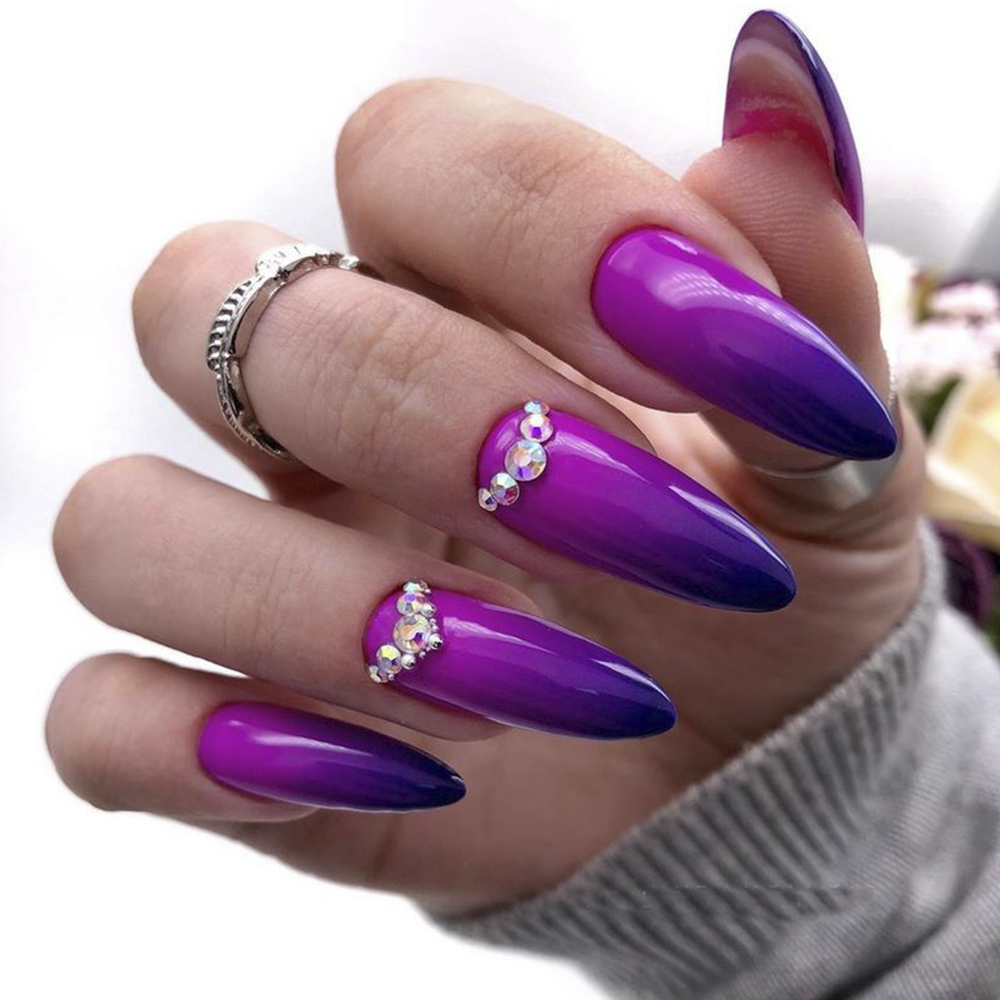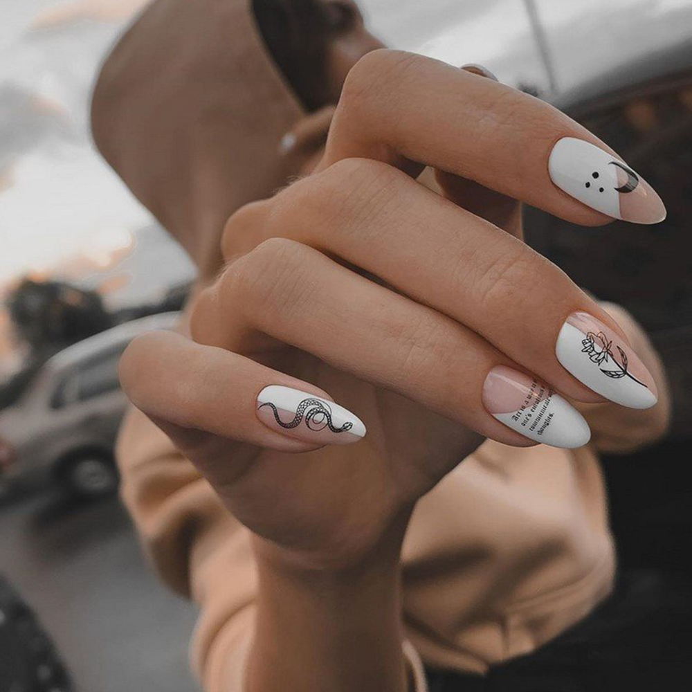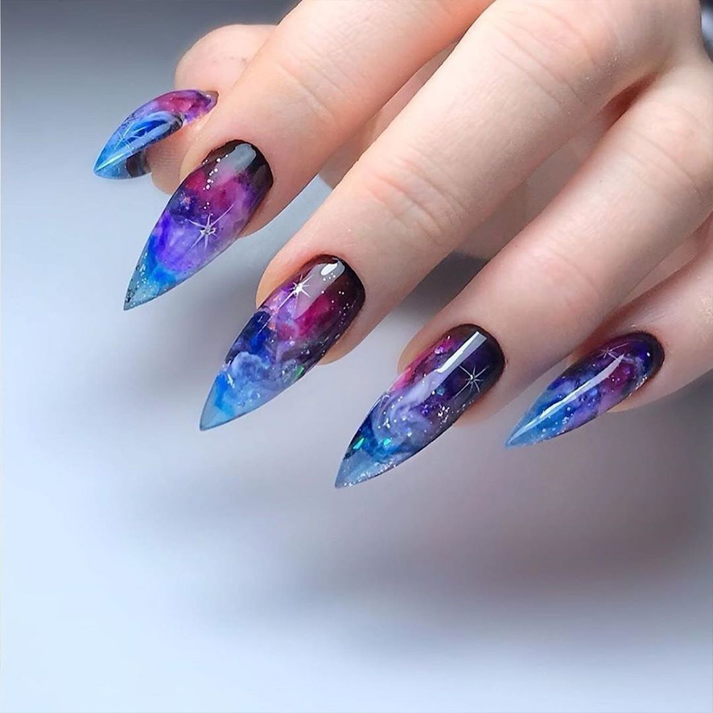 | Заостренная | Схожа с миндалевидной, но требует осторожности с яркими цветами, т.к. форма привлекает внимание сама по себе. На ней отлично будут смотреться графика, нюдовые, матовые оттенки. Если вам хочется добавить больше «праздника», то на помощь придут стразы и камни. Их можно расположить у начала роста ногтя вдоль кутикулы или повторить линию белой лунки (обратной дугой).Единственный минус — на заостренных ногтях любые элементы дизайна лучше размещать ближе к началу ногтевой пластины, а не на свободной части. У края ногтя высокая вероятность того, что весь декор отвалится.На заостренной форме будет отлично смотреться градиент, втирка и «кошачий глаз». Не бойтесь переборщить с узорами и росписью тонкой кистью, они прекрасно вписываются в эту форму. |