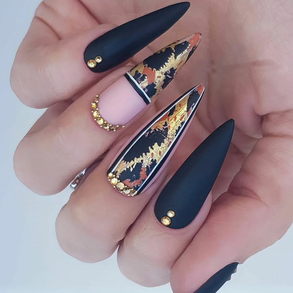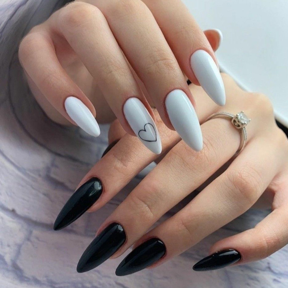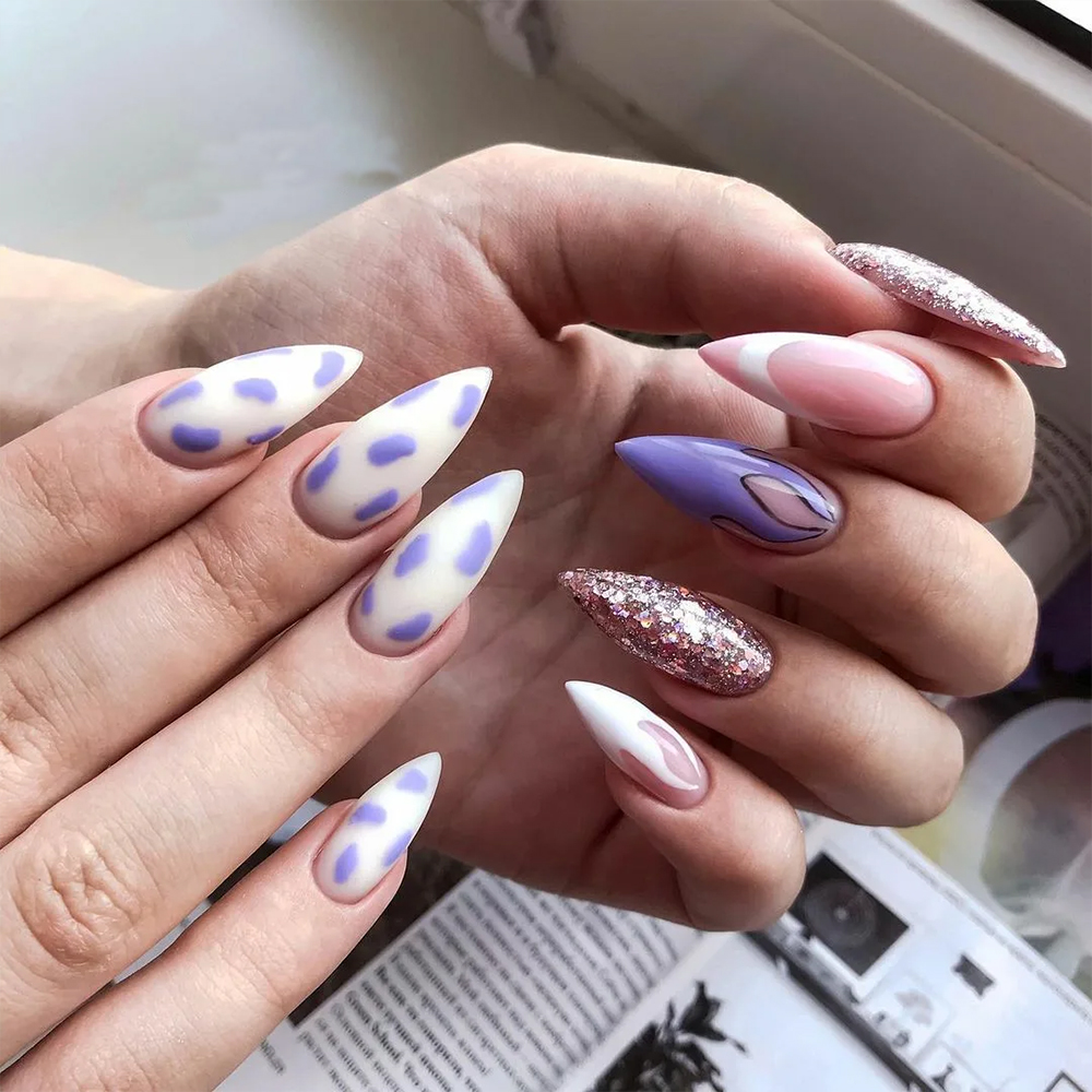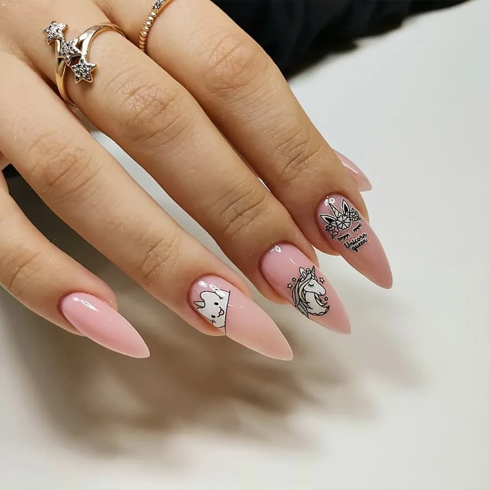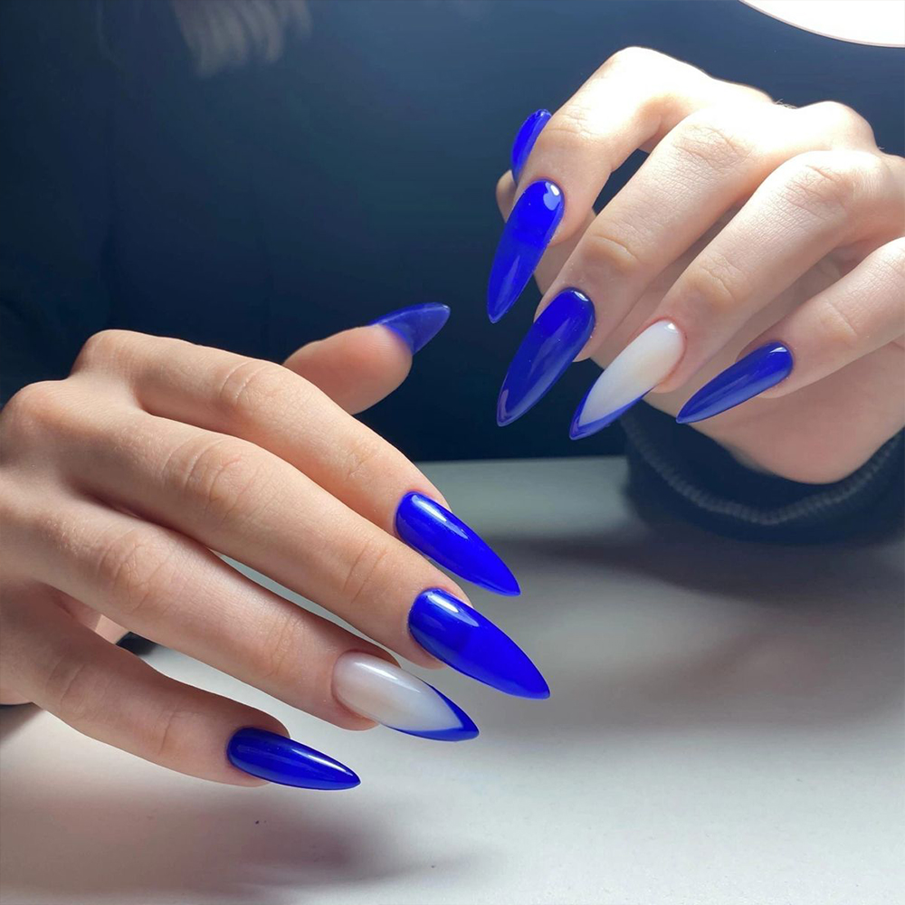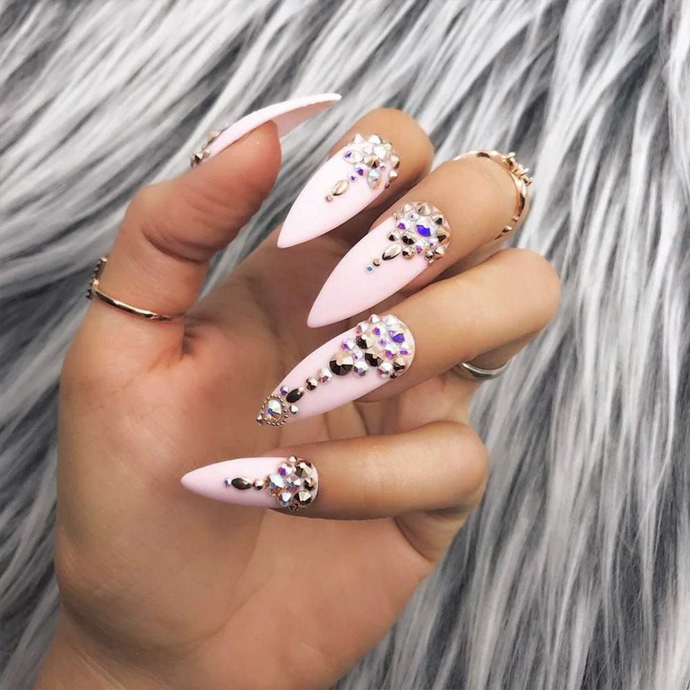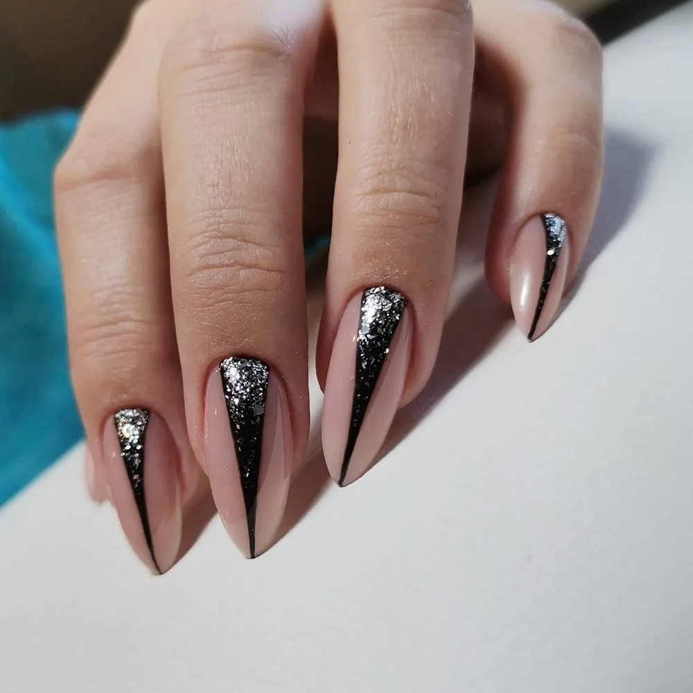 | Заостренная | Схожа с миндалевидной, но требует осторожности с яркими цветами, т.к. форма привлекает внимание сама по себе. На ней отлично будут смотреться графика, нюдовые, матовые оттенки. Если вам хочется добавить больше «праздника», то на помощь придут стразы и камни. Их можно расположить у начала роста ногтя вдоль кутикулы или повторить линию белой лунки (обратной дугой).Единственный минус — на заостренных ногтях любые элементы дизайна лучше размещать ближе к началу ногтевой пластины, а не на свободной части. У края ногтя высокая вероятность того, что весь декор отвалится.На заостренной форме будет отлично смотреться градиент, втирка и «кошачий глаз». Не бойтесь переборщить с узорами и росписью тонкой кистью, они прекрасно вписываются в эту форму. |