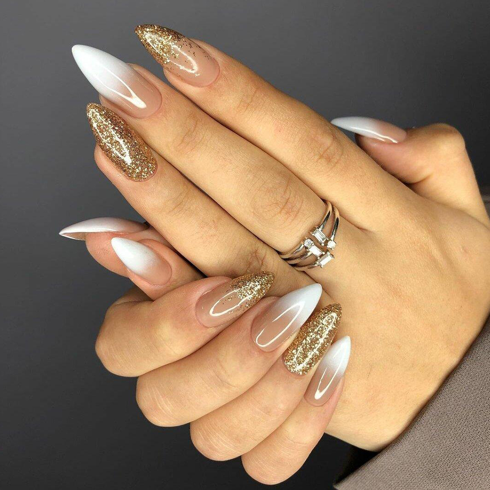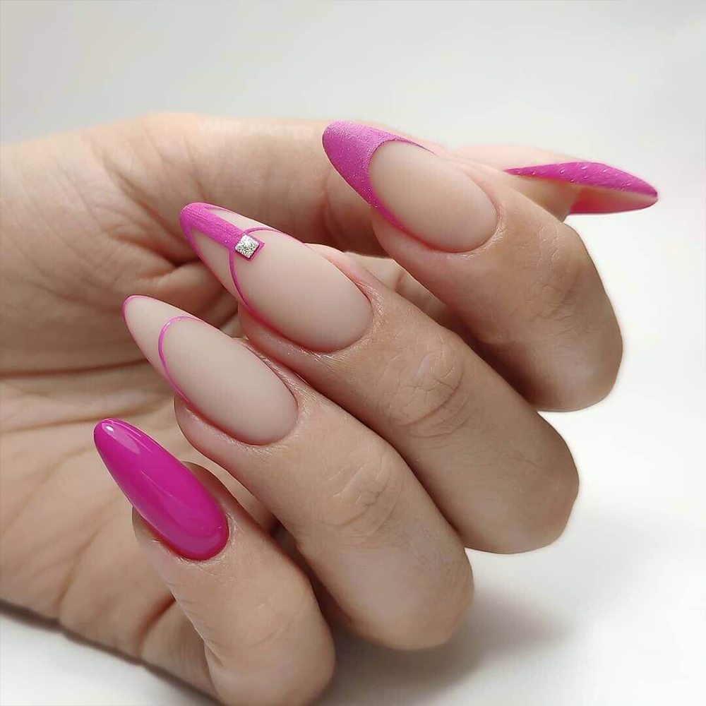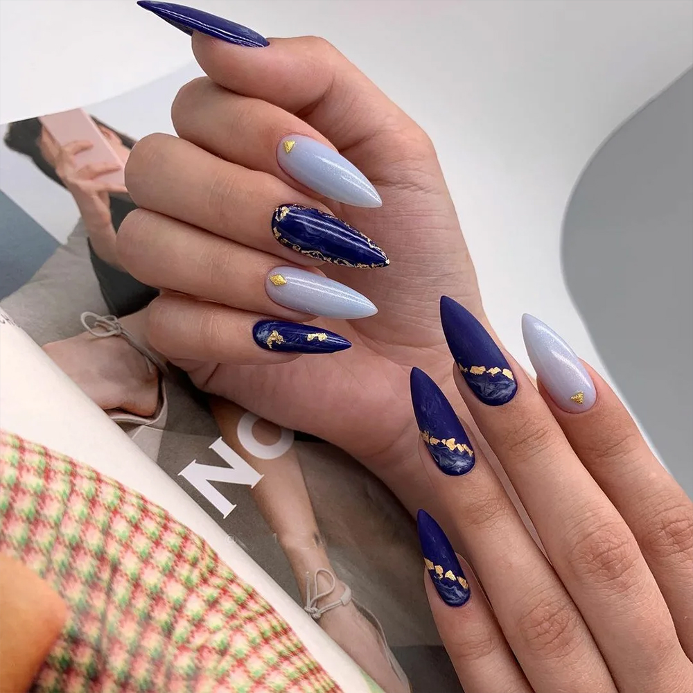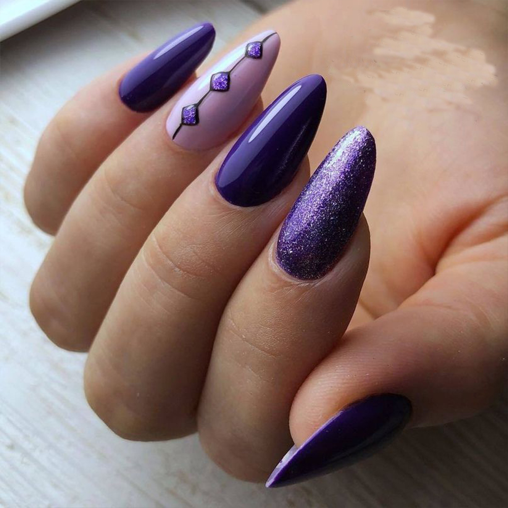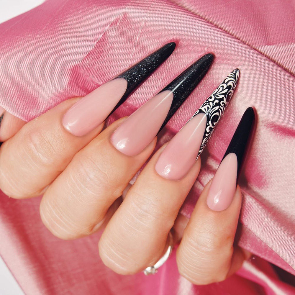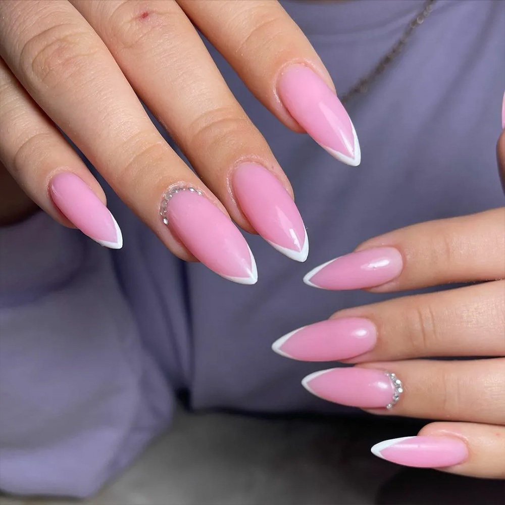 | Заостренная | Схожа с миндалевидной, но требует осторожности с яркими цветами, т.к. форма привлекает внимание сама по себе. На ней отлично будут смотреться графика, нюдовые, матовые оттенки. Если вам хочется добавить больше «праздника», то на помощь придут стразы и камни. Их можно расположить у начала роста ногтя вдоль кутикулы или повторить линию белой лунки (обратной дугой).Единственный минус — на заостренных ногтях любые элементы дизайна лучше размещать ближе к началу ногтевой пластины, а не на свободной части. У края ногтя высокая вероятность того, что весь декор отвалится.На заостренной форме будет отлично смотреться градиент, втирка и «кошачий глаз». Не бойтесь переборщить с узорами и росписью тонкой кистью, они прекрасно вписываются в эту форму. |