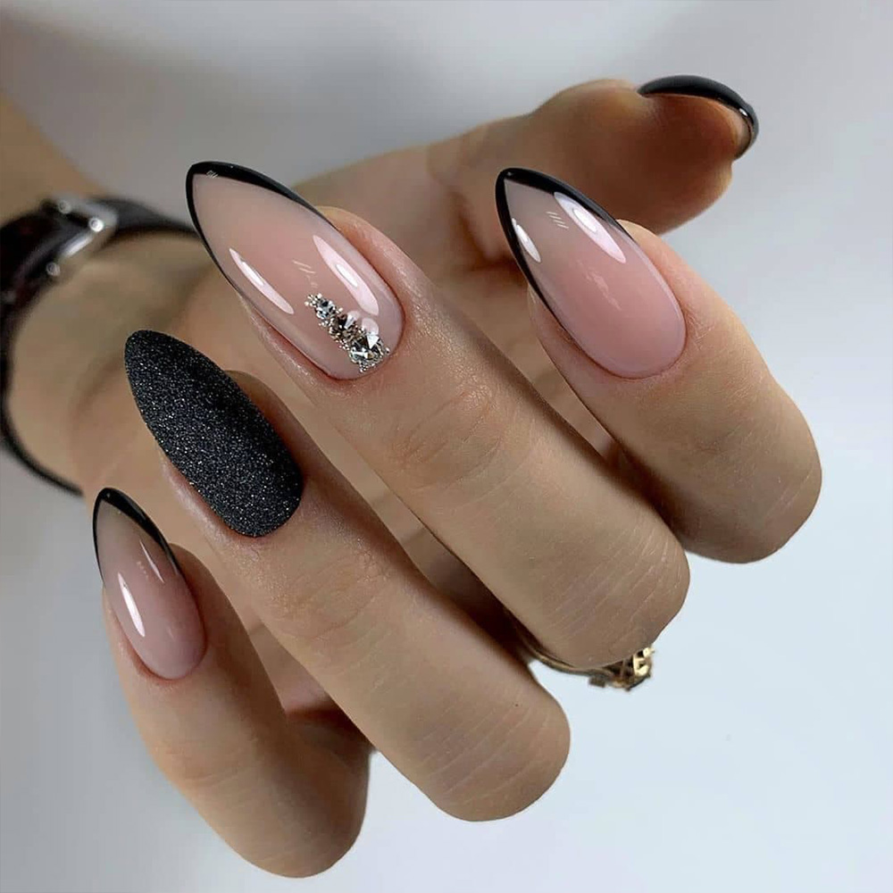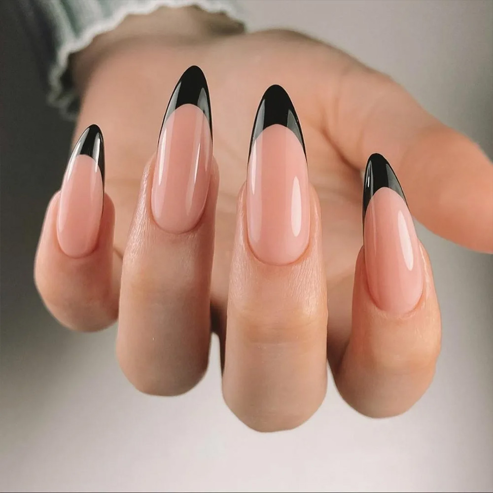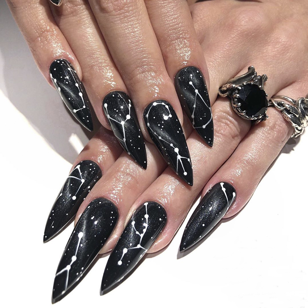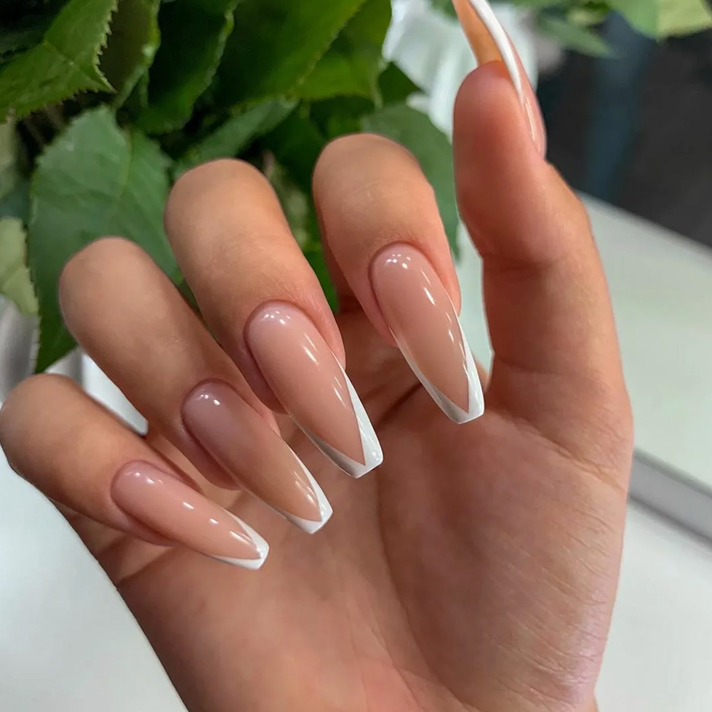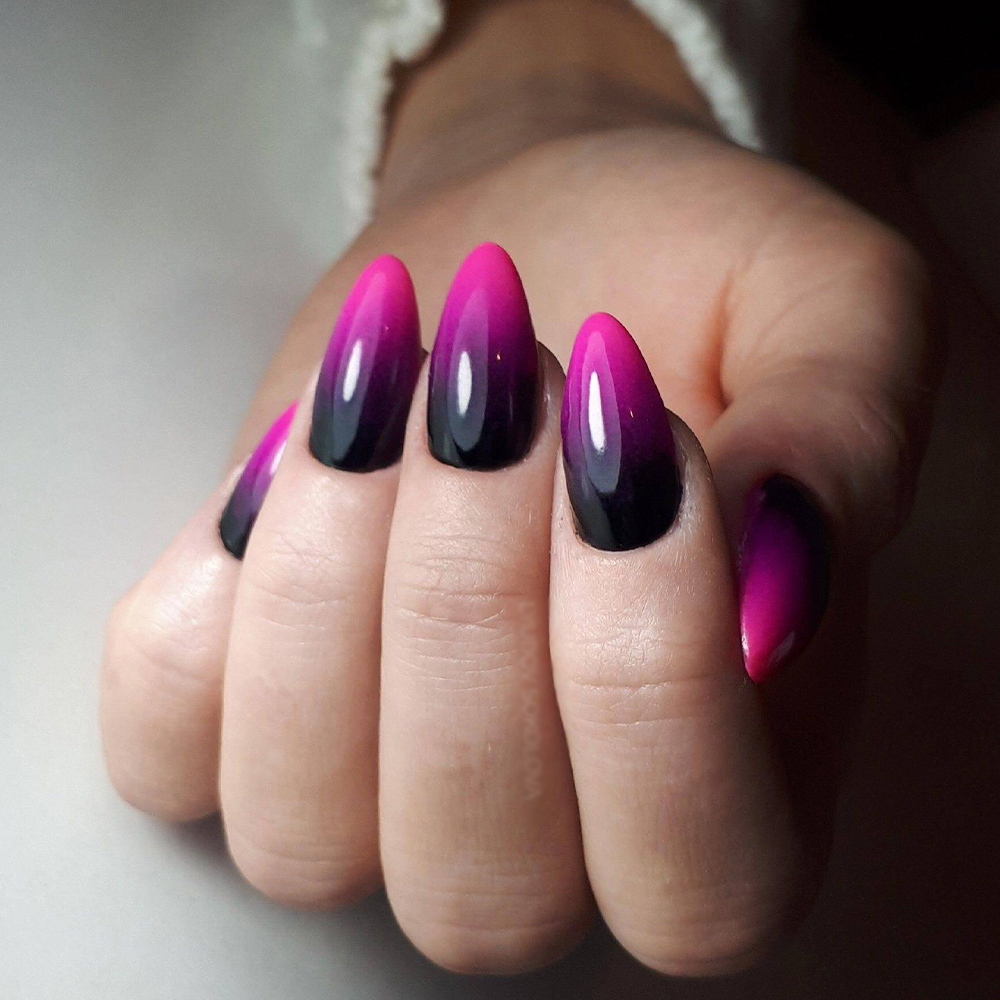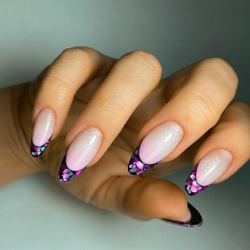 | Заостренная | Схожа с миндалевидной, но требует осторожности с яркими цветами, т.к. форма привлекает внимание сама по себе. На ней отлично будут смотреться графика, нюдовые, матовые оттенки. Если вам хочется добавить больше «праздника», то на помощь придут стразы и камни. Их можно расположить у начала роста ногтя вдоль кутикулы или повторить линию белой лунки (обратной дугой).Единственный минус — на заостренных ногтях любые элементы дизайна лучше размещать ближе к началу ногтевой пластины, а не на свободной части. У края ногтя высокая вероятность того, что весь декор отвалится.На заостренной форме будет отлично смотреться градиент, втирка и «кошачий глаз». Не бойтесь переборщить с узорами и росписью тонкой кистью, они прекрасно вписываются в эту форму. |