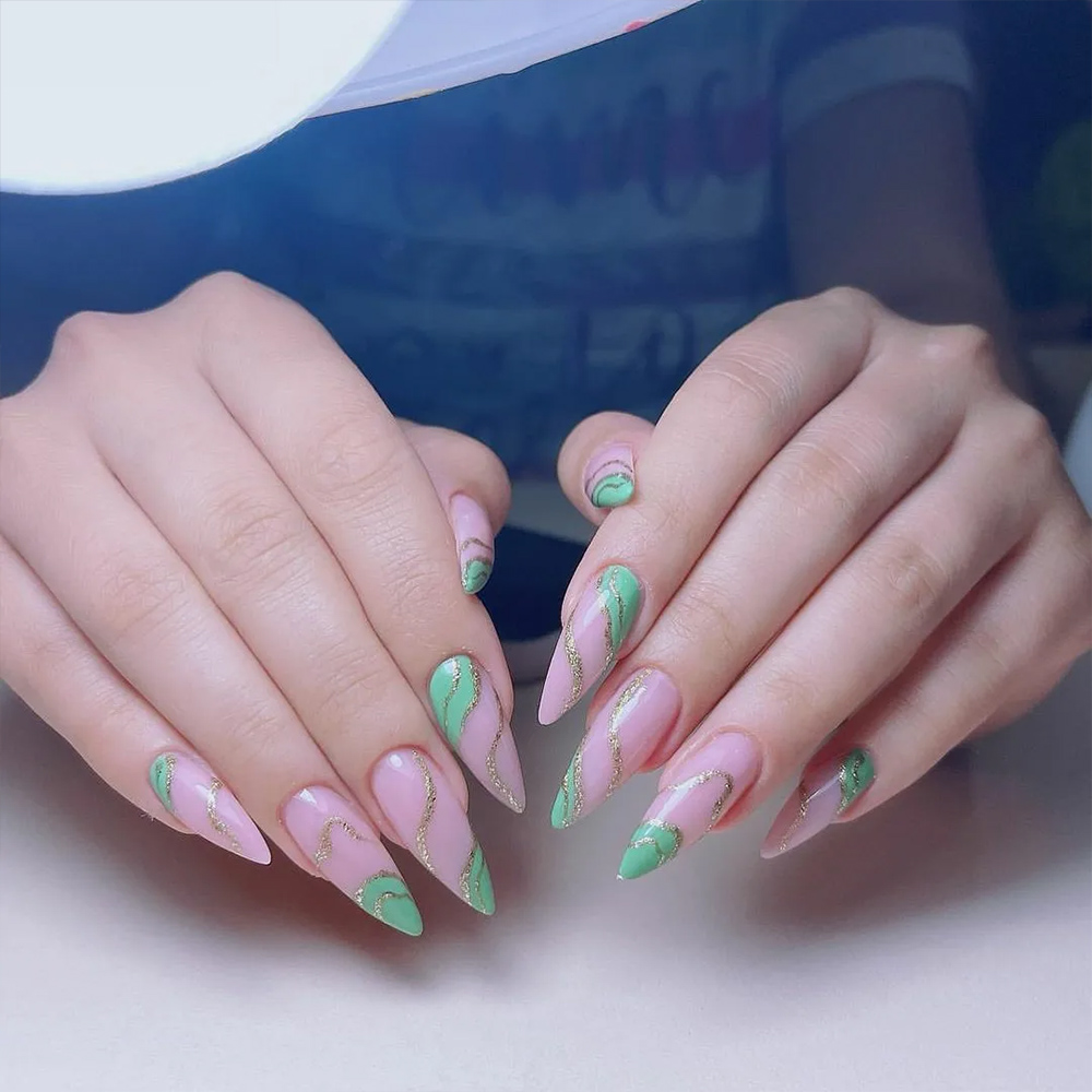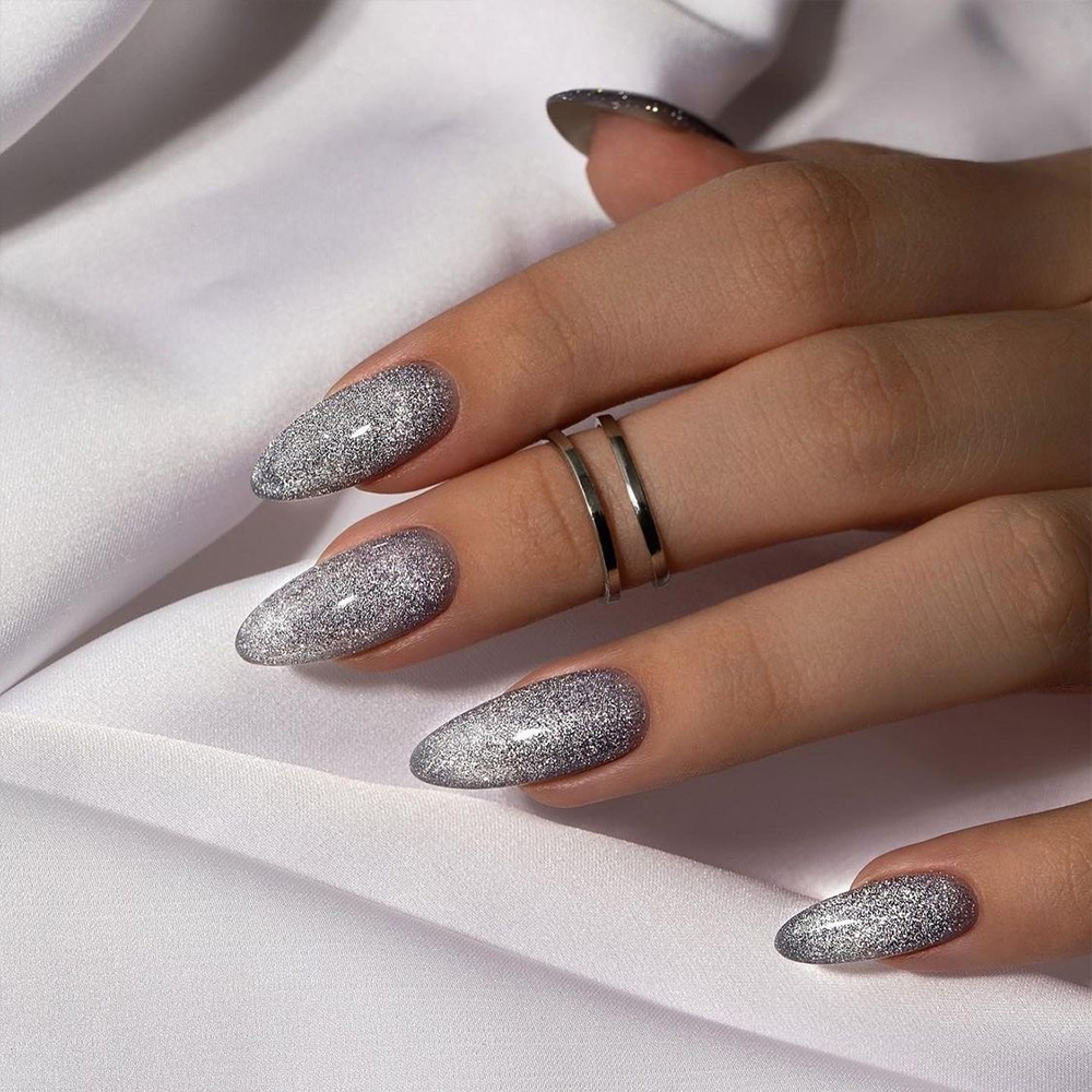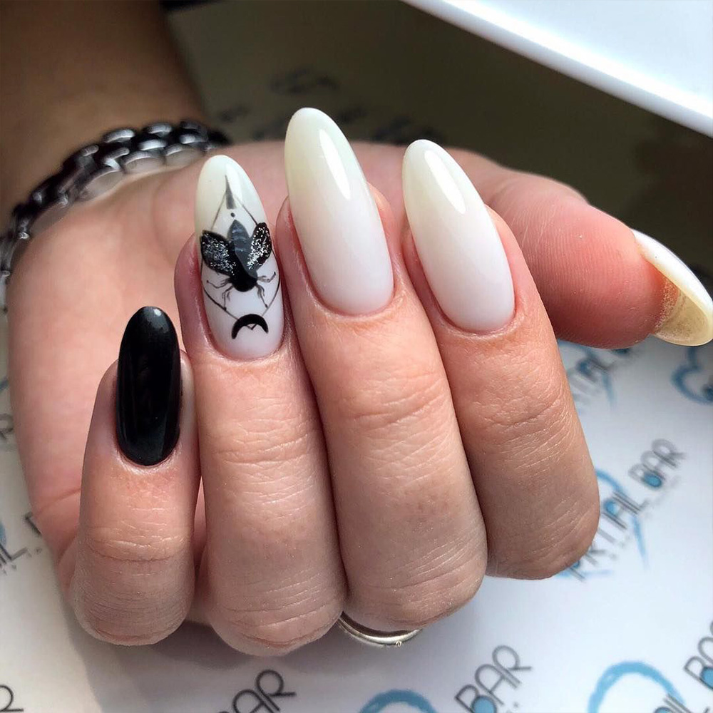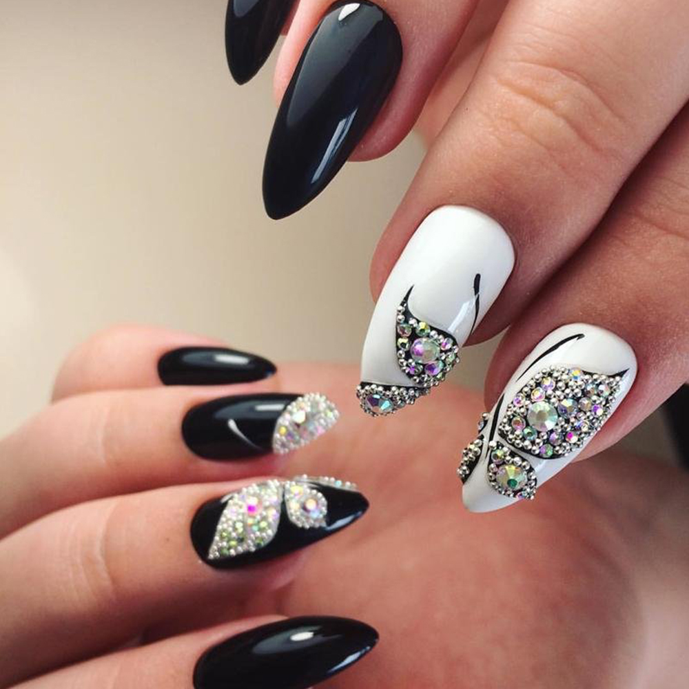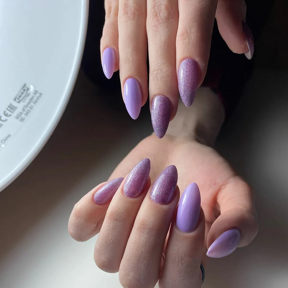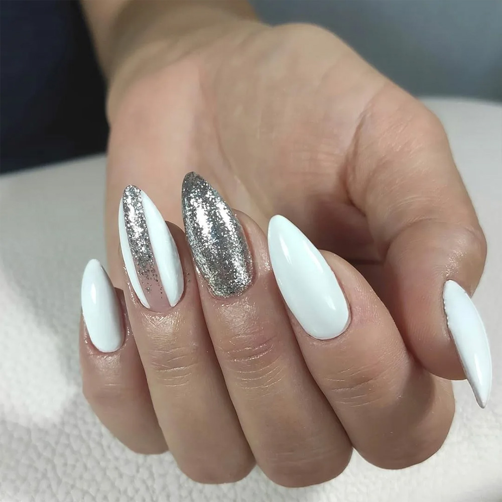 | Заостренная | Схожа с миндалевидной, но требует осторожности с яркими цветами, т.к. форма привлекает внимание сама по себе. На ней отлично будут смотреться графика, нюдовые, матовые оттенки. Если вам хочется добавить больше «праздника», то на помощь придут стразы и камни. Их можно расположить у начала роста ногтя вдоль кутикулы или повторить линию белой лунки (обратной дугой).Единственный минус — на заостренных ногтях любые элементы дизайна лучше размещать ближе к началу ногтевой пластины, а не на свободной части. У края ногтя высокая вероятность того, что весь декор отвалится.На заостренной форме будет отлично смотреться градиент, втирка и «кошачий глаз». Не бойтесь переборщить с узорами и росписью тонкой кистью, они прекрасно вписываются в эту форму. |