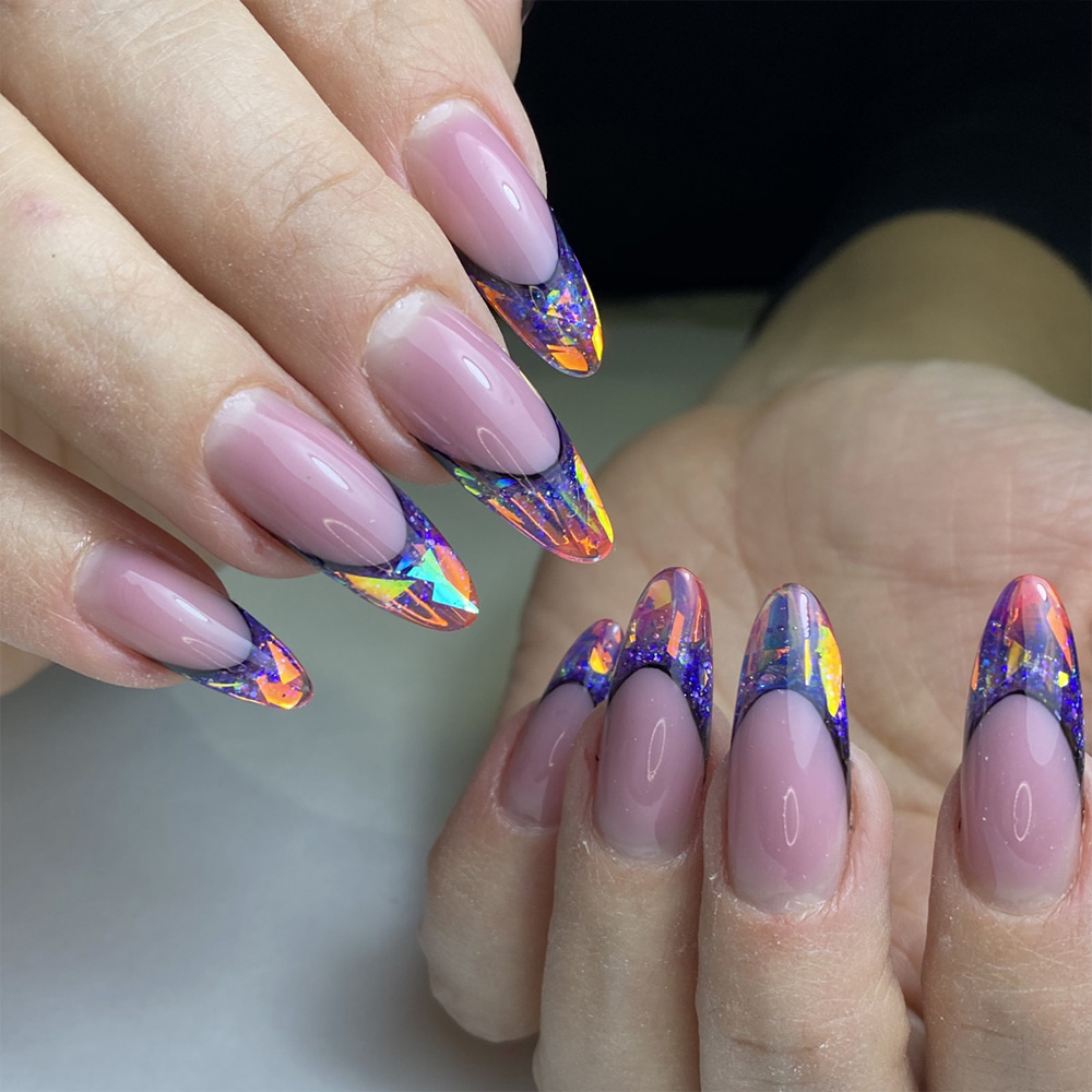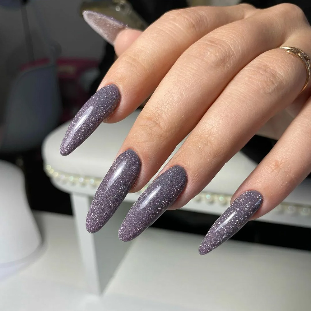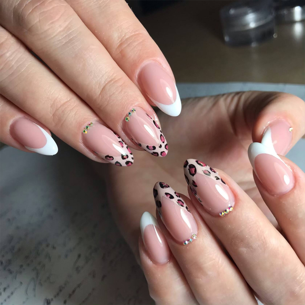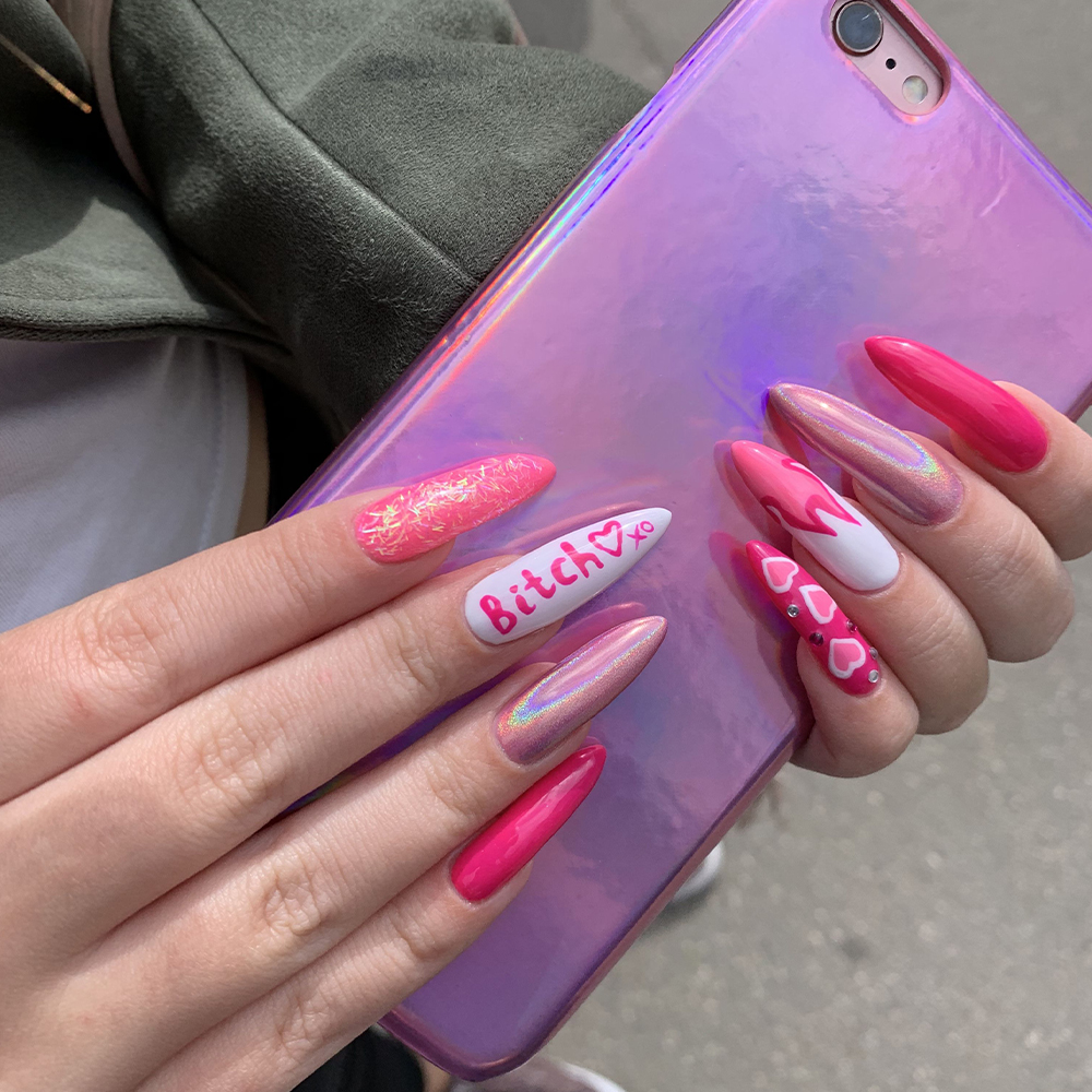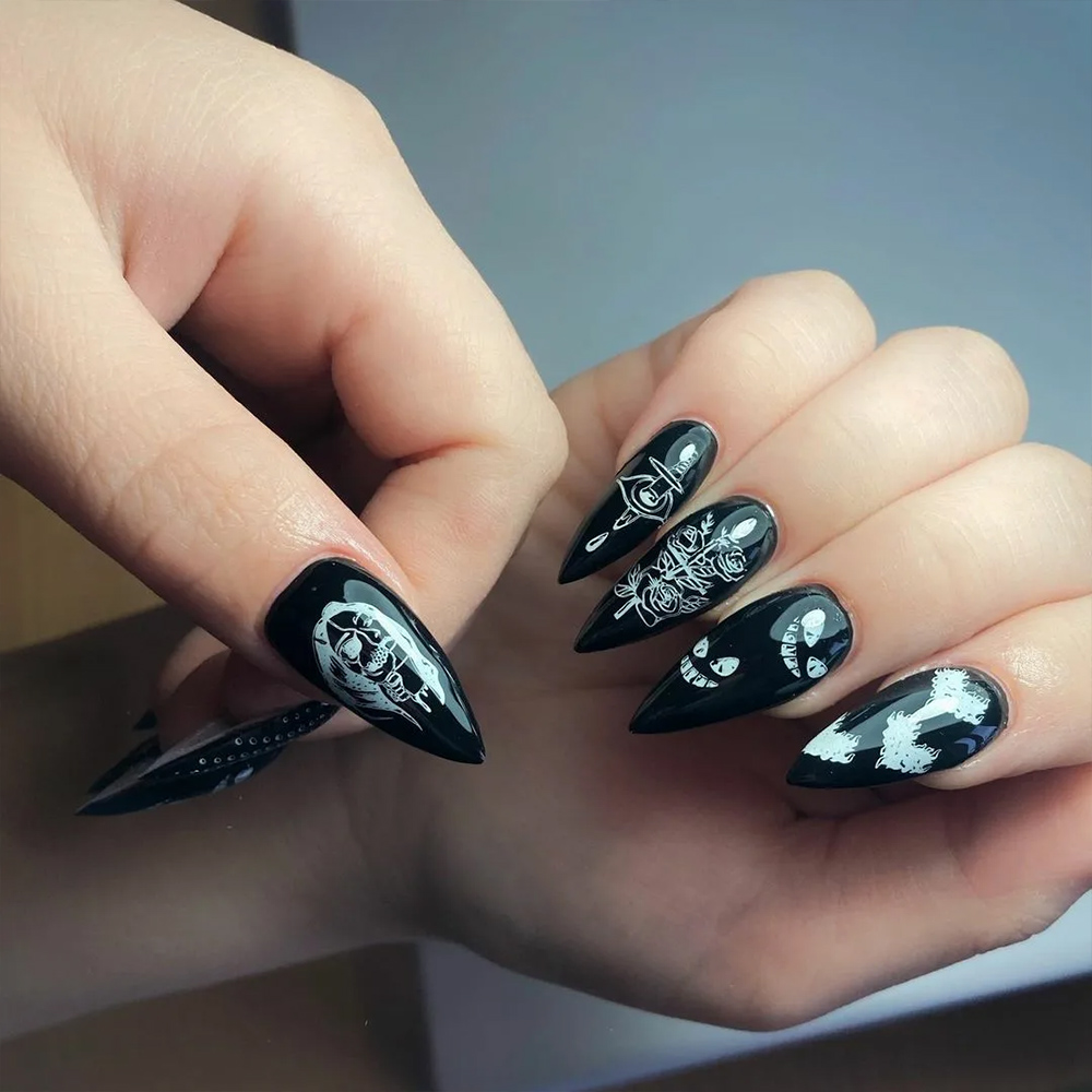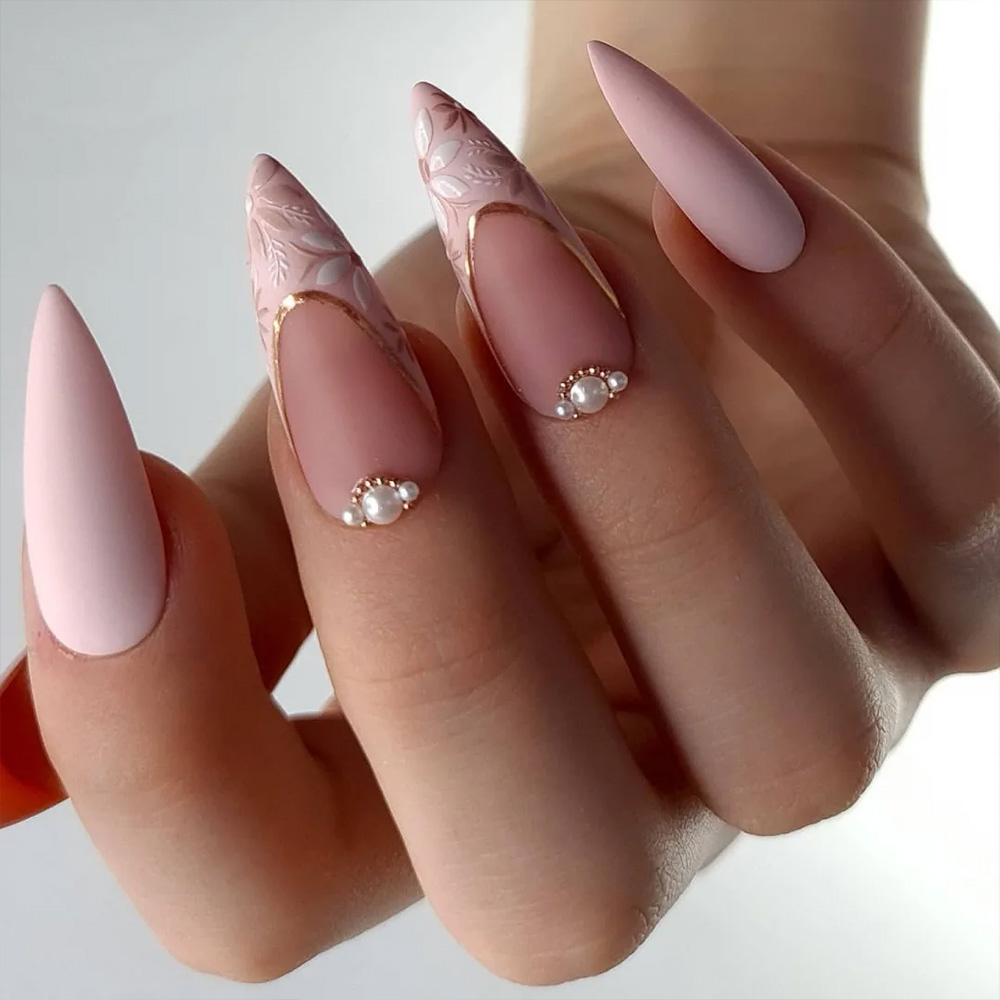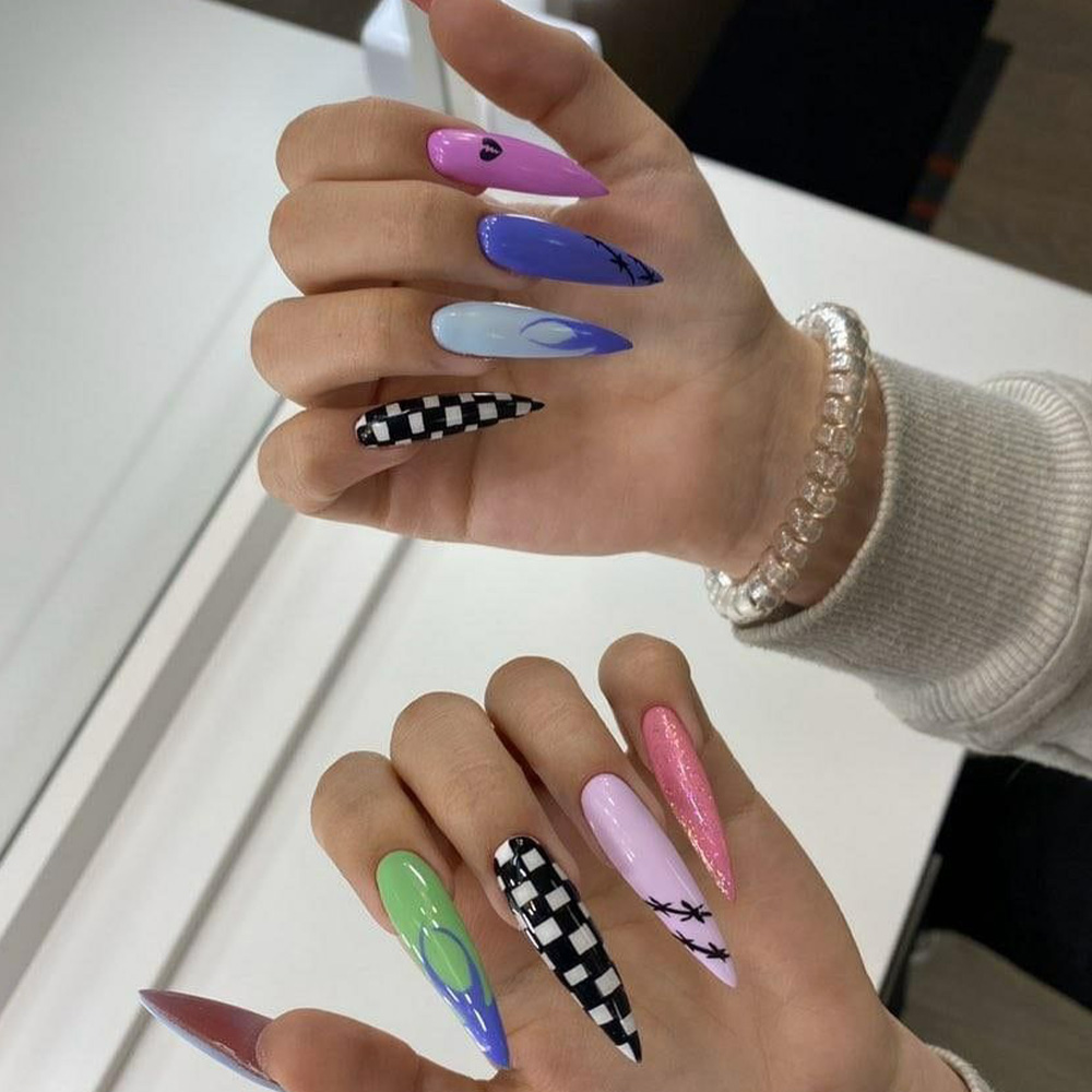 | Заостренная | Схожа с миндалевидной, но требует осторожности с яркими цветами, т.к. форма привлекает внимание сама по себе. На ней отлично будут смотреться графика, нюдовые, матовые оттенки. Если вам хочется добавить больше «праздника», то на помощь придут стразы и камни. Их можно расположить у начала роста ногтя вдоль кутикулы или повторить линию белой лунки (обратной дугой).Единственный минус — на заостренных ногтях любые элементы дизайна лучше размещать ближе к началу ногтевой пластины, а не на свободной части. У края ногтя высокая вероятность того, что весь декор отвалится.На заостренной форме будет отлично смотреться градиент, втирка и «кошачий глаз». Не бойтесь переборщить с узорами и росписью тонкой кистью, они прекрасно вписываются в эту форму. |