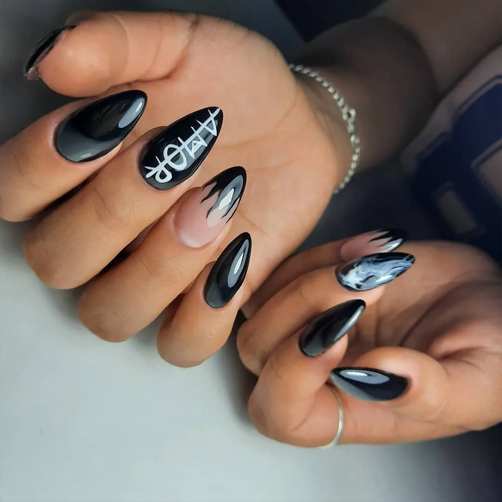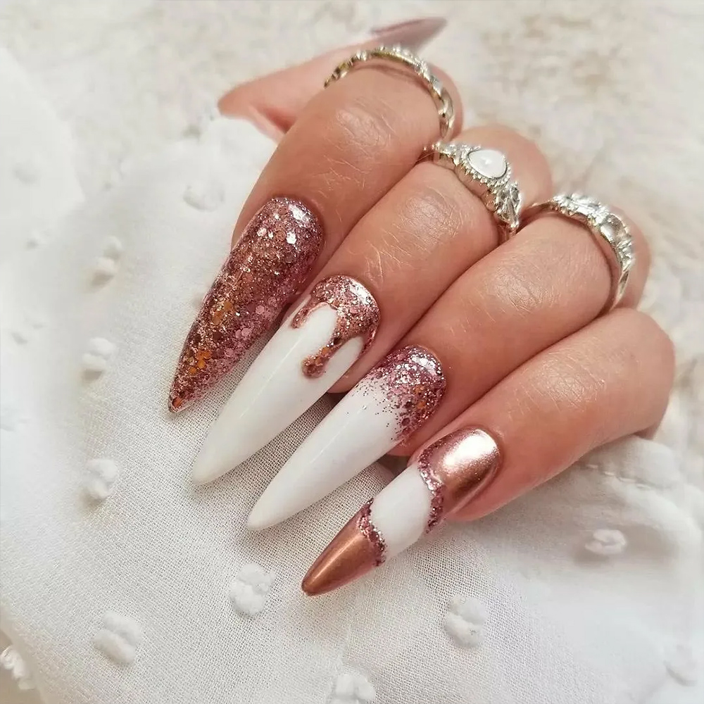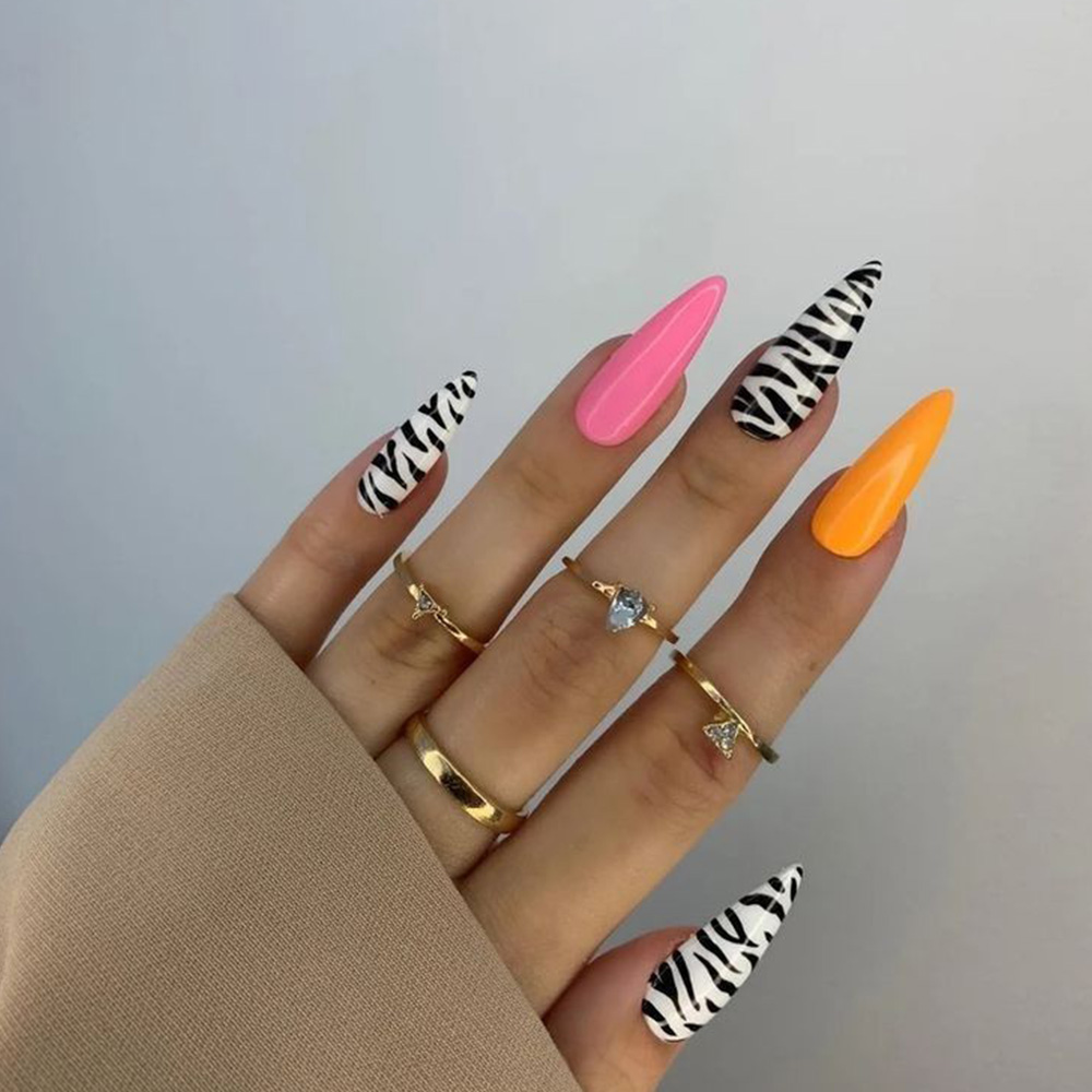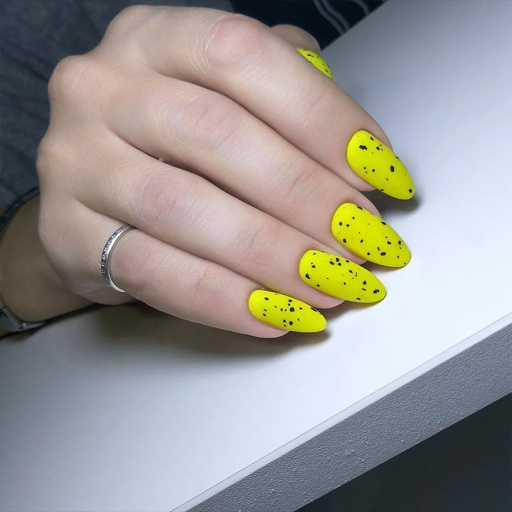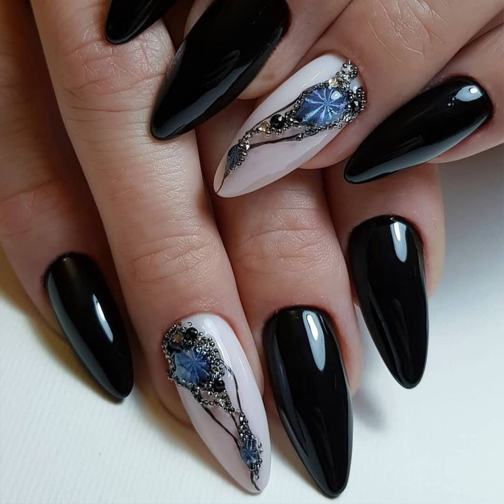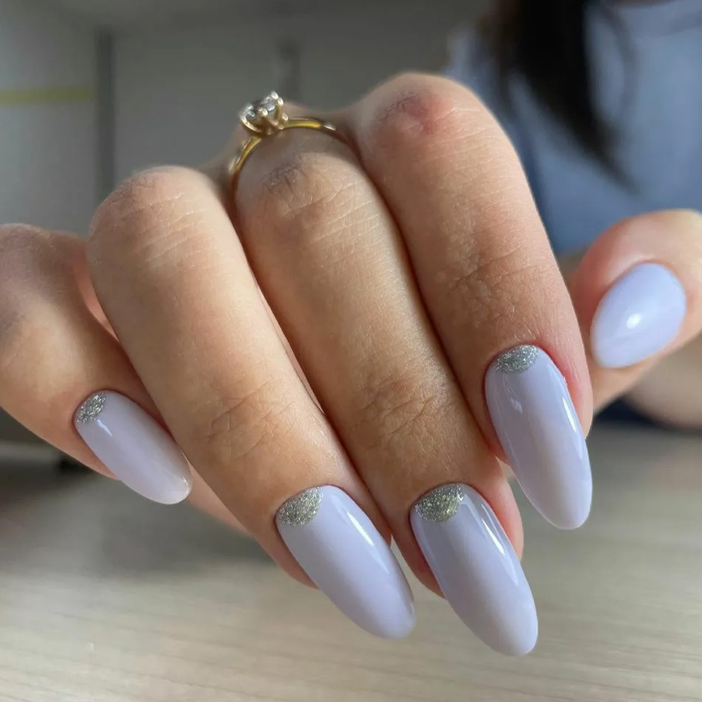 | Заостренная | Схожа с миндалевидной, но требует осторожности с яркими цветами, т.к. форма привлекает внимание сама по себе. На ней отлично будут смотреться графика, нюдовые, матовые оттенки. Если вам хочется добавить больше «праздника», то на помощь придут стразы и камни. Их можно расположить у начала роста ногтя вдоль кутикулы или повторить линию белой лунки (обратной дугой).Единственный минус — на заостренных ногтях любые элементы дизайна лучше размещать ближе к началу ногтевой пластины, а не на свободной части. У края ногтя высокая вероятность того, что весь декор отвалится.На заостренной форме будет отлично смотреться градиент, втирка и «кошачий глаз». Не бойтесь переборщить с узорами и росписью тонкой кистью, они прекрасно вписываются в эту форму. |