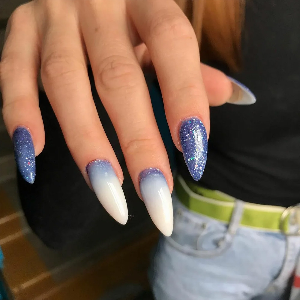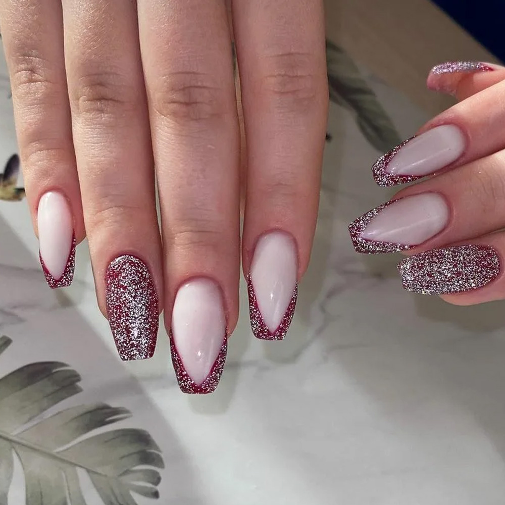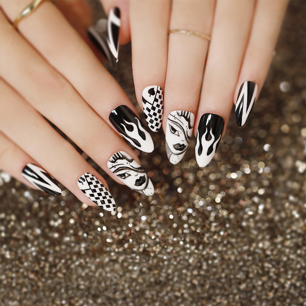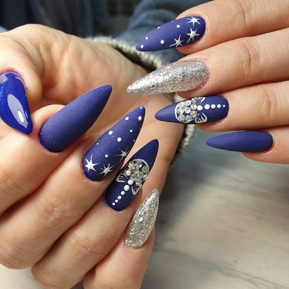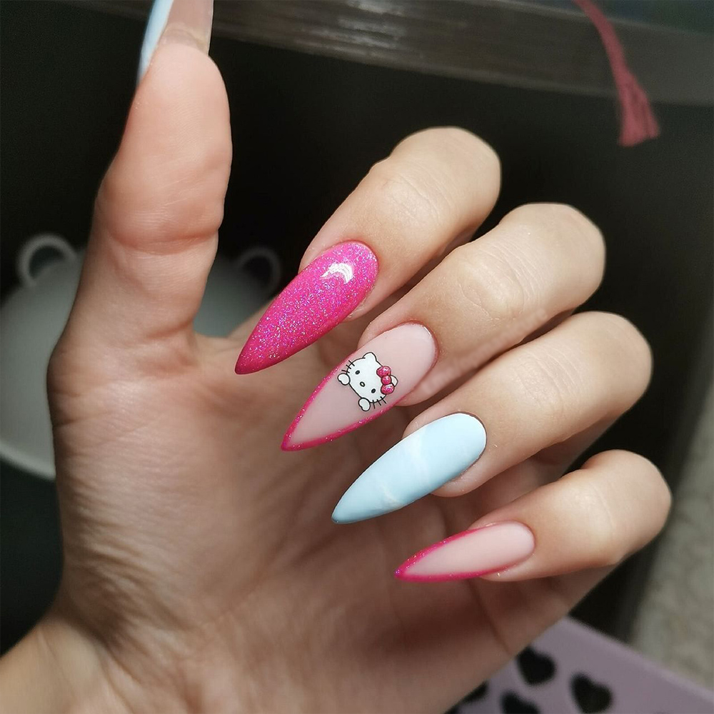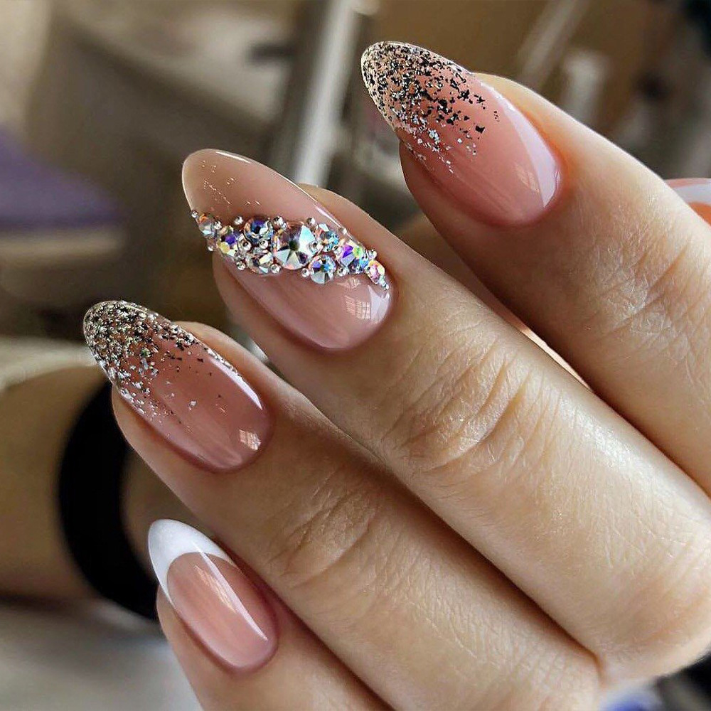 | Заостренная | Схожа с миндалевидной, но требует осторожности с яркими цветами, т.к. форма привлекает внимание сама по себе. На ней отлично будут смотреться графика, нюдовые, матовые оттенки. Если вам хочется добавить больше «праздника», то на помощь придут стразы и камни. Их можно расположить у начала роста ногтя вдоль кутикулы или повторить линию белой лунки (обратной дугой).Единственный минус — на заостренных ногтях любые элементы дизайна лучше размещать ближе к началу ногтевой пластины, а не на свободной части. У края ногтя высокая вероятность того, что весь декор отвалится.На заостренной форме будет отлично смотреться градиент, втирка и «кошачий глаз». Не бойтесь переборщить с узорами и росписью тонкой кистью, они прекрасно вписываются в эту форму. |