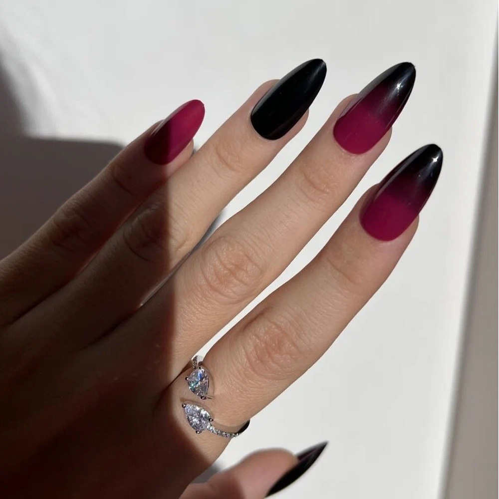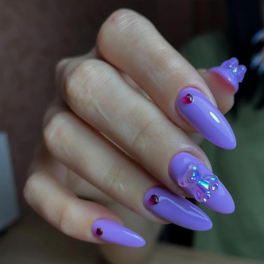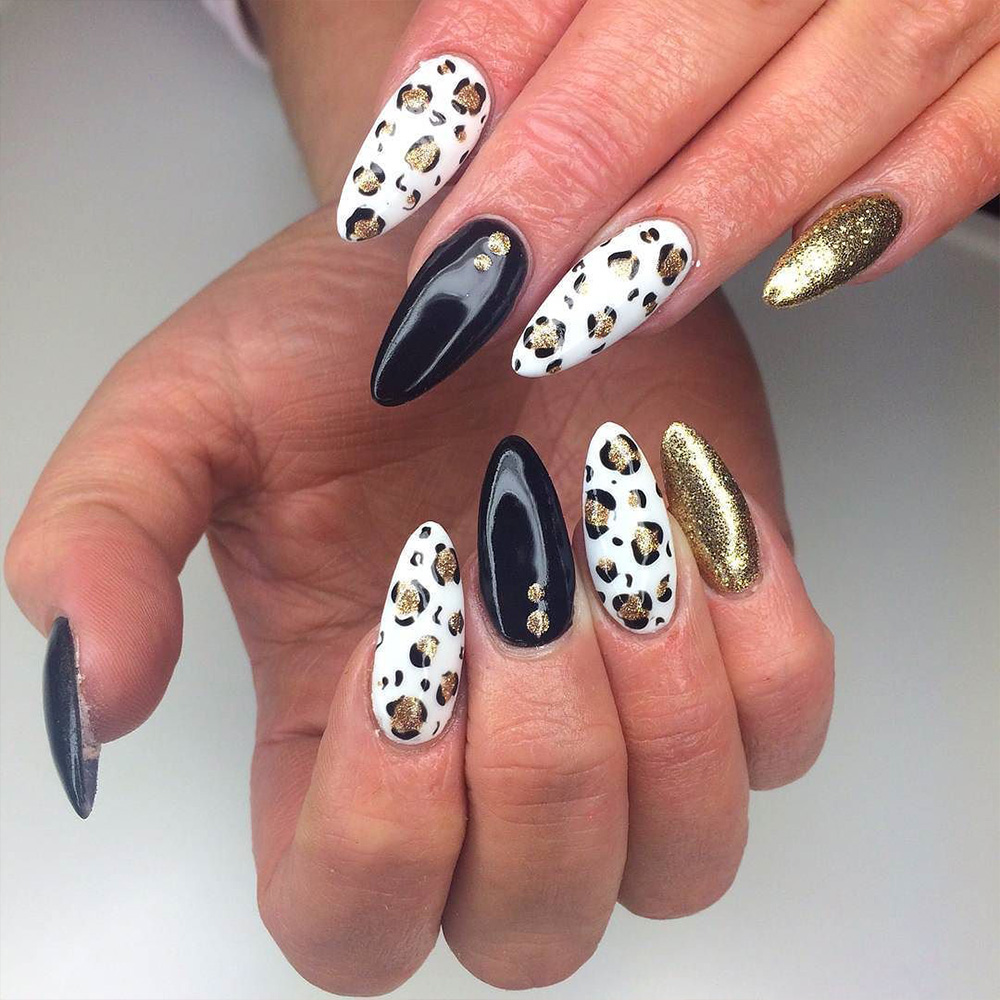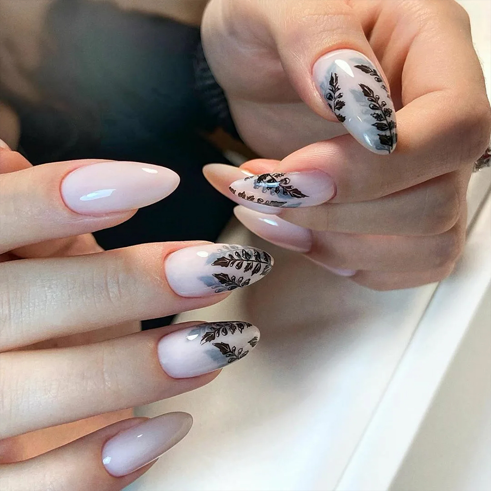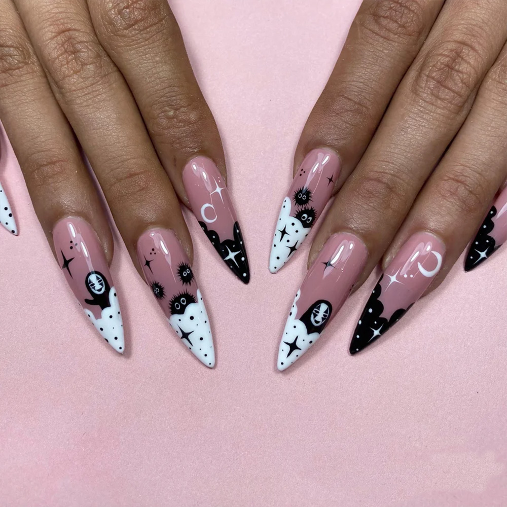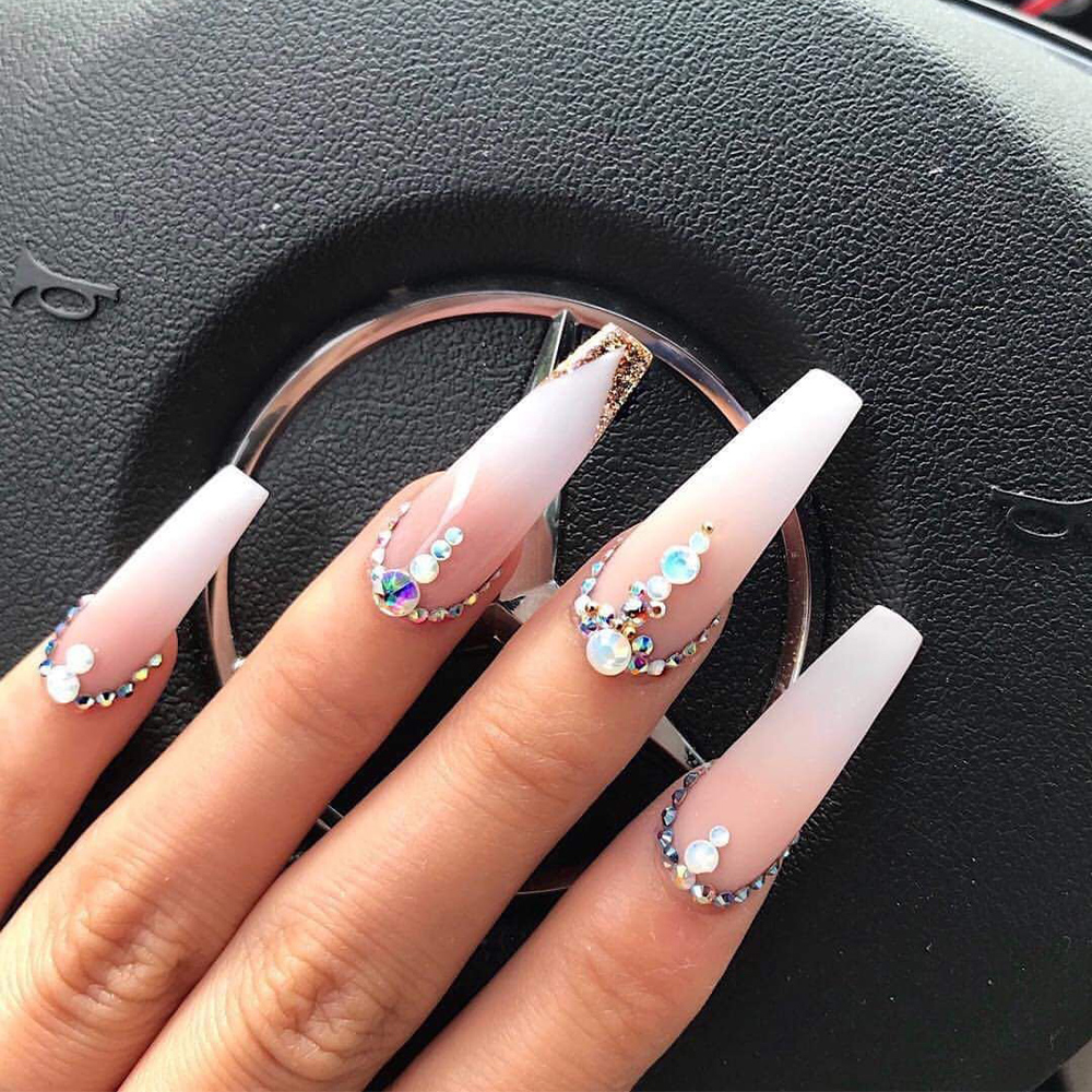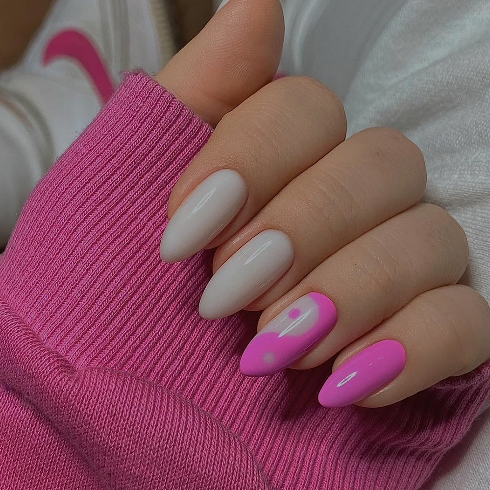 | Заостренная | Схожа с миндалевидной, но требует осторожности с яркими цветами, т.к. форма привлекает внимание сама по себе. На ней отлично будут смотреться графика, нюдовые, матовые оттенки. Если вам хочется добавить больше «праздника», то на помощь придут стразы и камни. Их можно расположить у начала роста ногтя вдоль кутикулы или повторить линию белой лунки (обратной дугой).Единственный минус — на заостренных ногтях любые элементы дизайна лучше размещать ближе к началу ногтевой пластины, а не на свободной части. У края ногтя высокая вероятность того, что весь декор отвалится.На заостренной форме будет отлично смотреться градиент, втирка и «кошачий глаз». Не бойтесь переборщить с узорами и росписью тонкой кистью, они прекрасно вписываются в эту форму. |