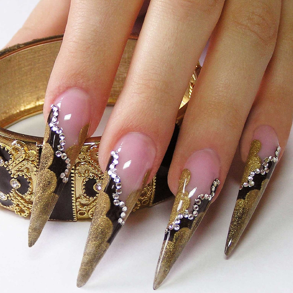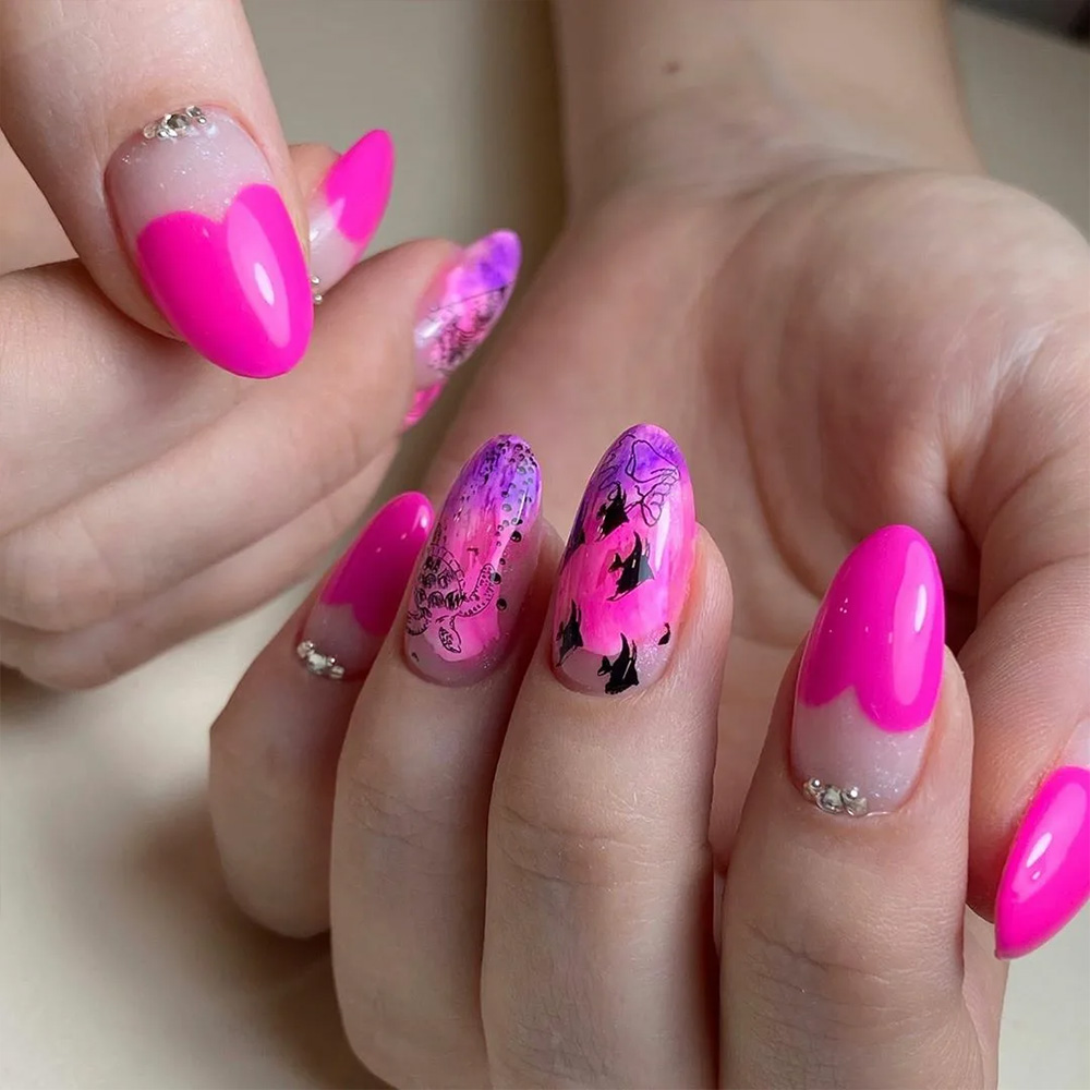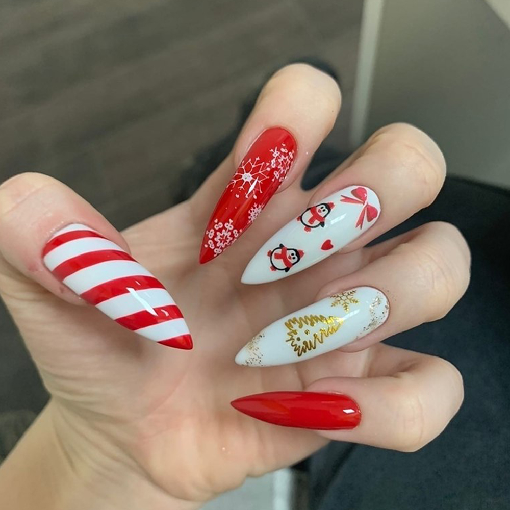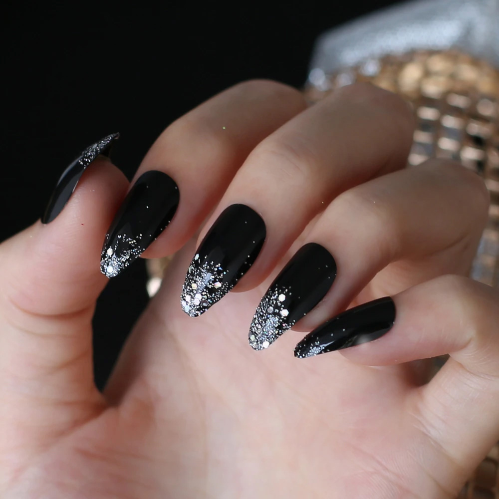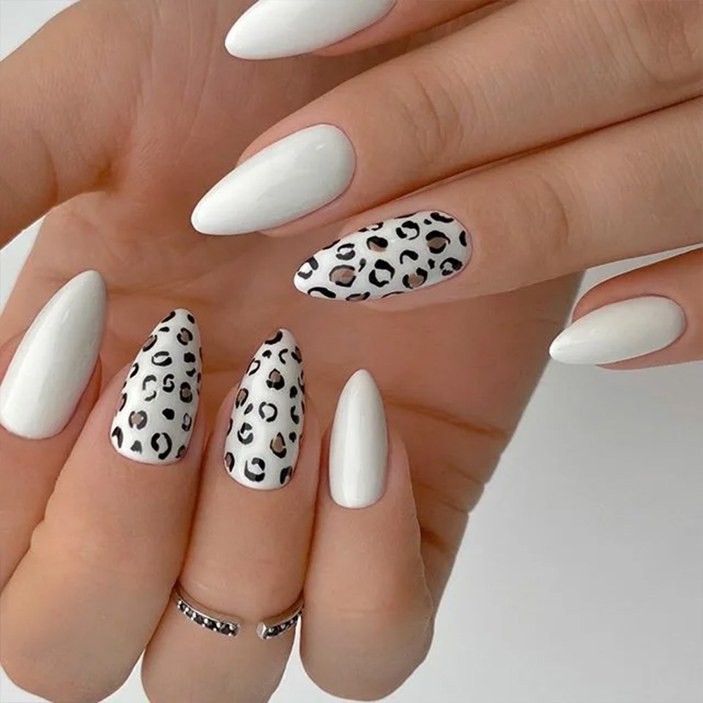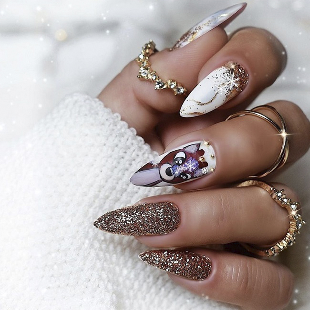 | Заостренная | Схожа с миндалевидной, но требует осторожности с яркими цветами, т.к. форма привлекает внимание сама по себе. На ней отлично будут смотреться графика, нюдовые, матовые оттенки. Если вам хочется добавить больше «праздника», то на помощь придут стразы и камни. Их можно расположить у начала роста ногтя вдоль кутикулы или повторить линию белой лунки (обратной дугой).Единственный минус — на заостренных ногтях любые элементы дизайна лучше размещать ближе к началу ногтевой пластины, а не на свободной части. У края ногтя высокая вероятность того, что весь декор отвалится.На заостренной форме будет отлично смотреться градиент, втирка и «кошачий глаз». Не бойтесь переборщить с узорами и росписью тонкой кистью, они прекрасно вписываются в эту форму. |