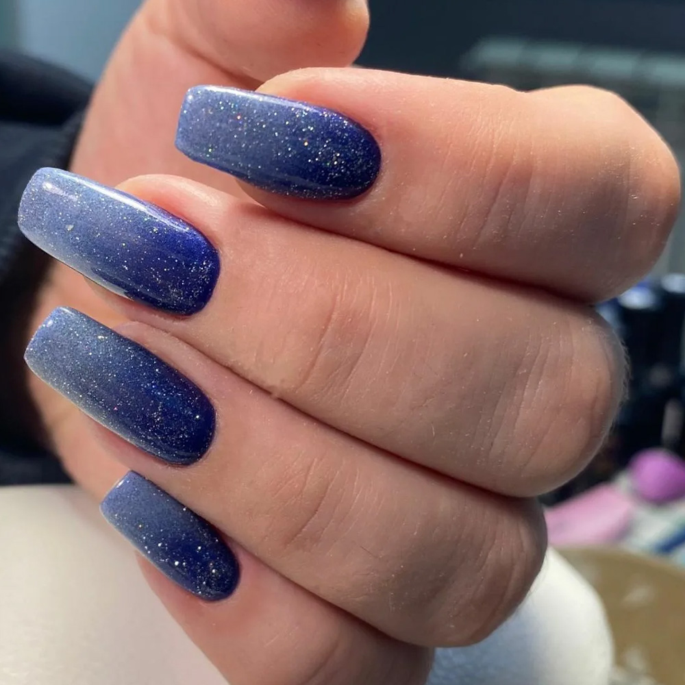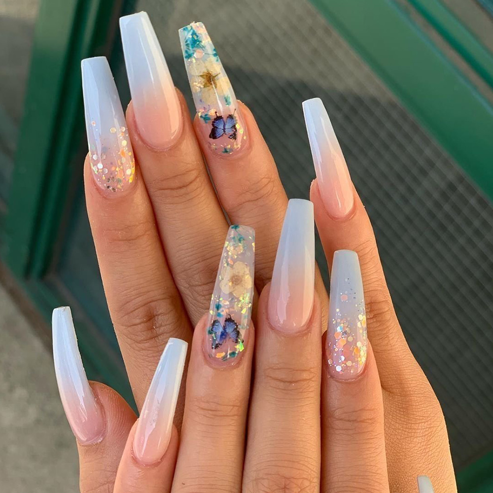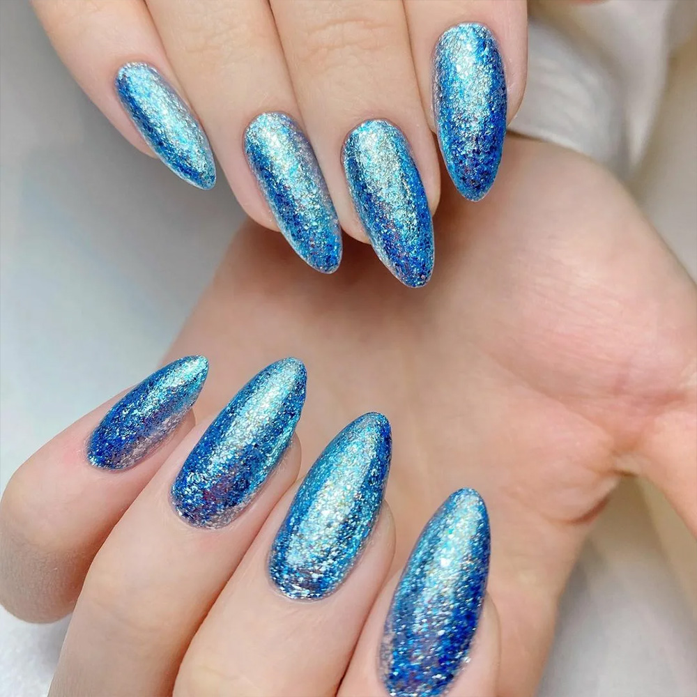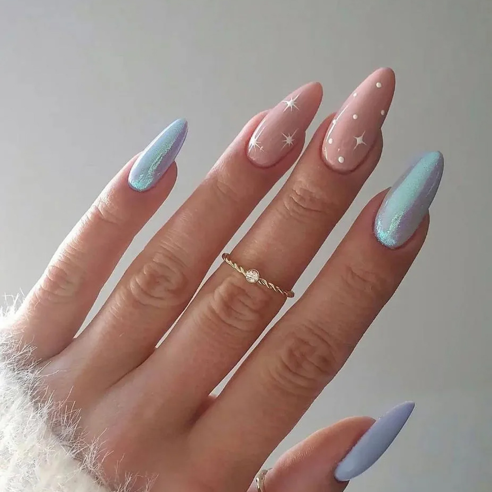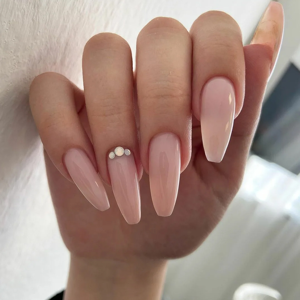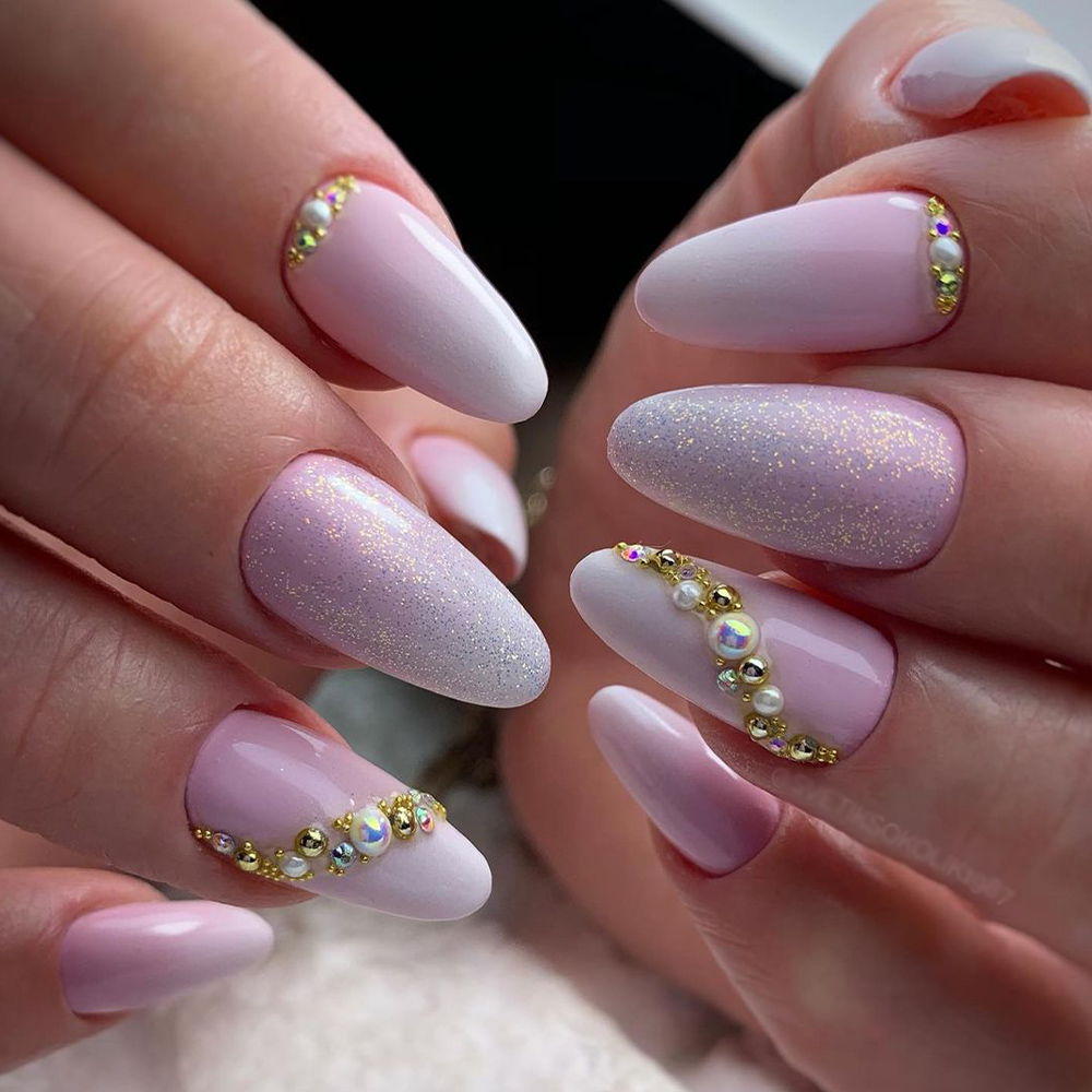 Гель-лак с шиммером в светлых цветах делает маникюр на длинные ногти особенно нежным. Блестящие частички красиво переливаются на солнце и зрительно удлиняют пальчики.
