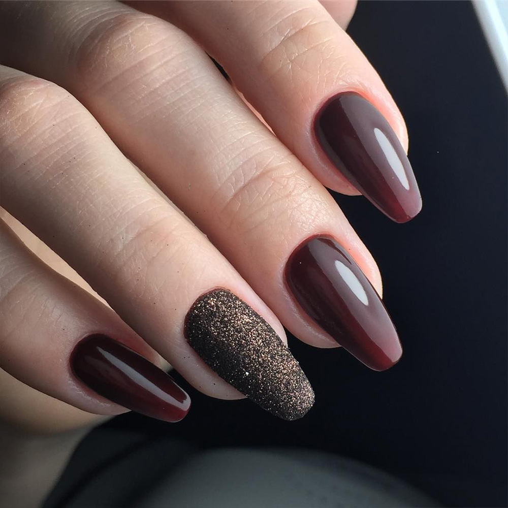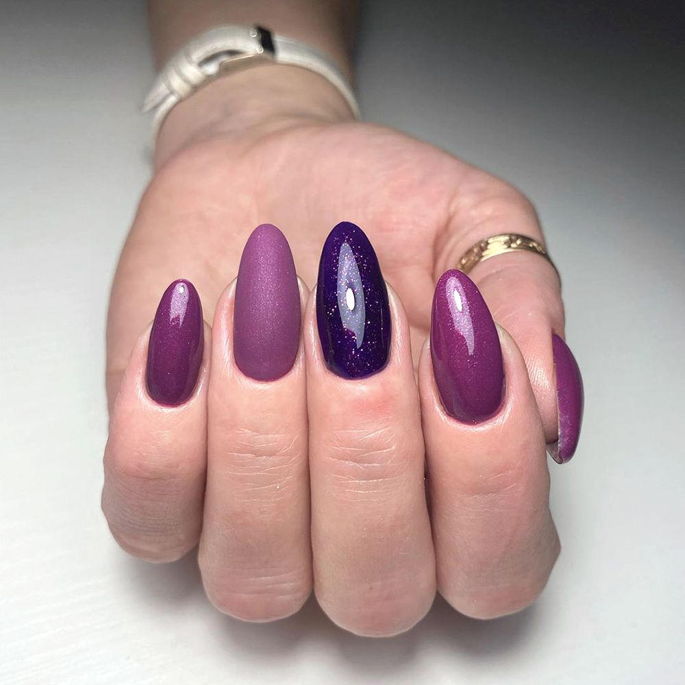Песочное покрытие идеально сочетается с матовыми цветами. Вы можете сделать такими несколько ногтей или только их часть, разделив границу блестящей полоской.