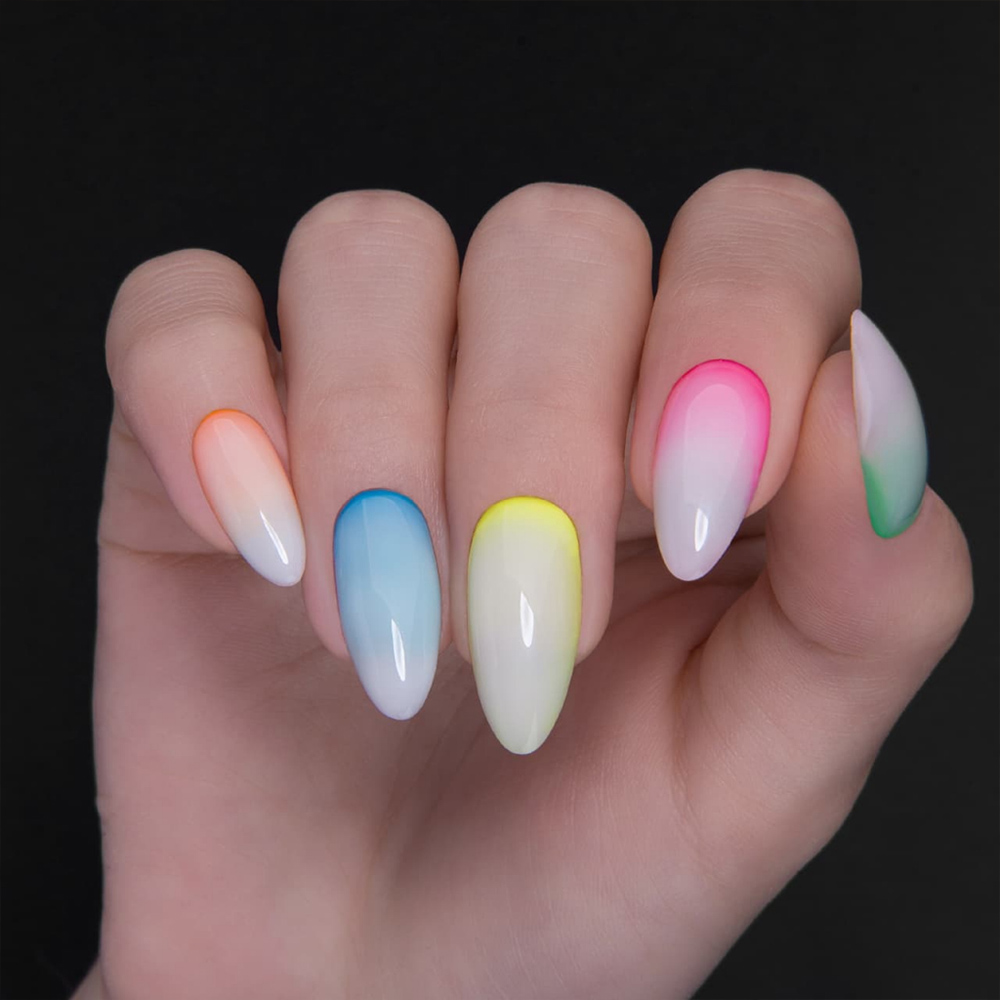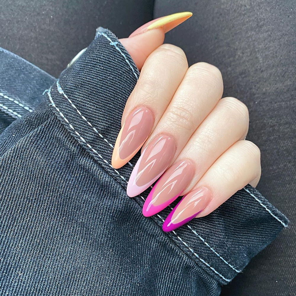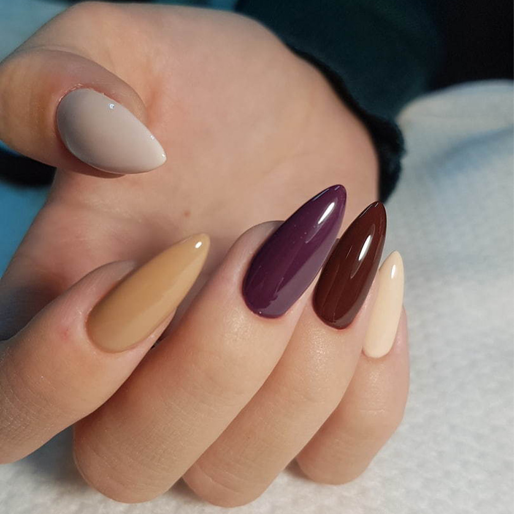 Весной и летом особенно популярен такой вид маникюра, ведь он отлично поднимает настроение. Каждый пальчик разного цвета или только на 1-ой руке, а на 2-ой тот же порядок. Главное в таком варианте выбирать цвета из одной палитры (теплые или холодные, светлые или темные т.п.). Такой маникюр на длинные ногти будет отлично смотреться на отдыхе и летом.