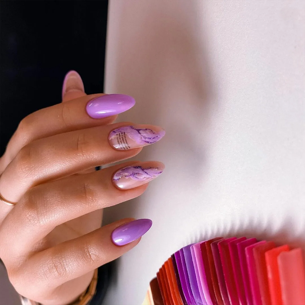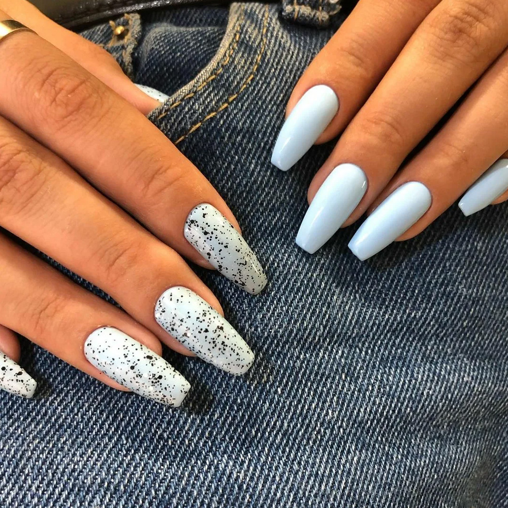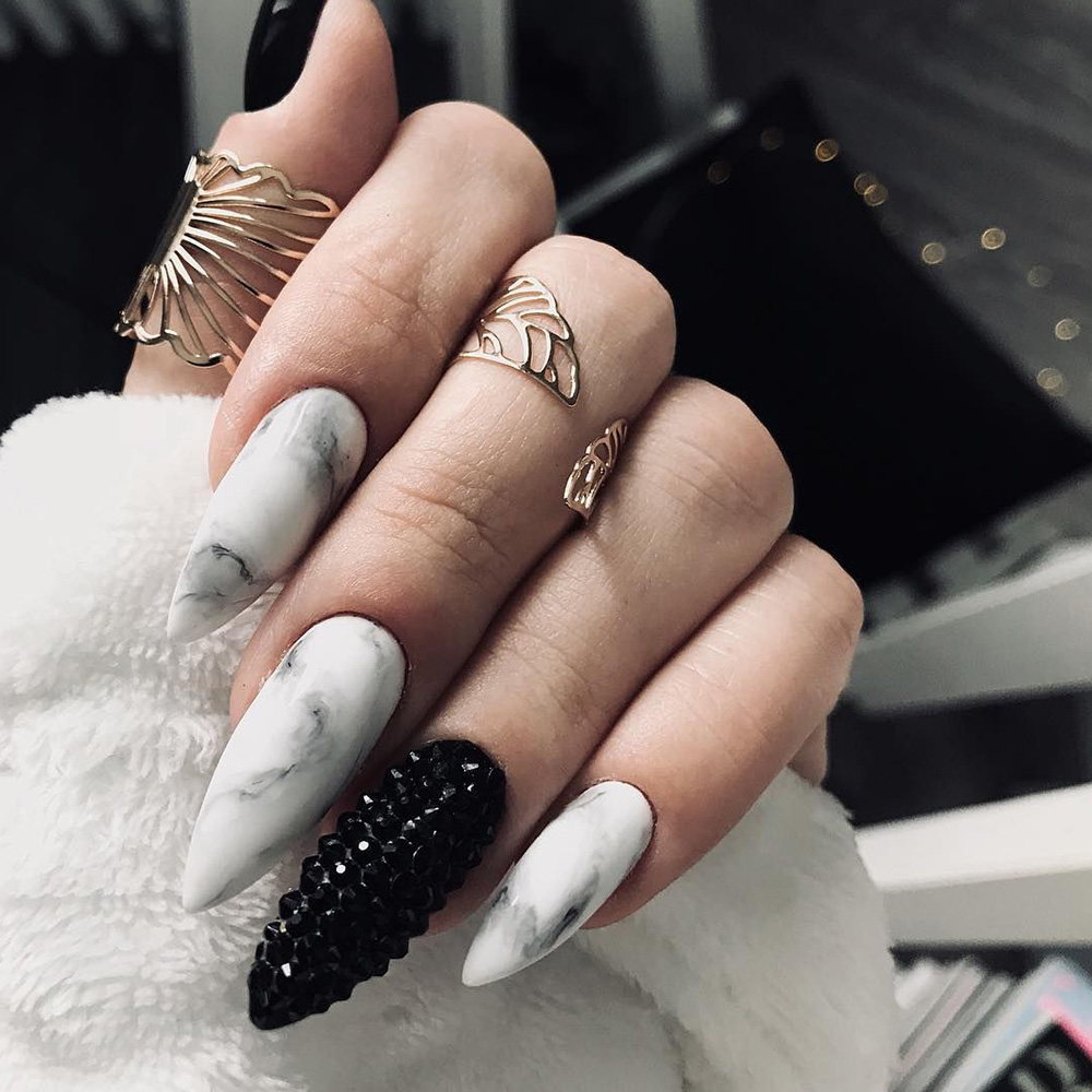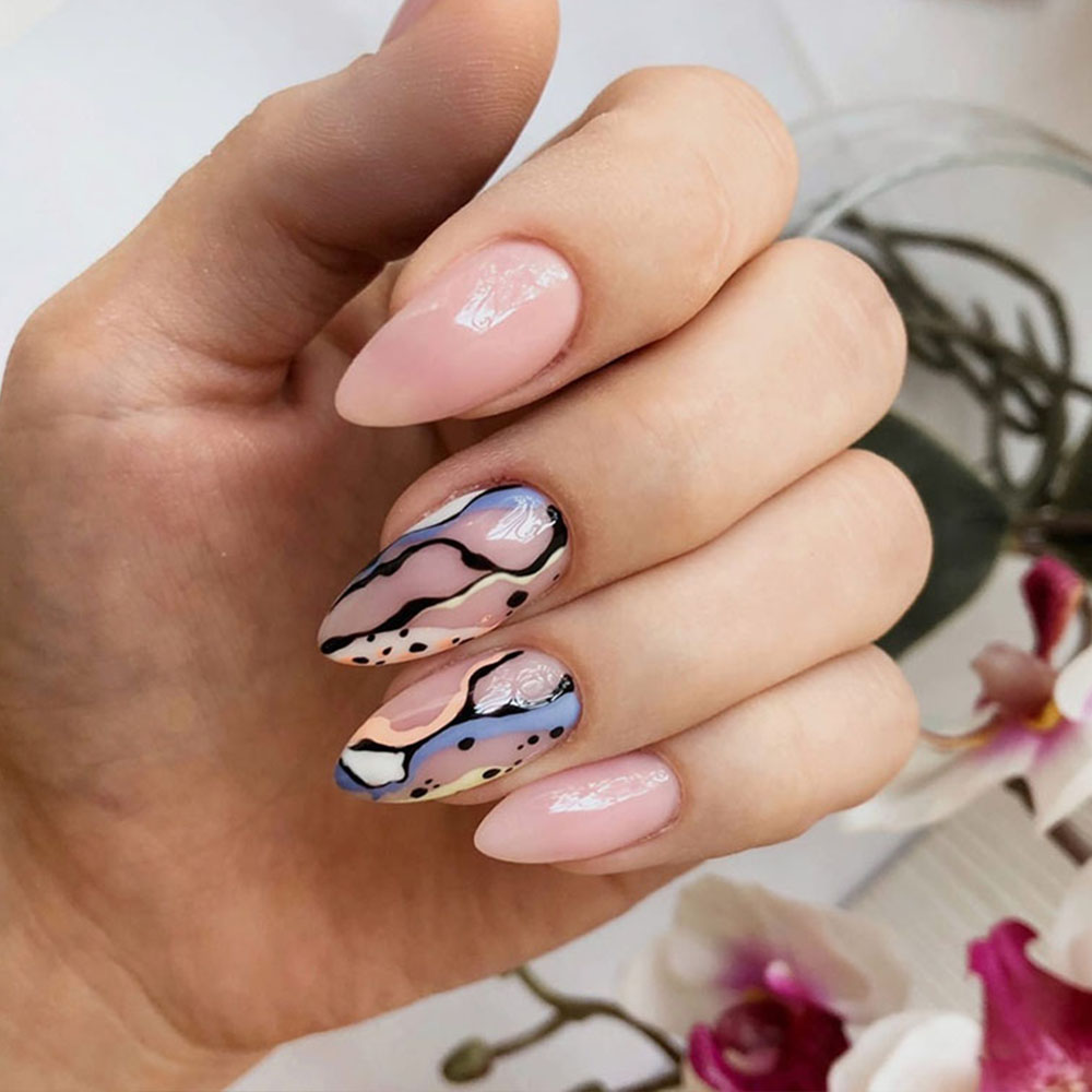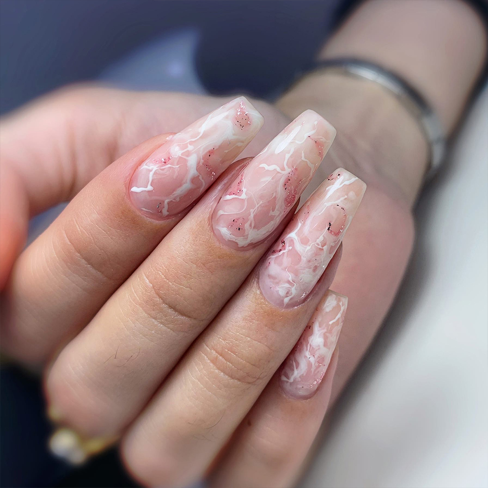 Дизайн с мраморной крошкой нейл-мастера создают с помощью специального лака или вкраплений, которые добавляют в покрытие. Мраморные разводы можно оставить на нескольких ногтях или только на их части. Они хорошо смотрятся на любой форме ногтей и сочетаются с абсолютно разными цветами.
