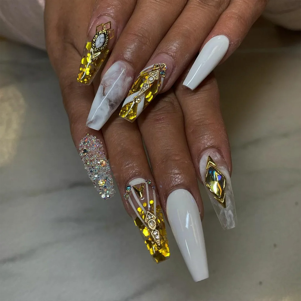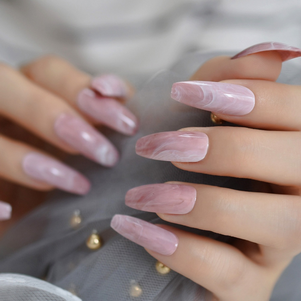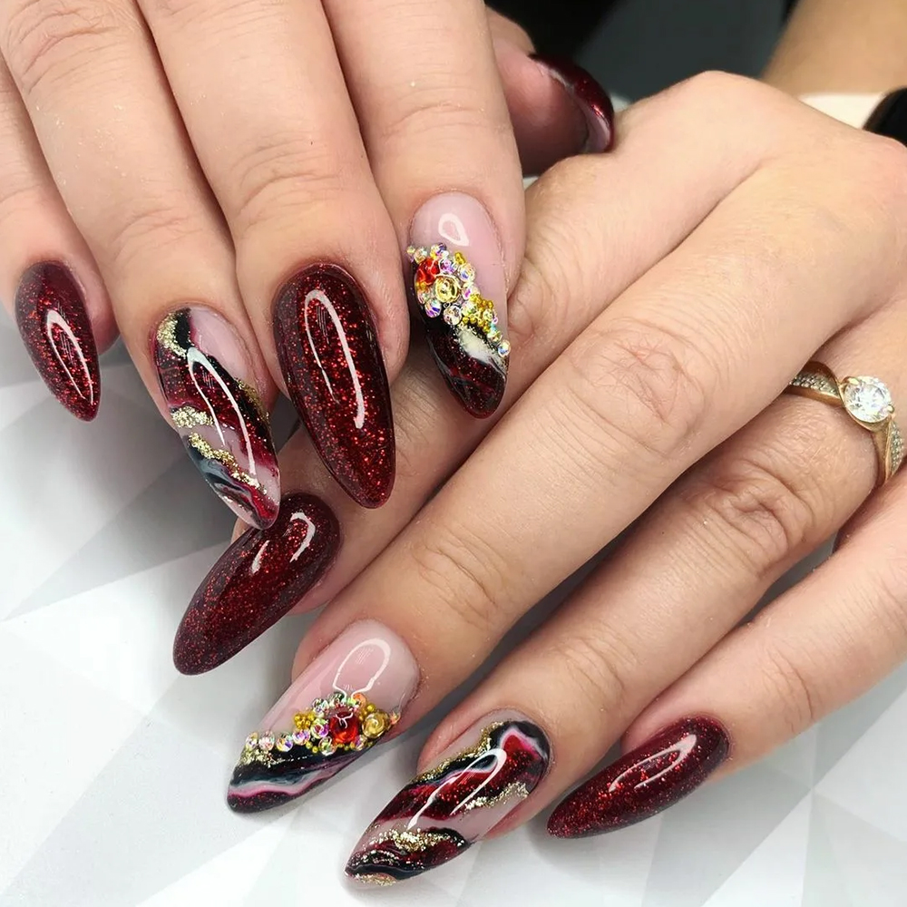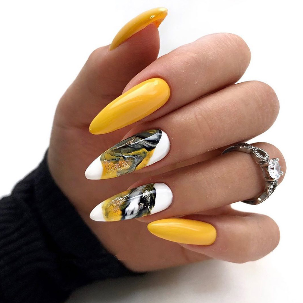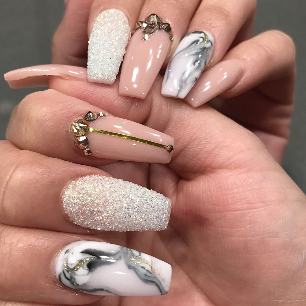 Дизайн с мраморной крошкой нейл-мастера создают с помощью специального лака или вкраплений, которые добавляют в покрытие. Мраморные разводы можно оставить на нескольких ногтях или только на их части. Они хорошо смотрятся на любой форме ногтей и сочетаются с абсолютно разными цветами.