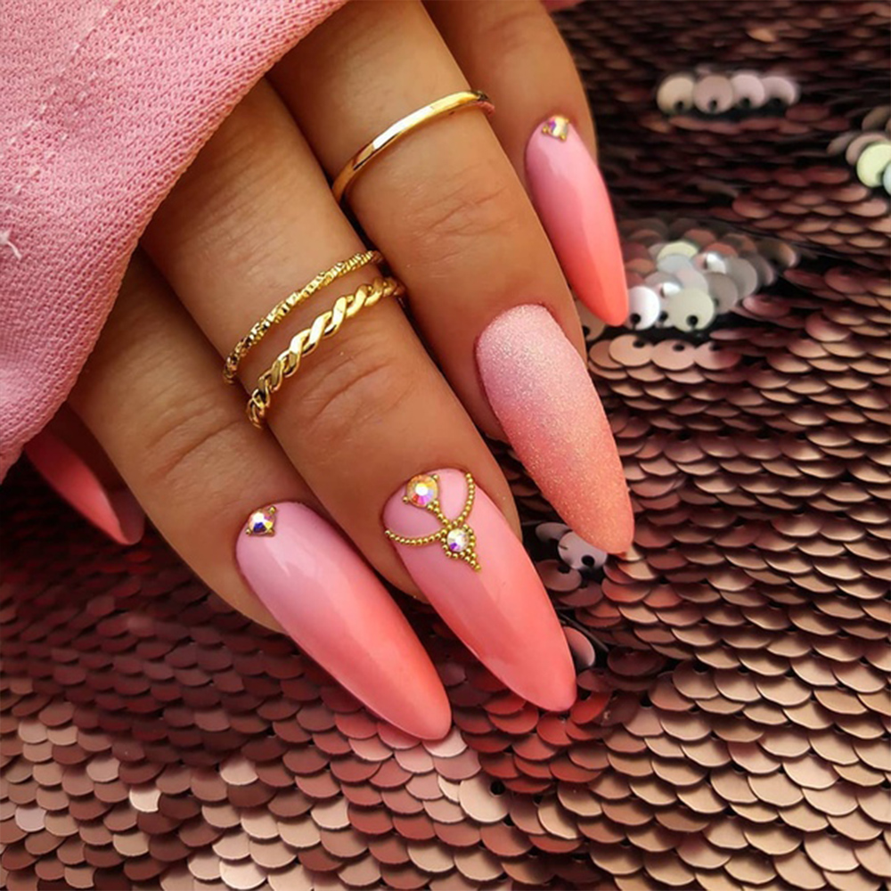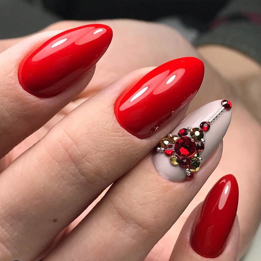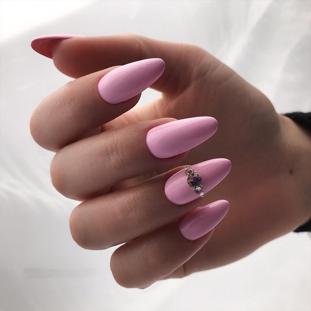 - Миндалевидная форма — одна из самых популярных уже несколько лет. Она похожа на заостренную, но свободный край ногтей не такой острый. Миндалевидные ноготки выглядят элегантно, делают руки очень нежными и женственными. Миндаль не такой «капризный» как заостренная форма, но тоже требует к себе бережного отношения.