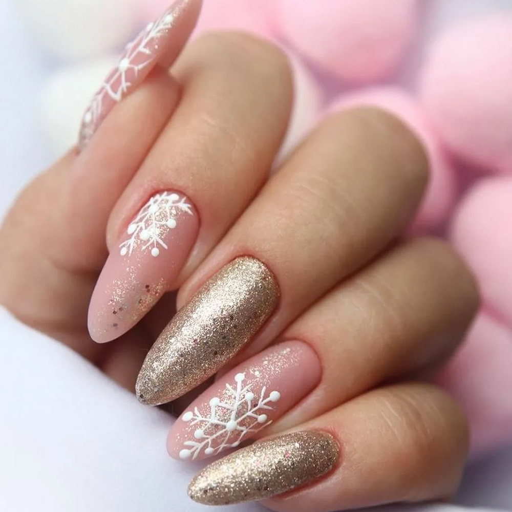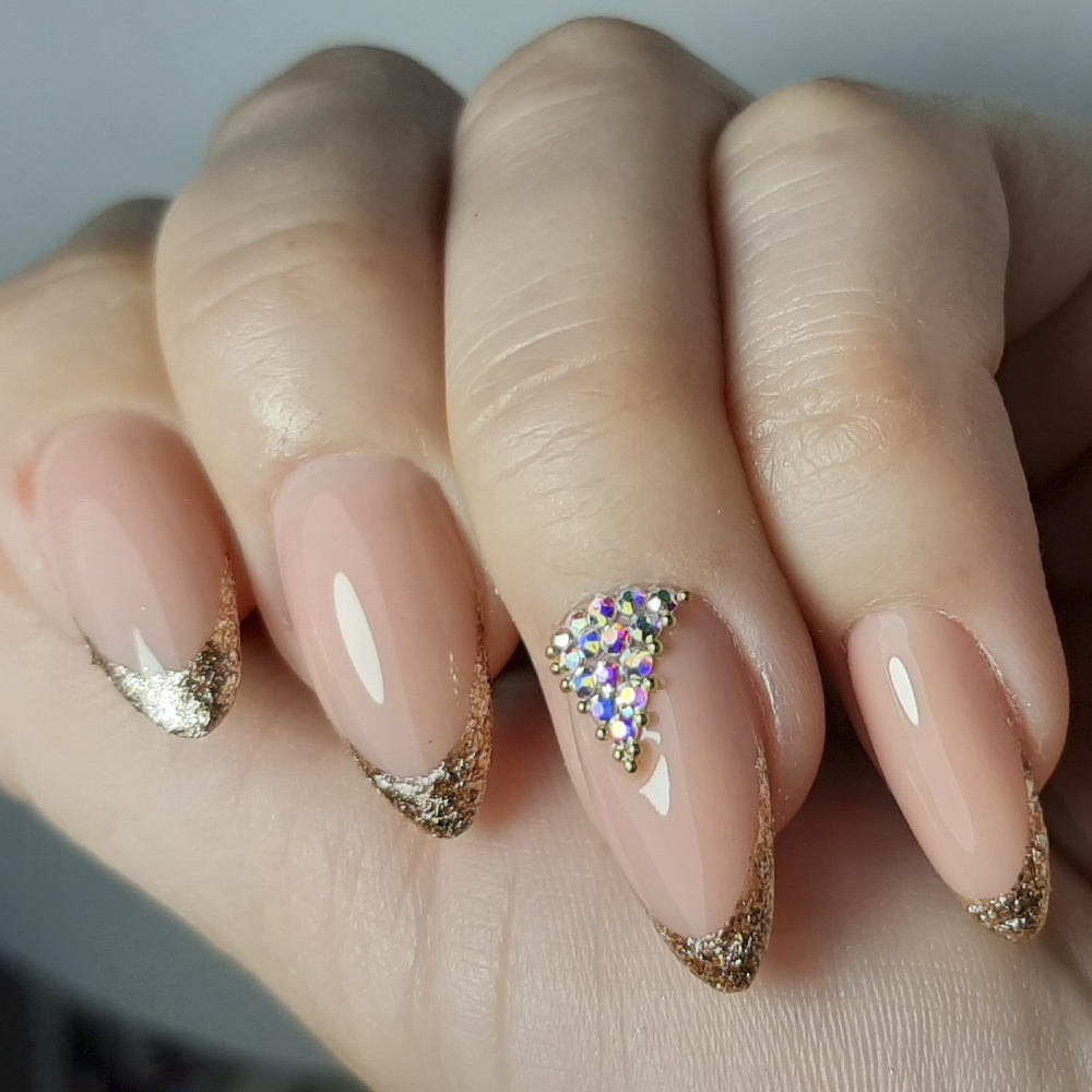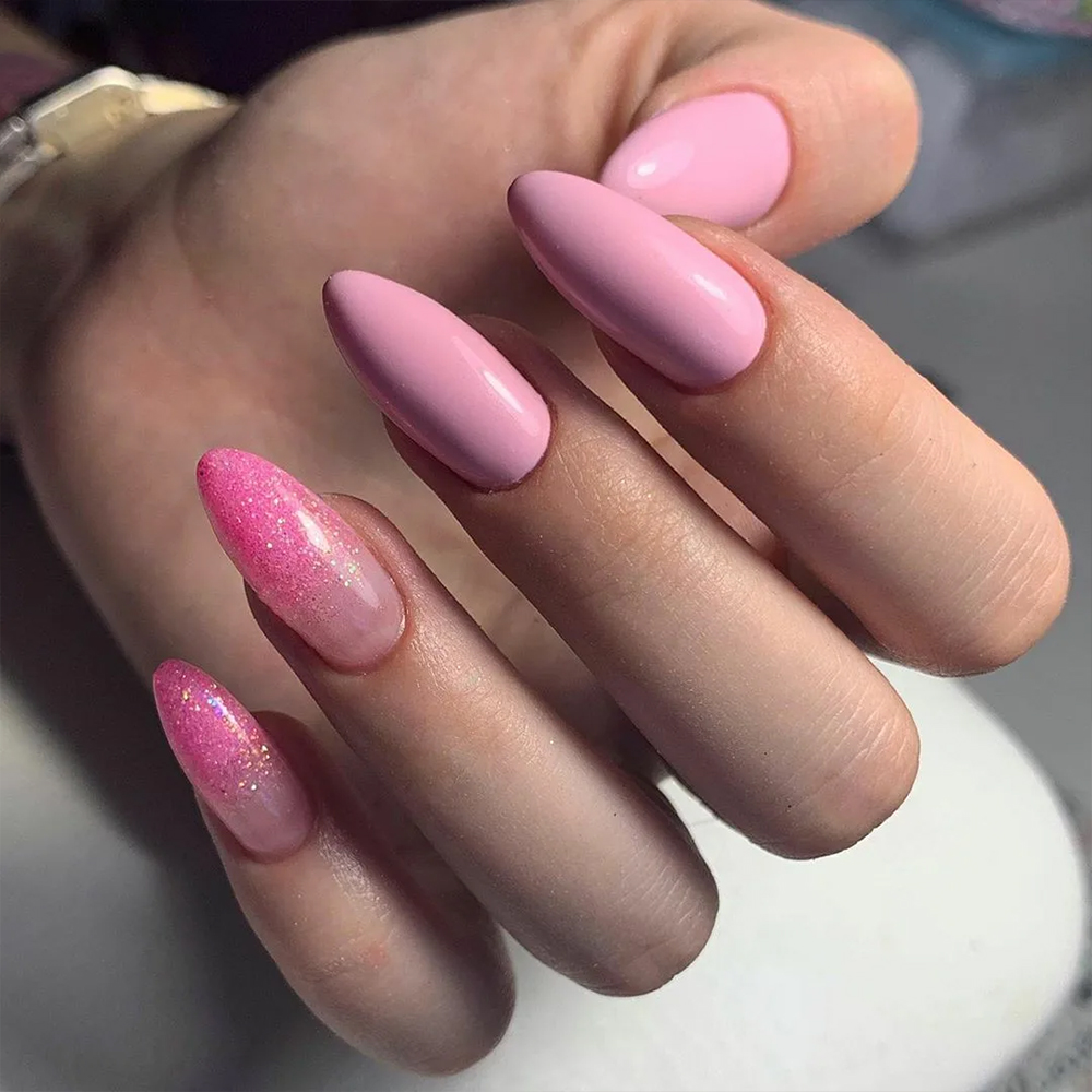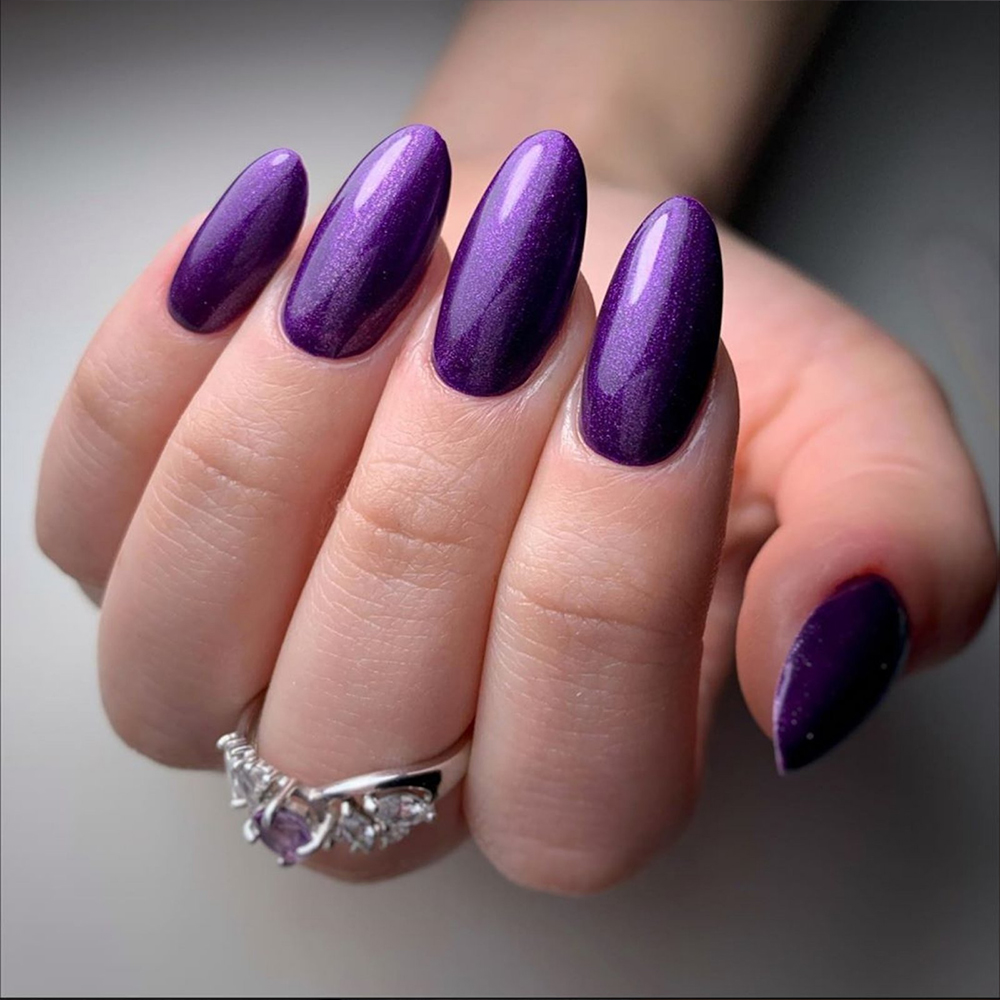 - Миндалевидная форма — одна из самых популярных уже несколько лет. Она похожа на заостренную, но свободный край ногтей не такой острый. Миндалевидные ноготки выглядят элегантно, делают руки очень нежными и женственными. Миндаль не такой «капризный» как заостренная форма, но тоже требует к себе бережного отношения.