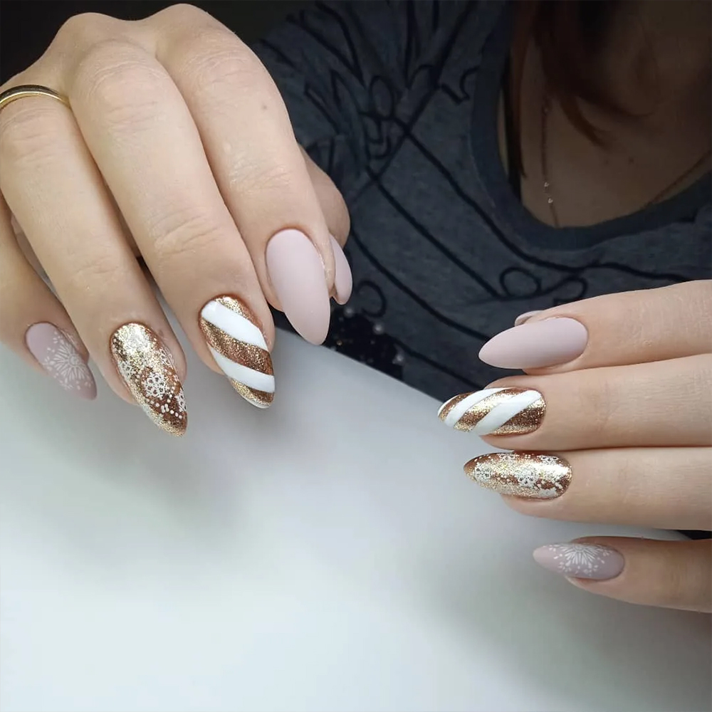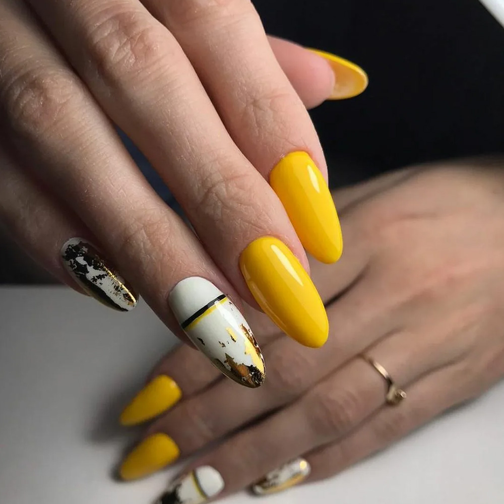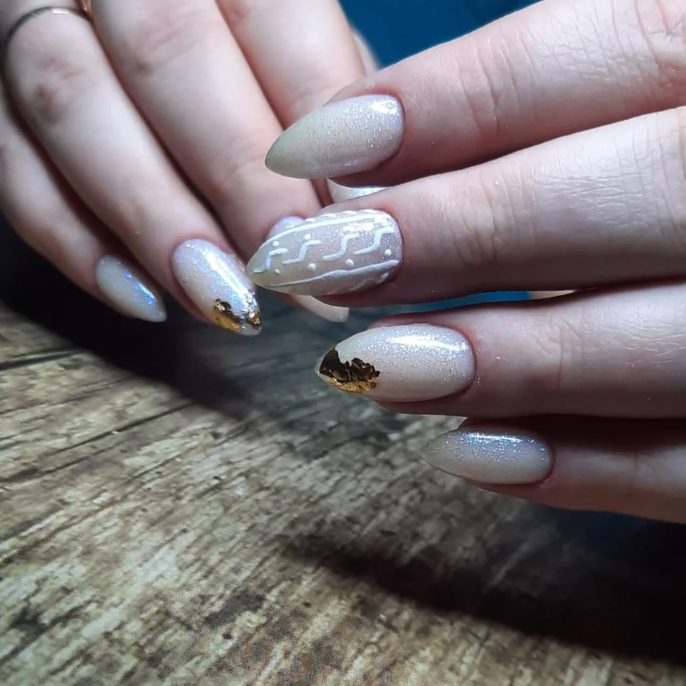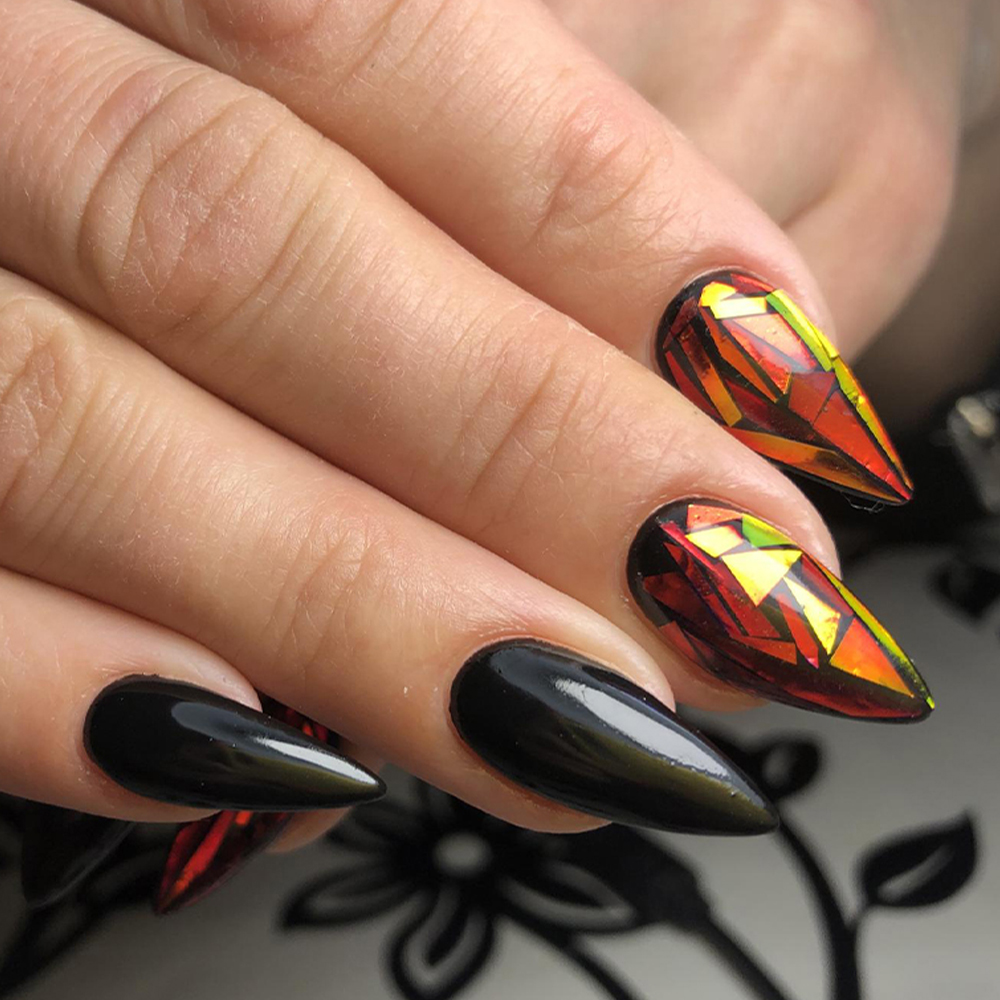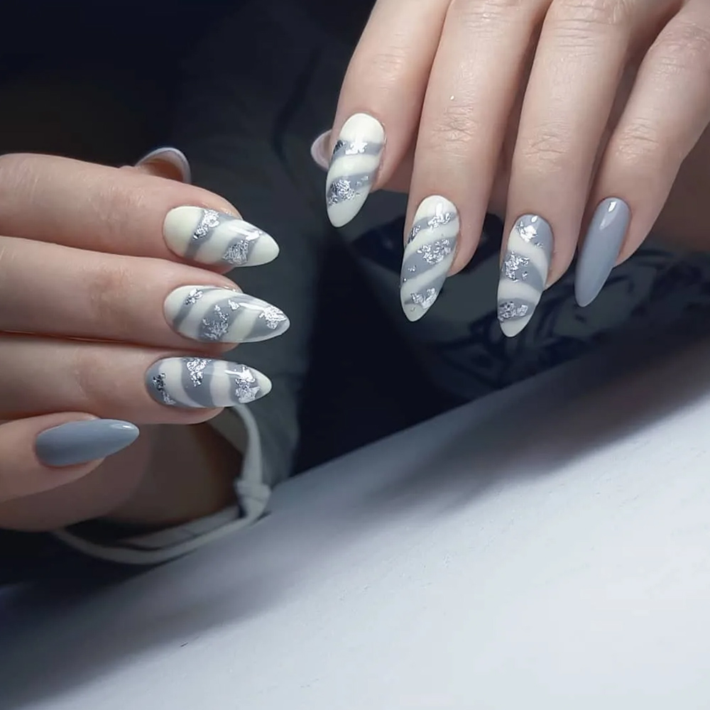 Отпечатки фольги или её кусочки оставляют на базовом покрытии, а сверху закрепляют топом. Фольгу можно комбинировать с другими вариантами дизайна и получать стильные рисунки. Например, с геометрическими линиями на миндалевидной форме ногтя или с росписью. С помощью фольги можно делать не только отпечатки, но и разные линии и полоски.