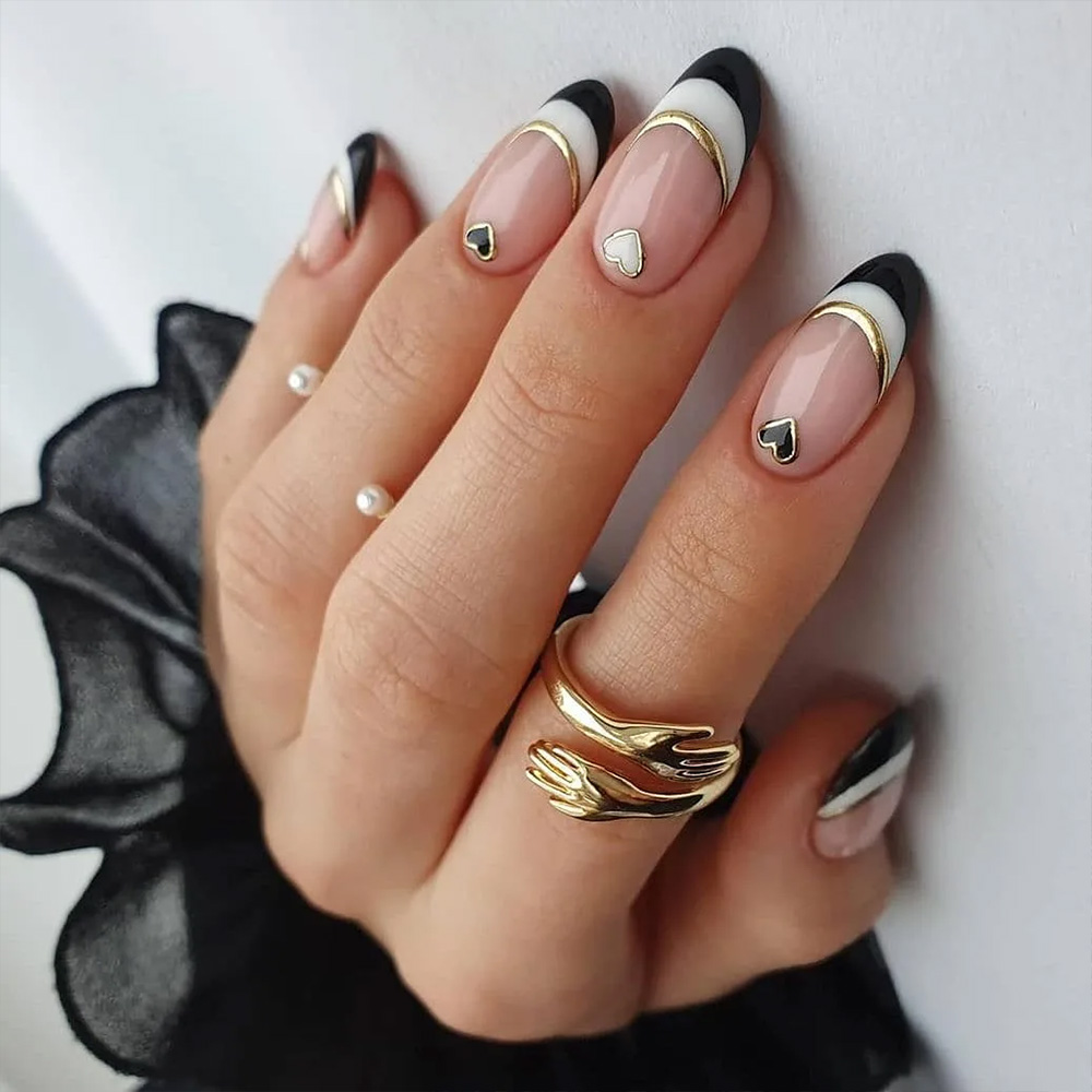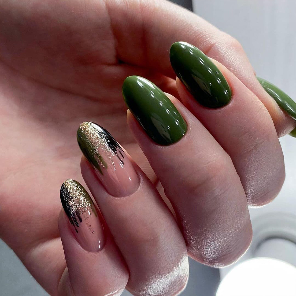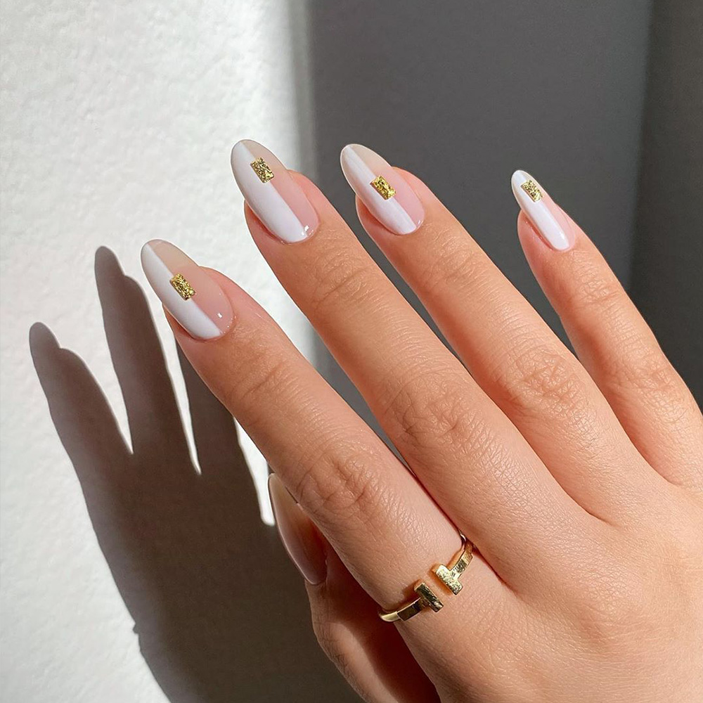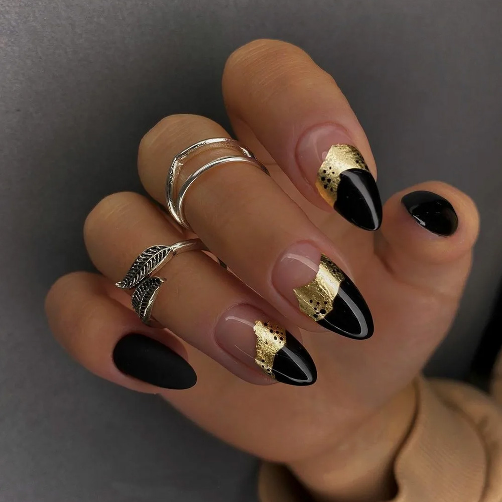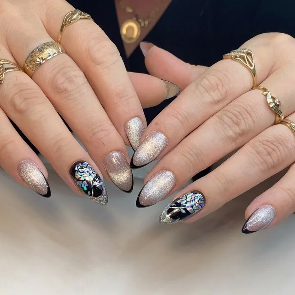 Отпечатки фольги или её кусочки оставляют на базовом покрытии, а сверху закрепляют топом. Фольгу можно комбинировать с другими вариантами дизайна и получать стильные рисунки. Например, с геометрическими линиями на миндалевидной форме ногтя или с росписью. С помощью фольги можно делать не только отпечатки, но и разные линии и полоски.