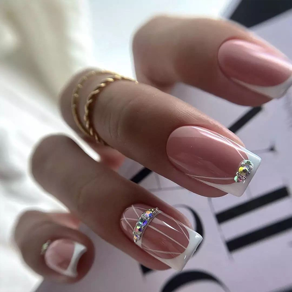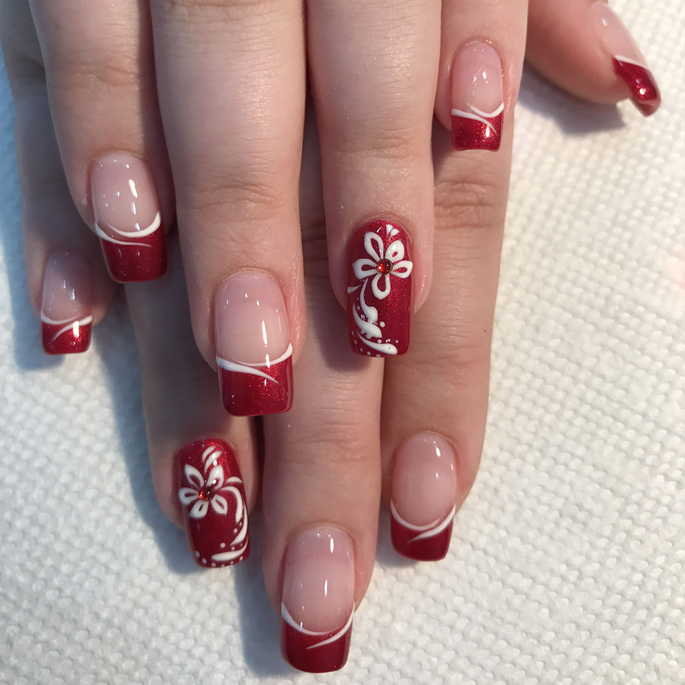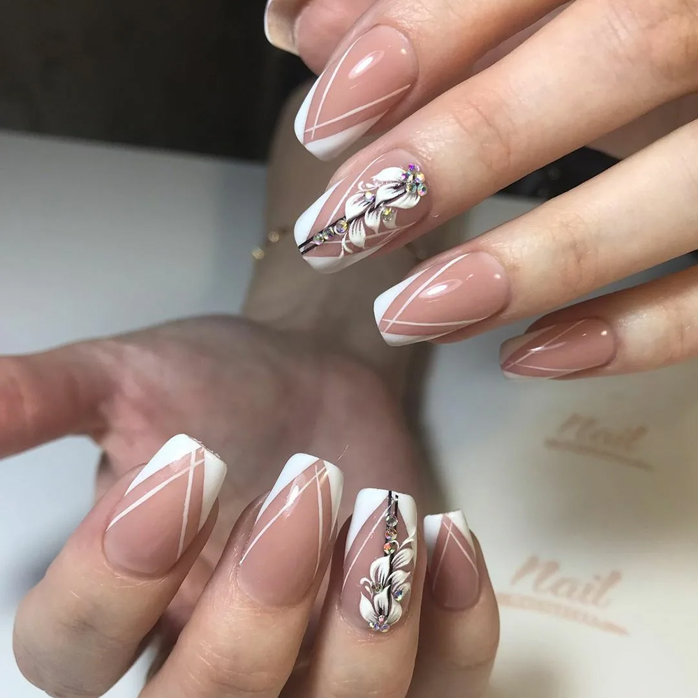 Классический вариант с белой полоской на конце ногтя или цветной. Дизайн подходит для квадратной, овальной, миндальной форм ногтей. Его можно дополнить красивой и кружевной росписью тонкой кистью. Полоску на свободном крае можно сделать стандартной формы или более выпуклую с длинными усиками. Такой дизайн подойдет и для повседневной жизни и для торжественных мероприятий (в том числе на свадьбу).