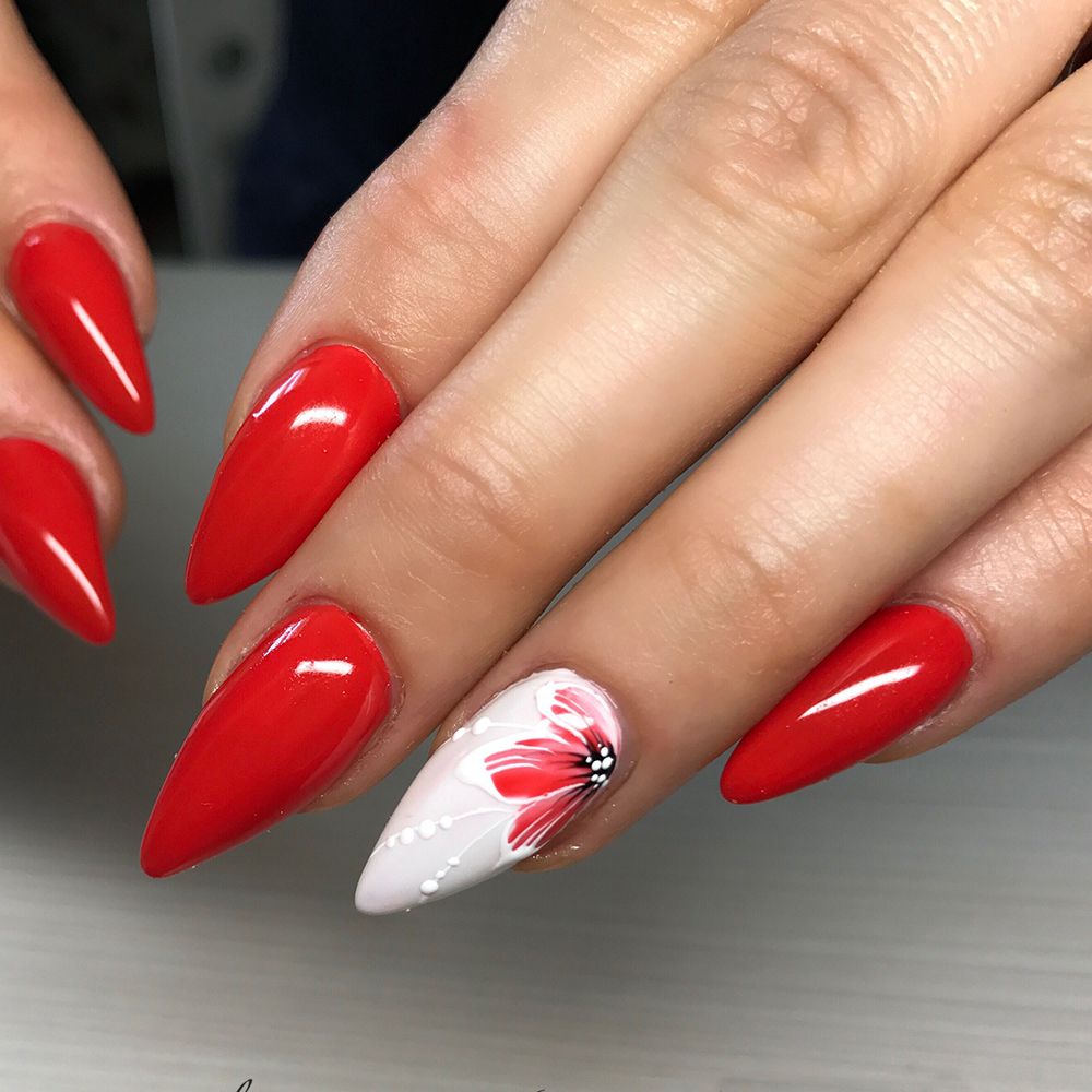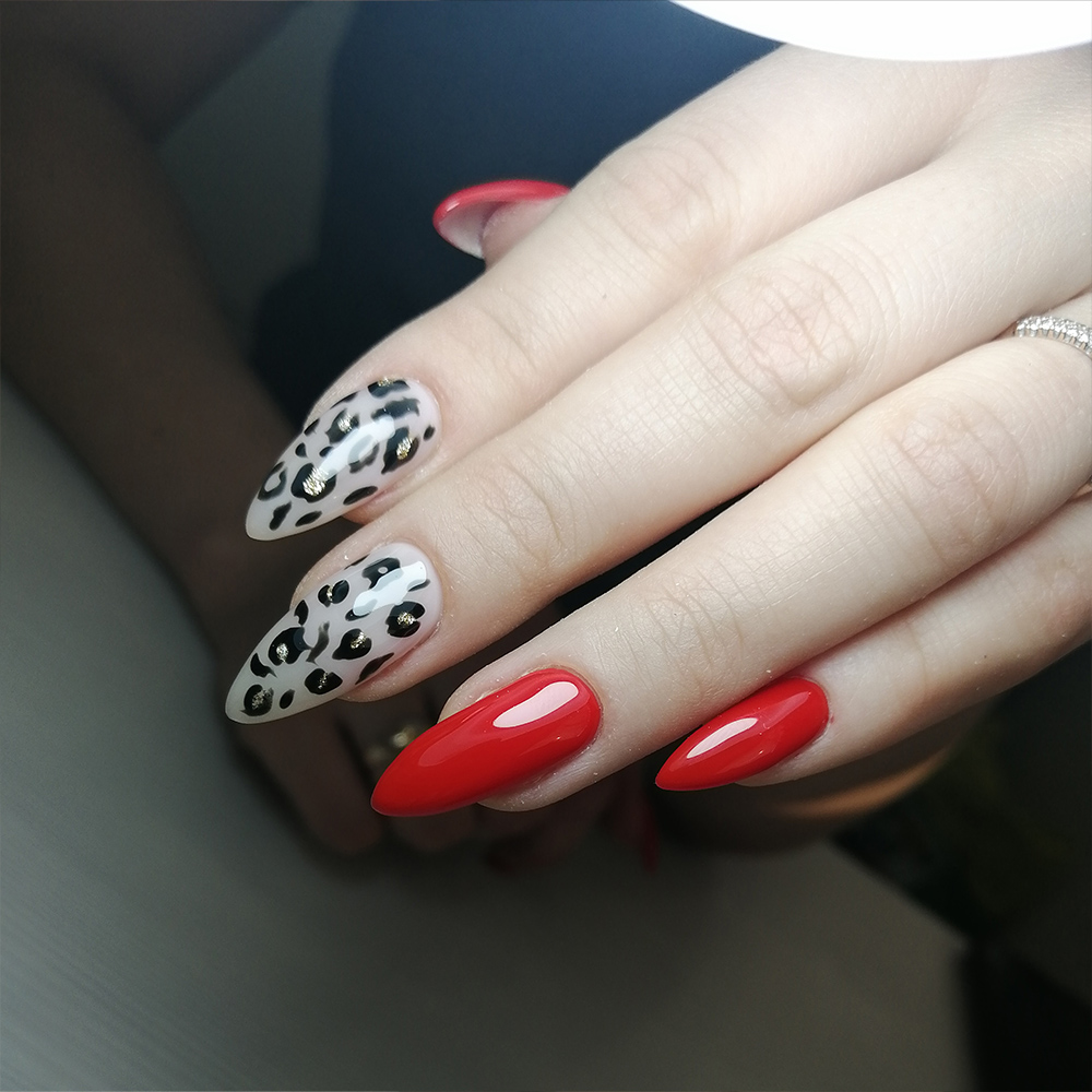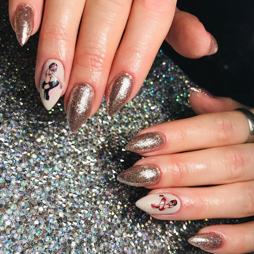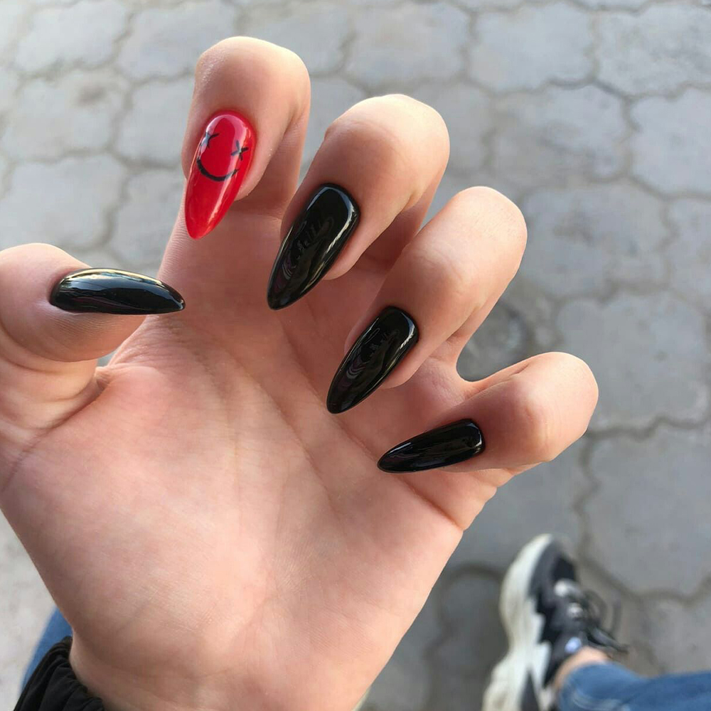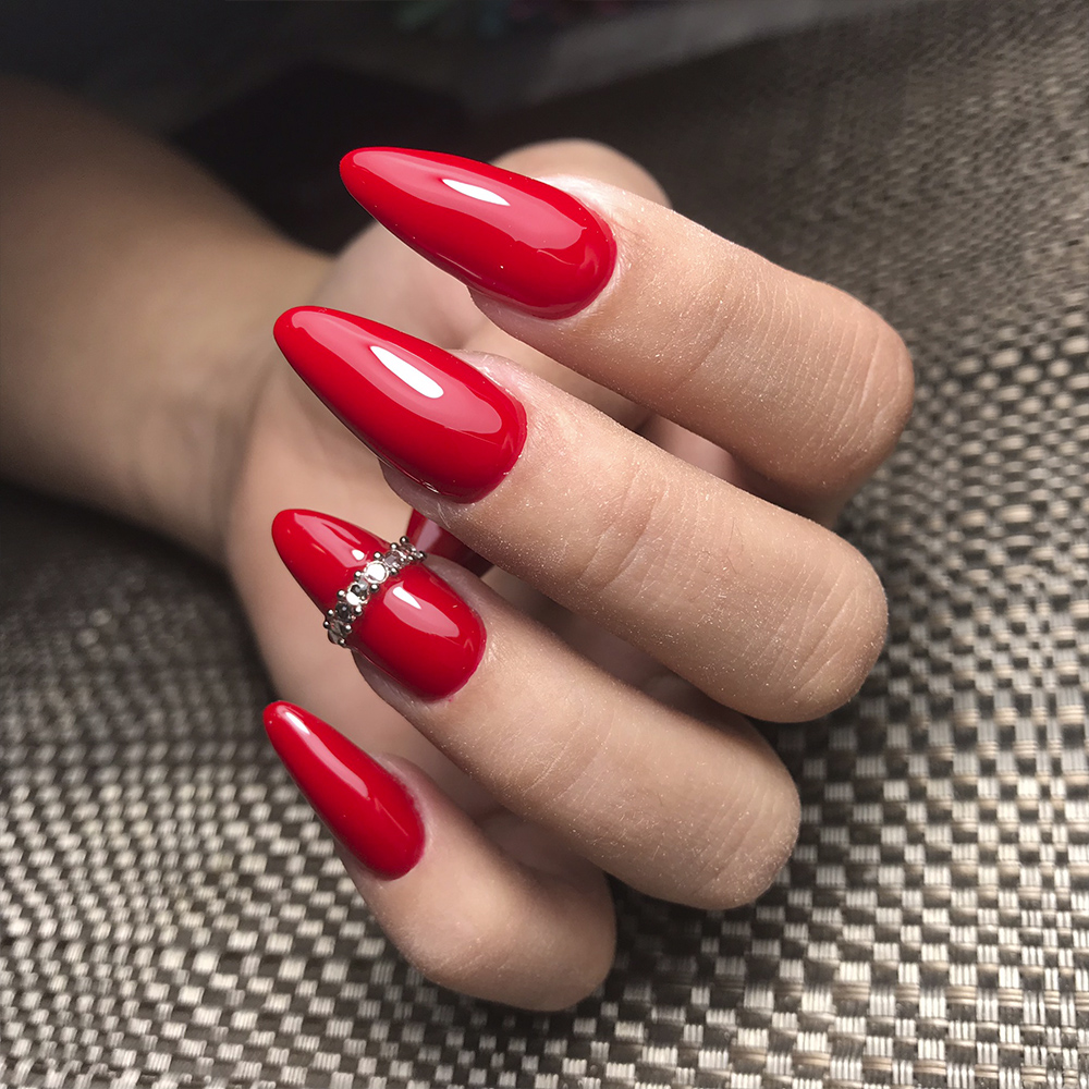 - Заостренная форма ногтей подойдет для самых дерзких и смелых. Острые ноготки зрительно удлиняют пальцы и кисть, делают их более изящными. Эта форма требует к себе большого внимания, потому что с ней не всегда удобно делать повседневные и бытовые дела. Если вы выбрали эту форму, то после маникюра вам следует быть аккуратней, чтобы случайно не сломать ноготь. Чтобы обезопасить себя от возможных неприятностей, попросите мастера укрепить ногти гелем или другим покрытием.