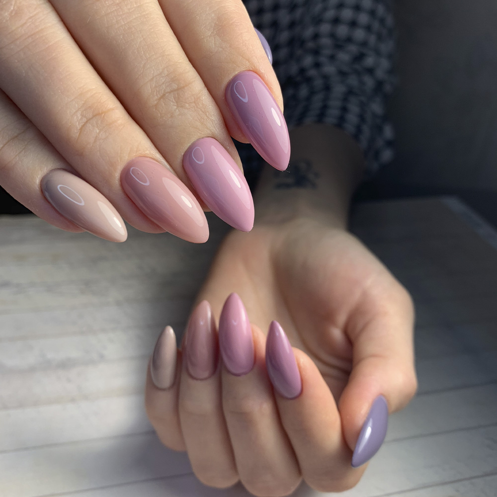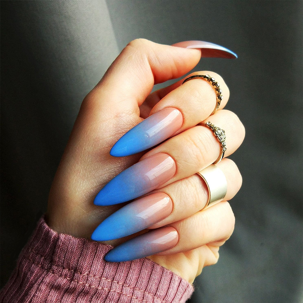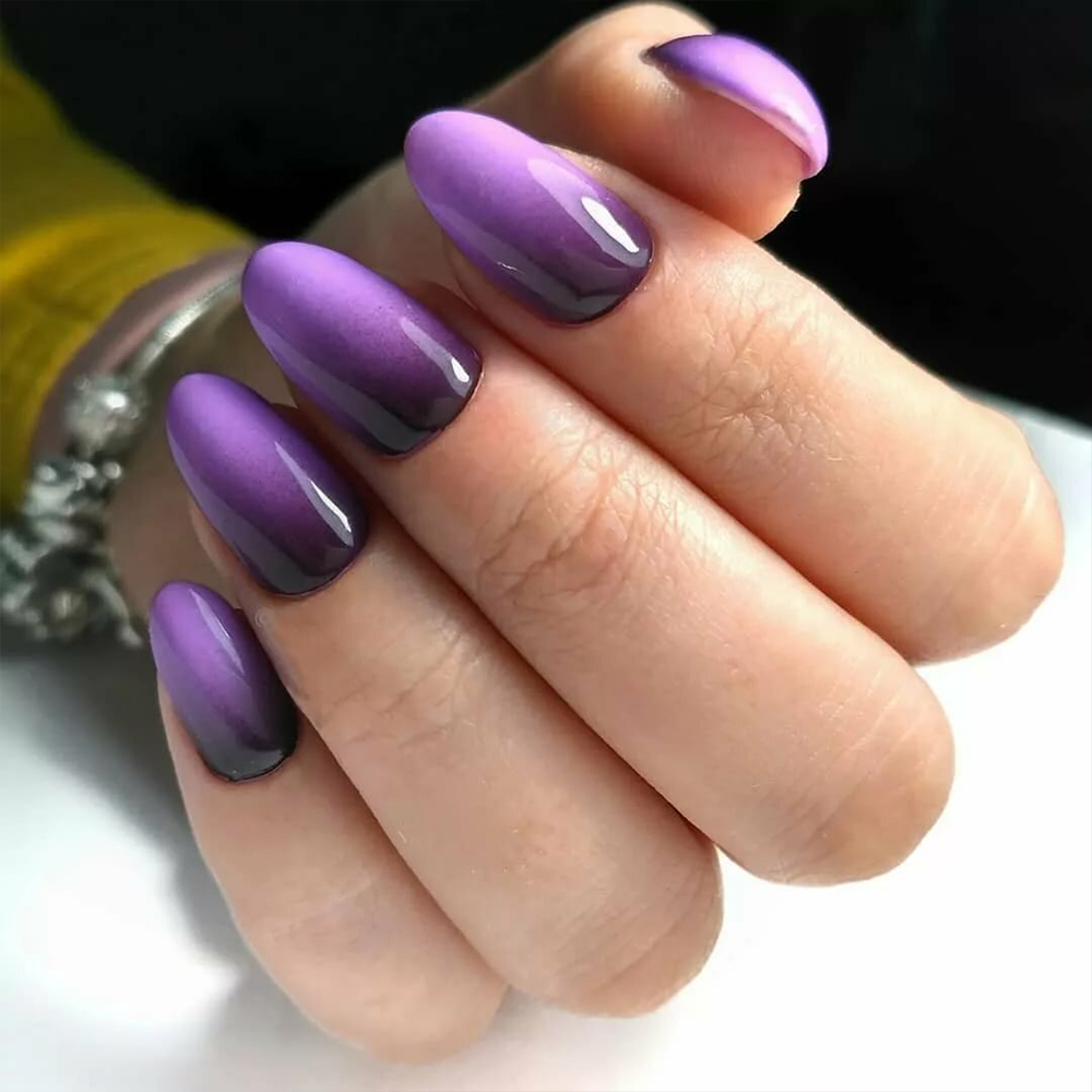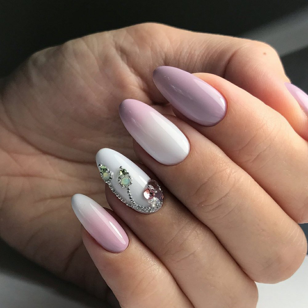 Другое название этого дизайна — омбре. Переход более темного цвета в светлый или тот же, но другого оттенка. Дизайн красиво выглядит на длинных ноготочках овальной и заостренной формы.