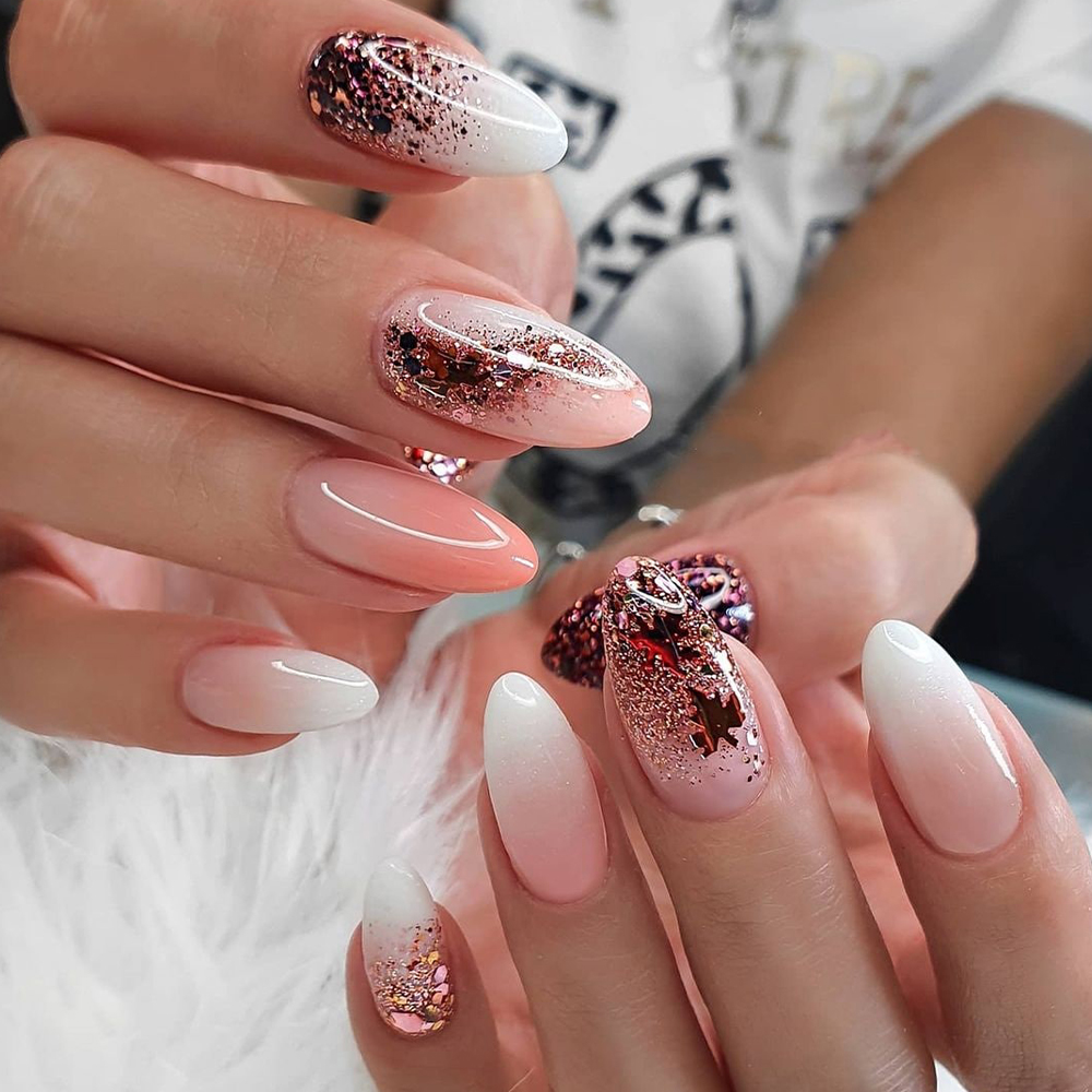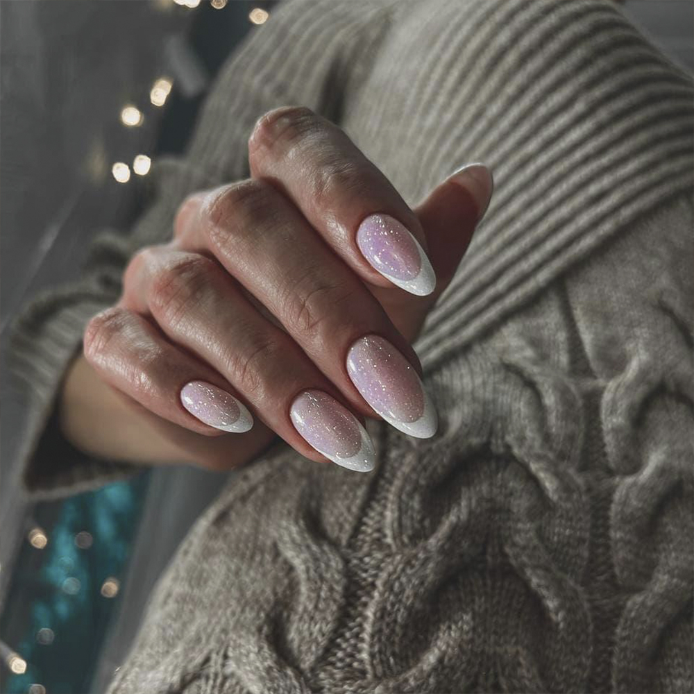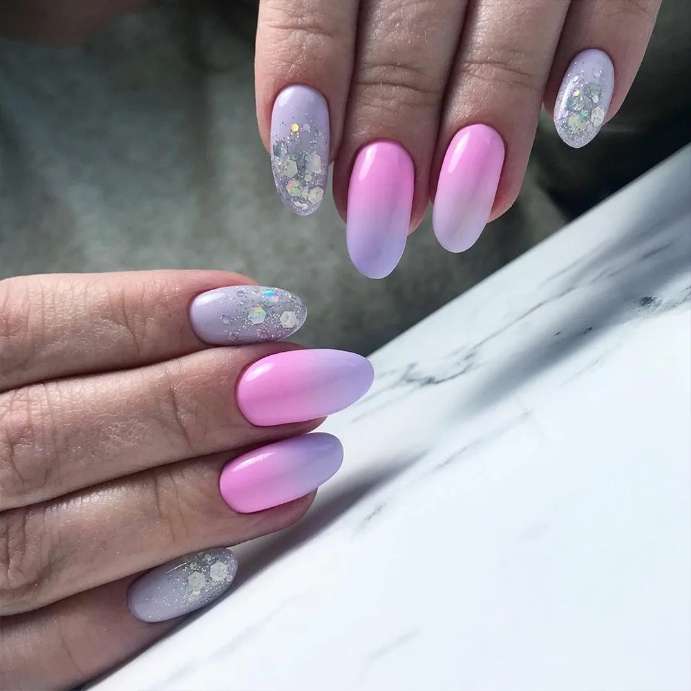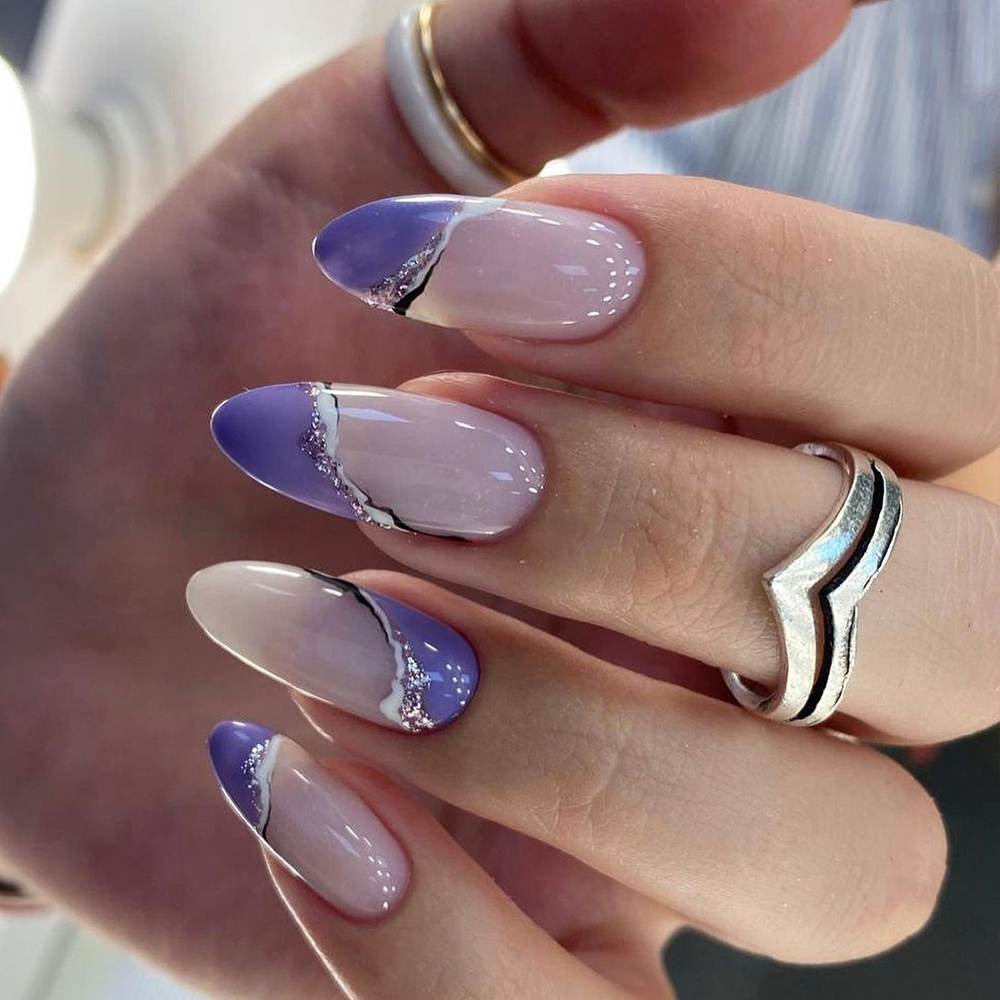 Другое название этого дизайна — омбре. Переход более темного цвета в светлый или тот же, но другого оттенка. Дизайн красиво выглядит на длинных ноготочках овальной и заостренной формы.