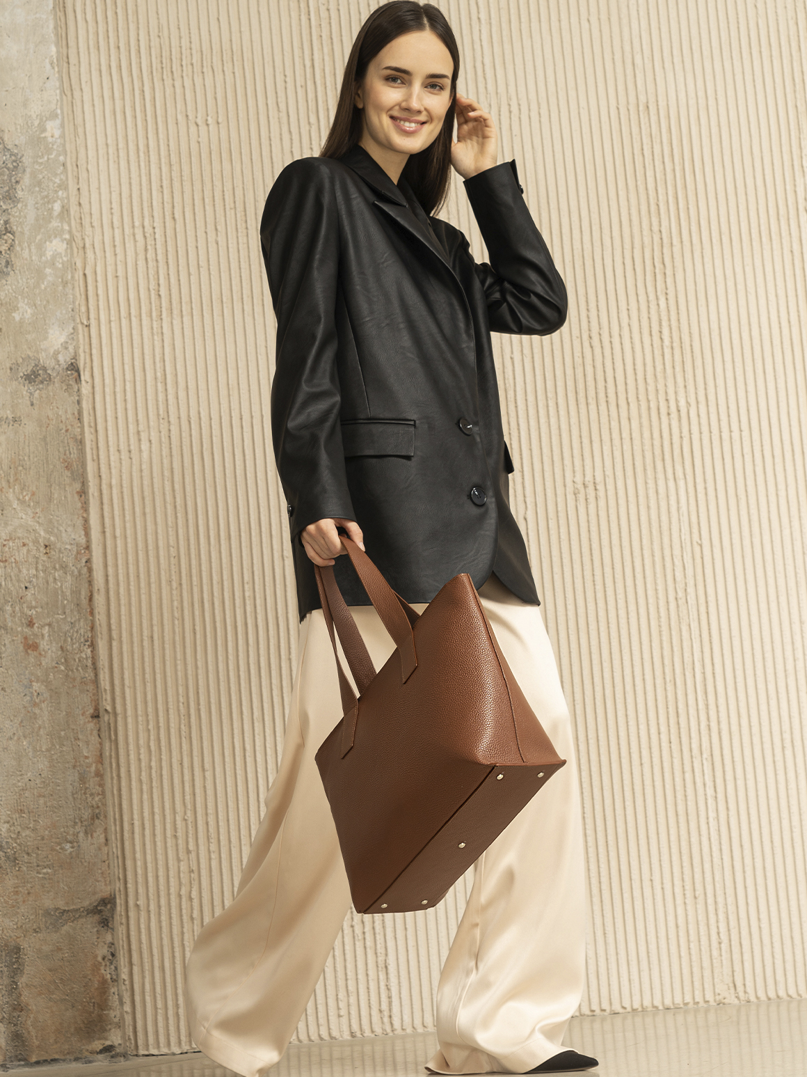 Шоппер ㅡ одна из универсальных сумок. Он вместительный, и с ним удобно ходить всем девушкам. Шоппер удачно сочетается с пальто оверсайз бежевого цвета и обувью на плоской подошве. В будние дни с ним можно ходить на учебу, а в выходные ㅡ по магазинам и в гости.