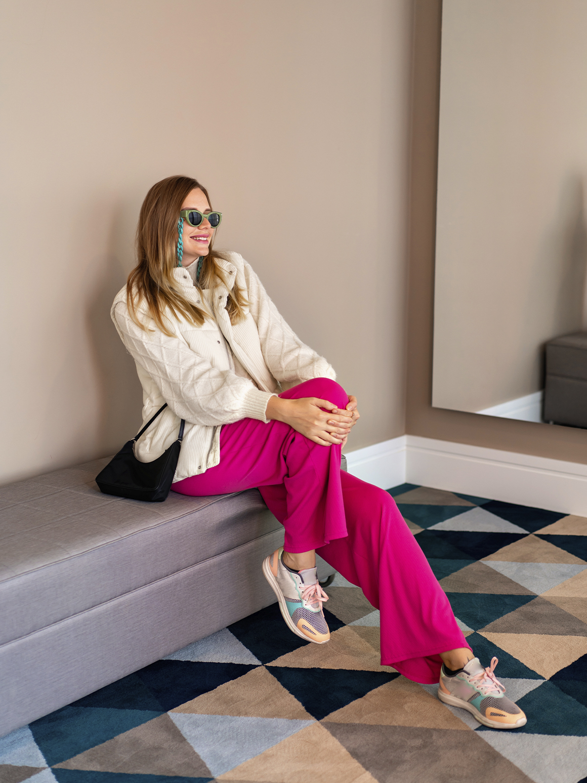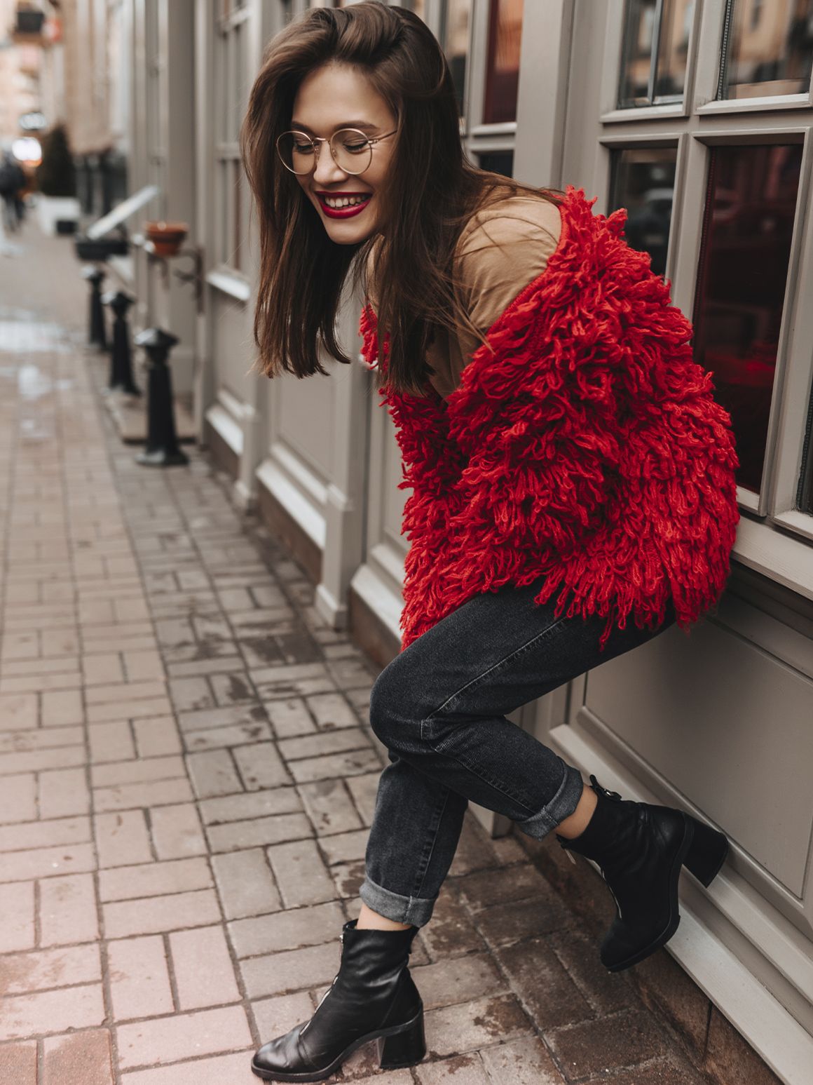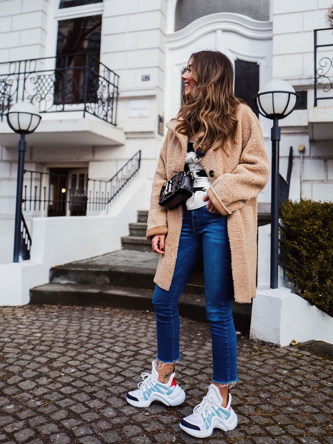 Для теплых посиделок с друзьями позвольте себе быть уютной. Запаситесь плюшевой сумочкой и ботинками на грубой подошве. Оверсайз-свитер или трикотажный жилет поверх объемной рубашки тоже будет уместен. Так вы соедините уютные частицы модных трендов в единый образ.
