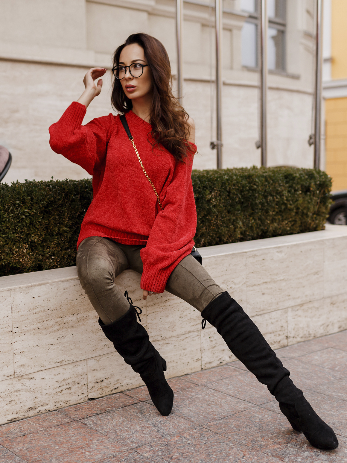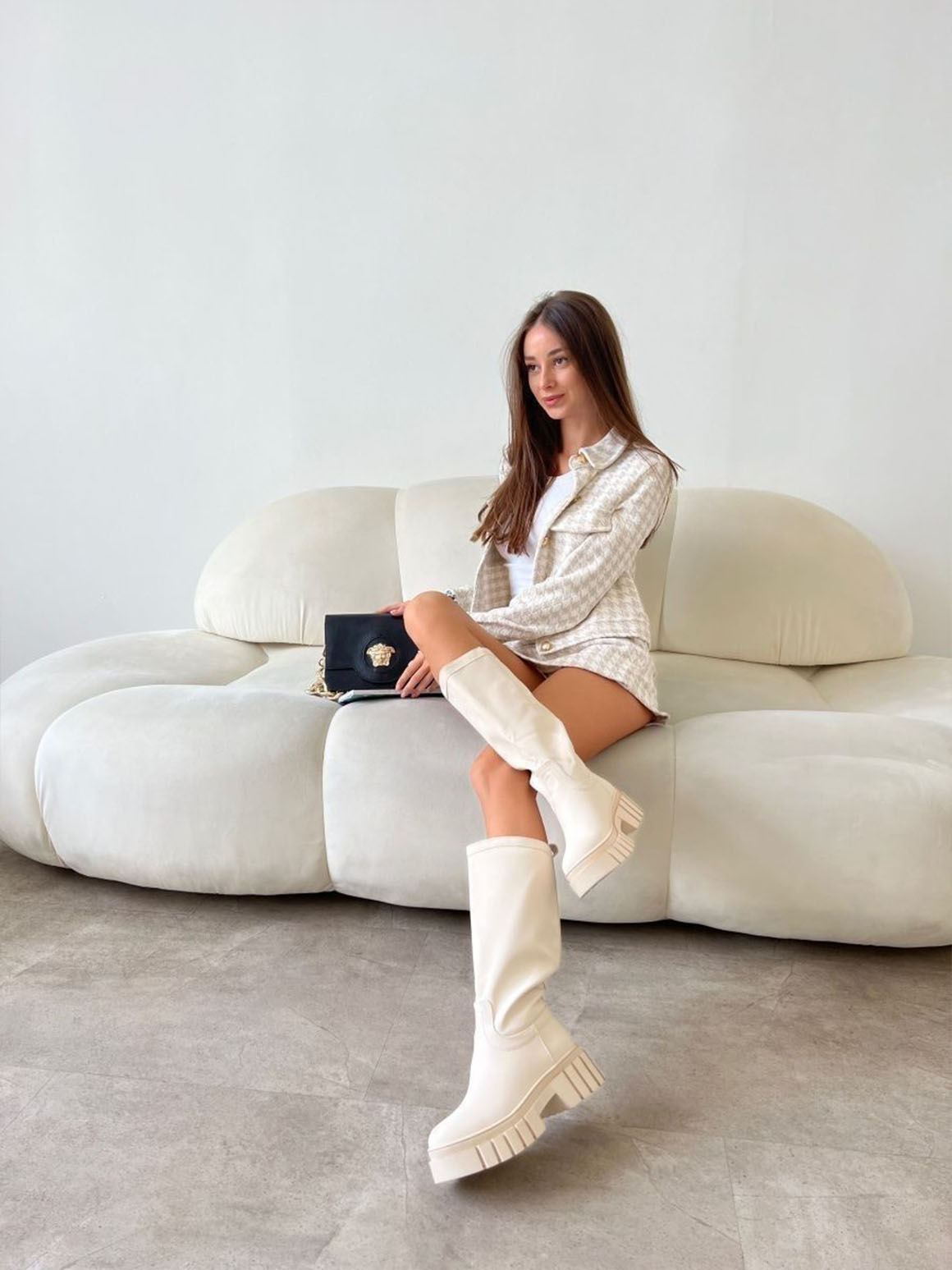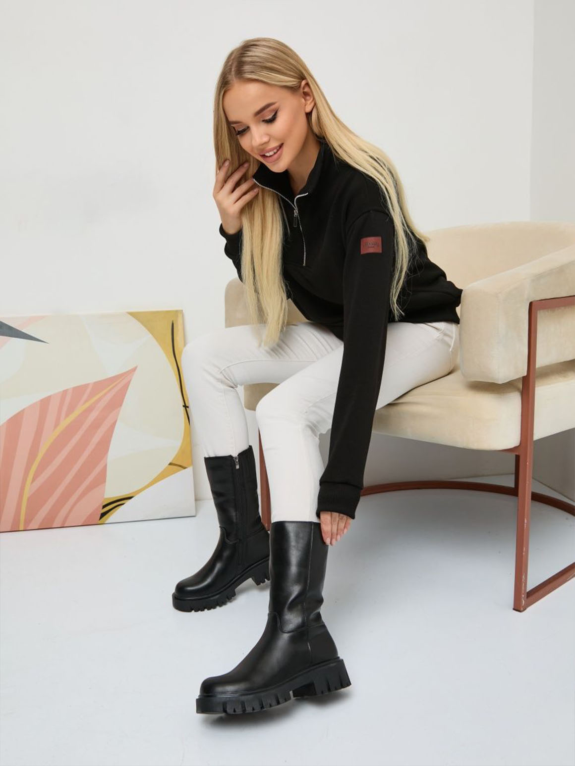 Чтобы ваш образ не стал антитрендовым, а оставался модным, забудьте о ботфортах, обтягивающих вашу ногу. В тренде модель с широкими голенищами. Такая обувь хорошо сочетается с оверсайз-верхом, например, с уютным свитером крупной вязки.