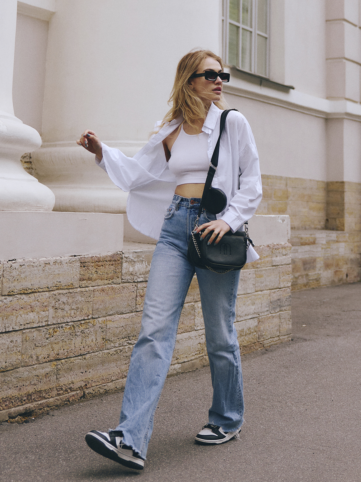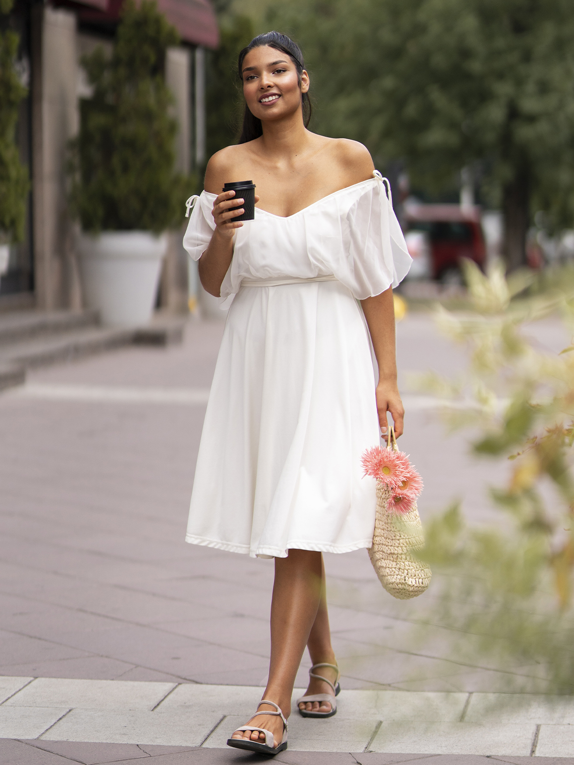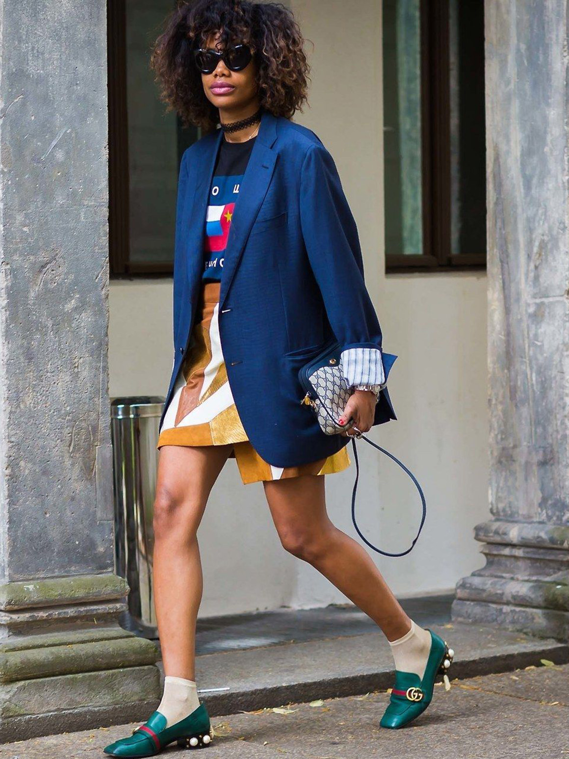 На прогулку выбирайте городской лук с яркими элементами и дополняйте образ тоутом, сумкой кросс-боди или почтальонкой. В качестве обуви для теплой осенней погоды подойдут балетки, туфли или кеды. Для холодной зимы — сапоги с широким голенищем и острым носиком.
