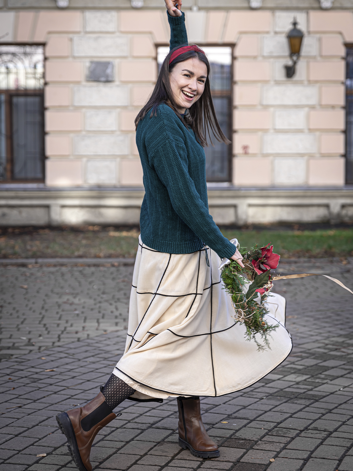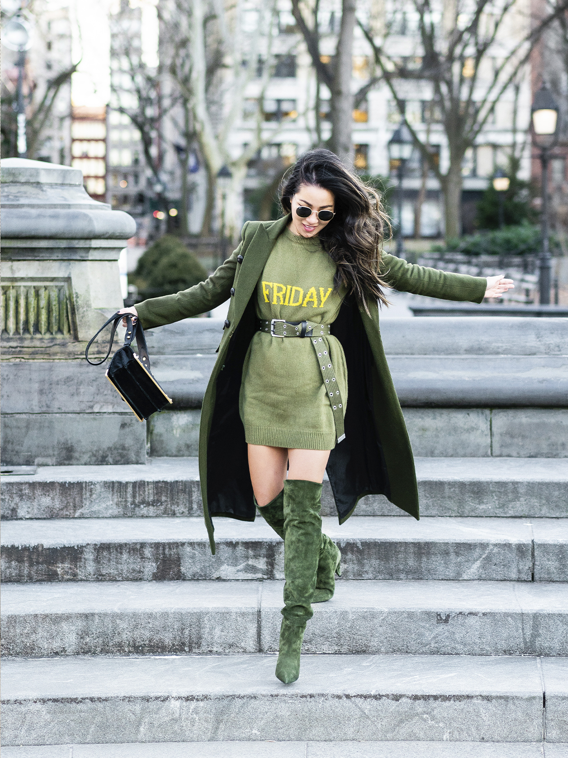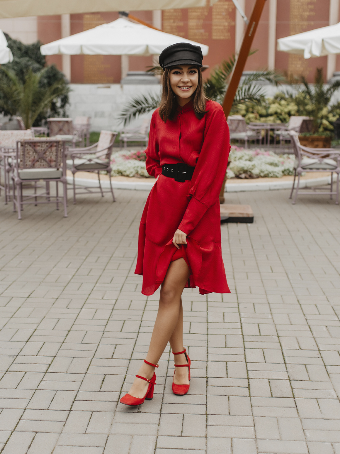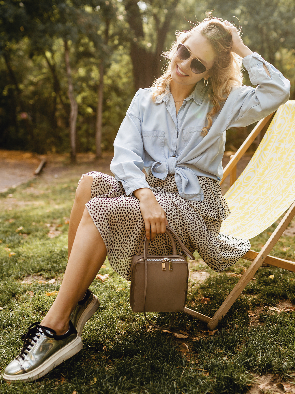 На прогулку выбирайте городской лук с яркими элементами и дополняйте образ тоутом, сумкой кросс-боди или почтальонкой. В качестве обуви для теплой осенней погоды подойдут балетки, туфли или кеды. Для холодной зимы — сапоги с широким голенищем и острым носиком.