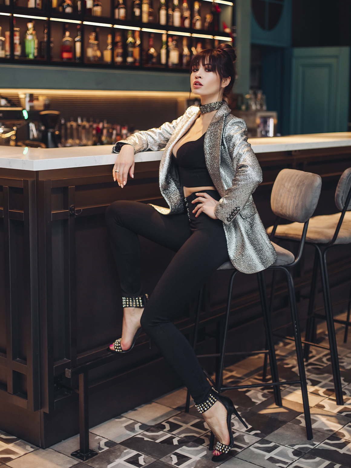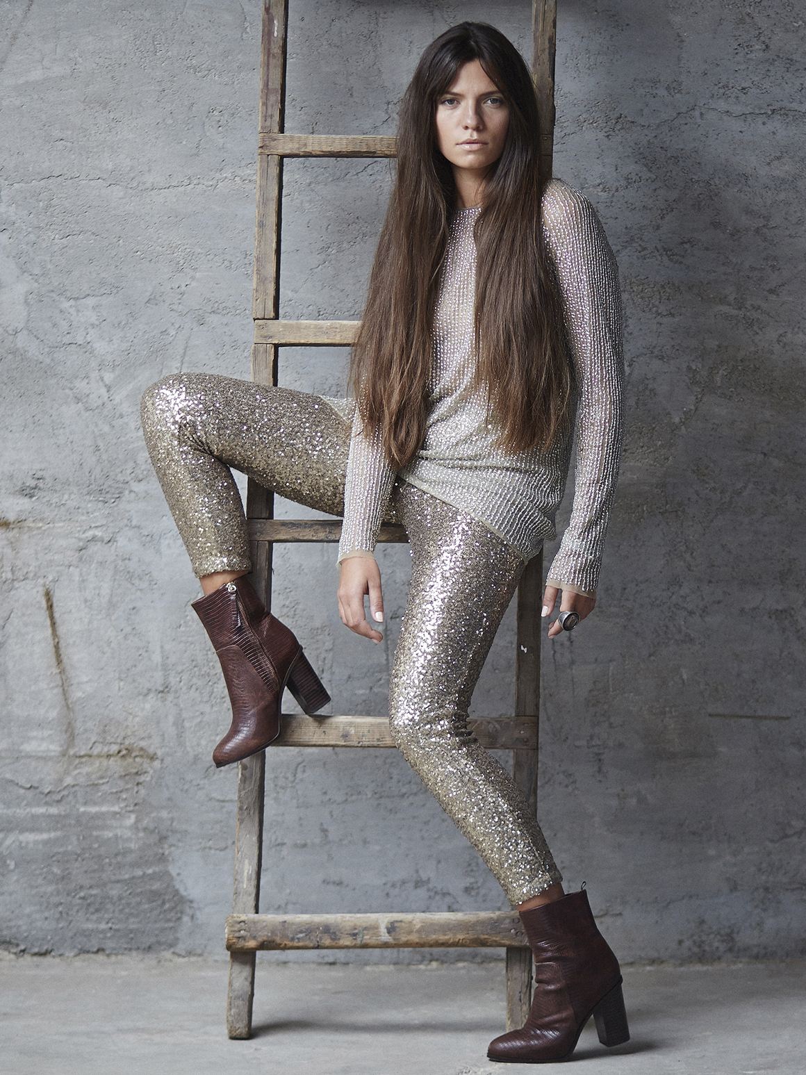 Для вечерних мероприятий допускайте обувь металлических оттенков, умело переплетая их с элементами своего гардероба. Например, с модными сапогами из серебряного материала надевайте черное платье с декором в виде серебристой длинной бахромы.
