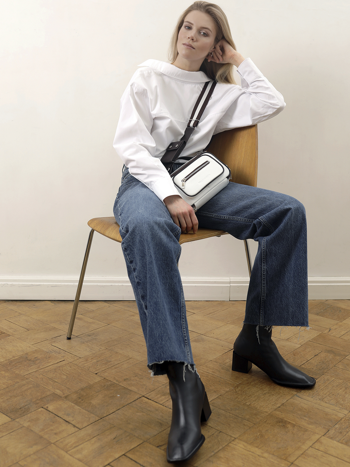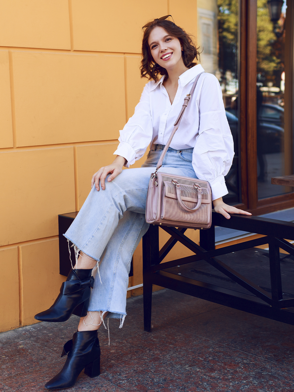 Носите светлый корсет поверх женской оверсайз-рубашки в сочетании с брюками-палаццо. Этой осенью подберите модные остроносые сапоги в цвет образу и завершите лук сумкой-ведро или кросс-боди.
