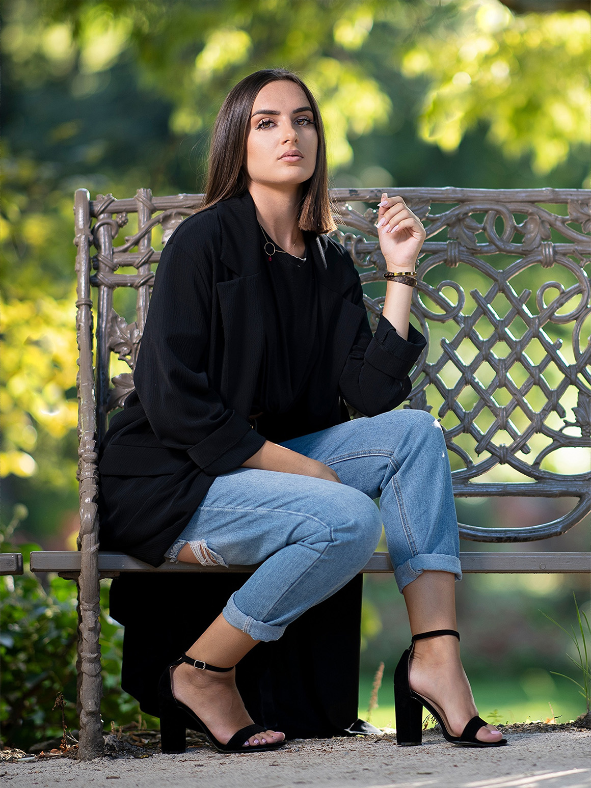 И не забываем про расклешенные джинсы этой осенью! Можно сочетать их как Джениффер Энистон на съемке сериала «Утреннее шоу», где она предстала в образце уличной моды. Черная водолазка и укороченный оверсайз жакет идеально дополнили образ. Вы можете разбавить его яркими акцентами. Например, челси на грубой подошве и сумочкой в сине-голубой цветовой гамме.