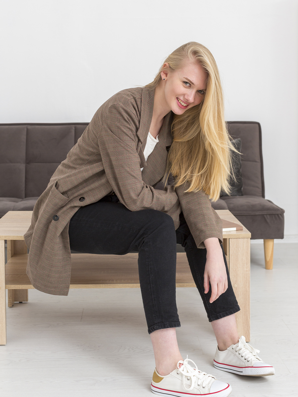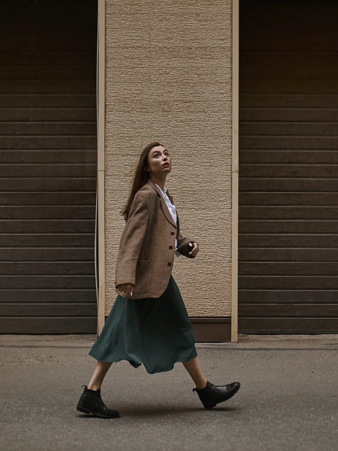 Внесите разнообразие в свой деловой стиль, если это позволяет дресс-код компании. Наденьте юбку длиной выше колена и свободный удлиненный пиджак. С таким комплектом можете сочетать грубые ботинки или более спокойные лоферы.