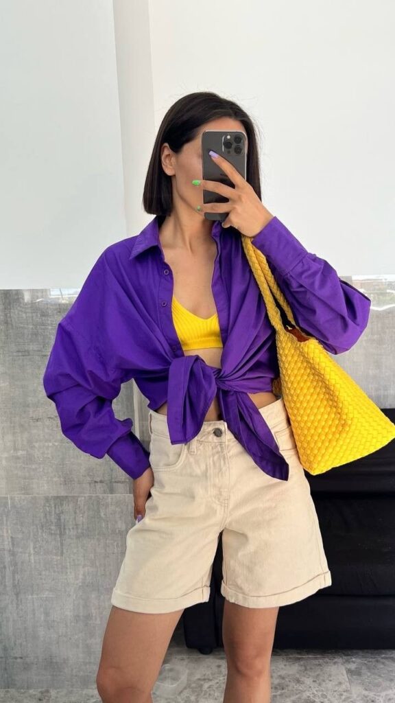 Жёлтый аксессуар хорошо сочетается с белым, фиолетовым, голубым, зелёным и синим цветами. Для аутфита на каждый день можно выбрать джинсы и шорты в голубых и чёрных тонах.
