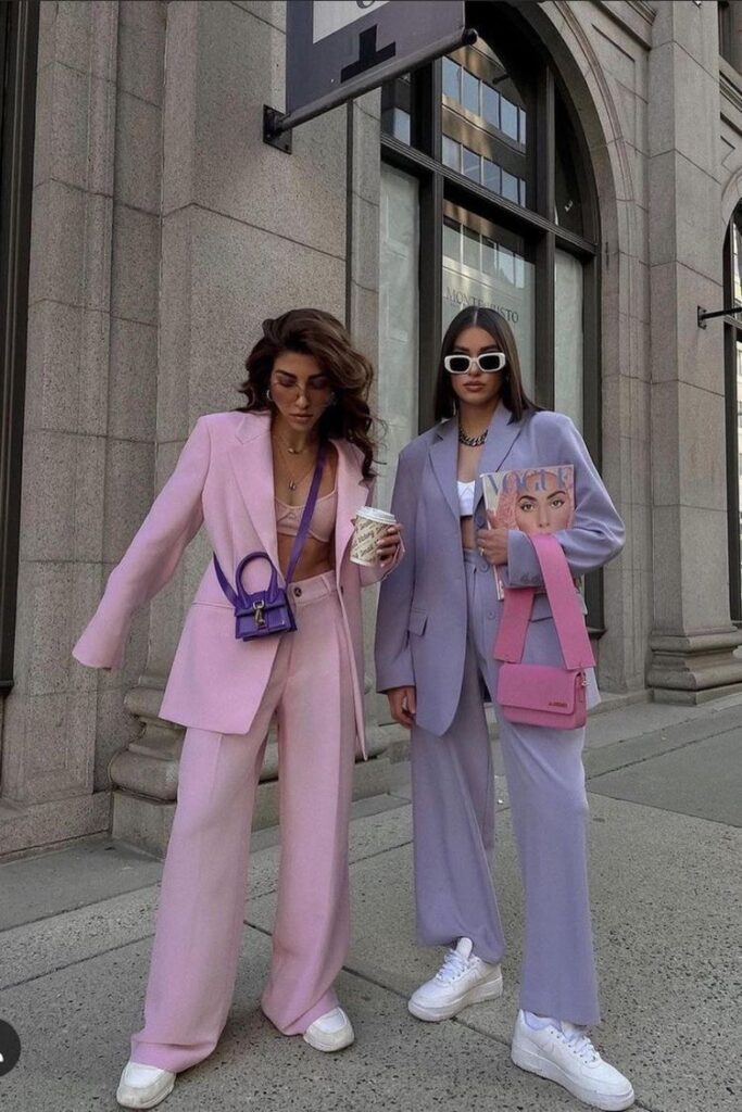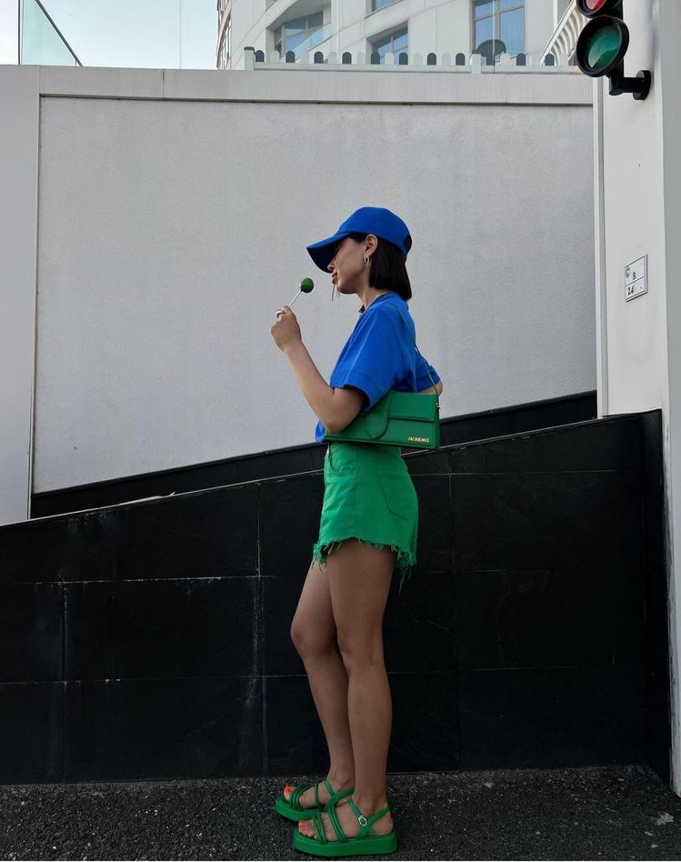 Есть еще вариант для самых смелых модниц: цветная сумочка может выступать как дополнение к наряду со схожей цветовой гаммой. Такие total-луки популярны среди селебрити, ведь они визуально стройнят и вытягивают силуэт вертикально.