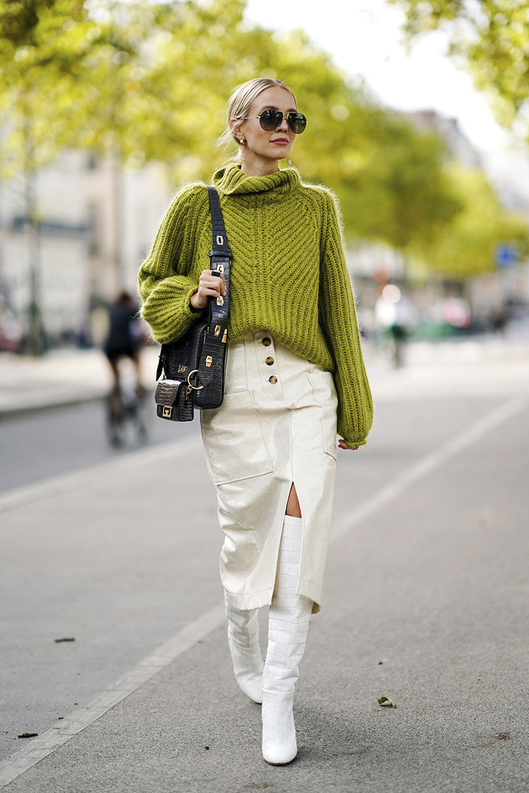 Лучшее сочетание на осень — свитер с объемными рукавами и ботинки на грубой подошве.