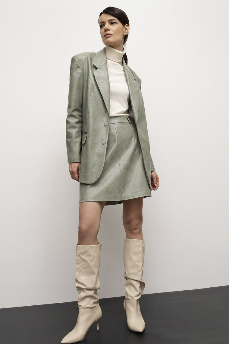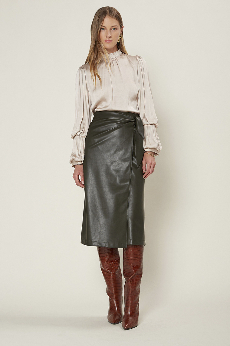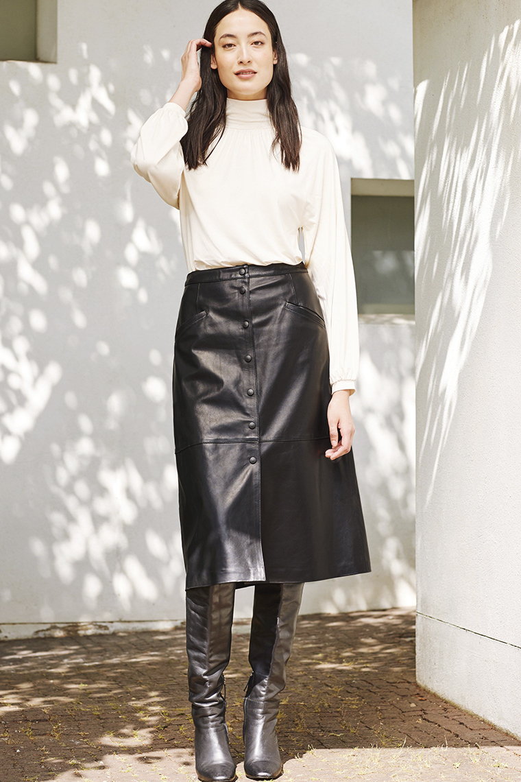 - Миди из эко-кожи. Силуэт трапеция или карандаш сейчас присутствуют в большинстве осенних и зимних луков. Выбирайте длину ниже колена и плотный материал. Боковой умеренный разрез или запах — допускается. Что примечательно, так это богатство цветов, которые предлагают стилисты к вашему образу: черный, кофейный, металлика, травяные оттенки, винный, бордовый.