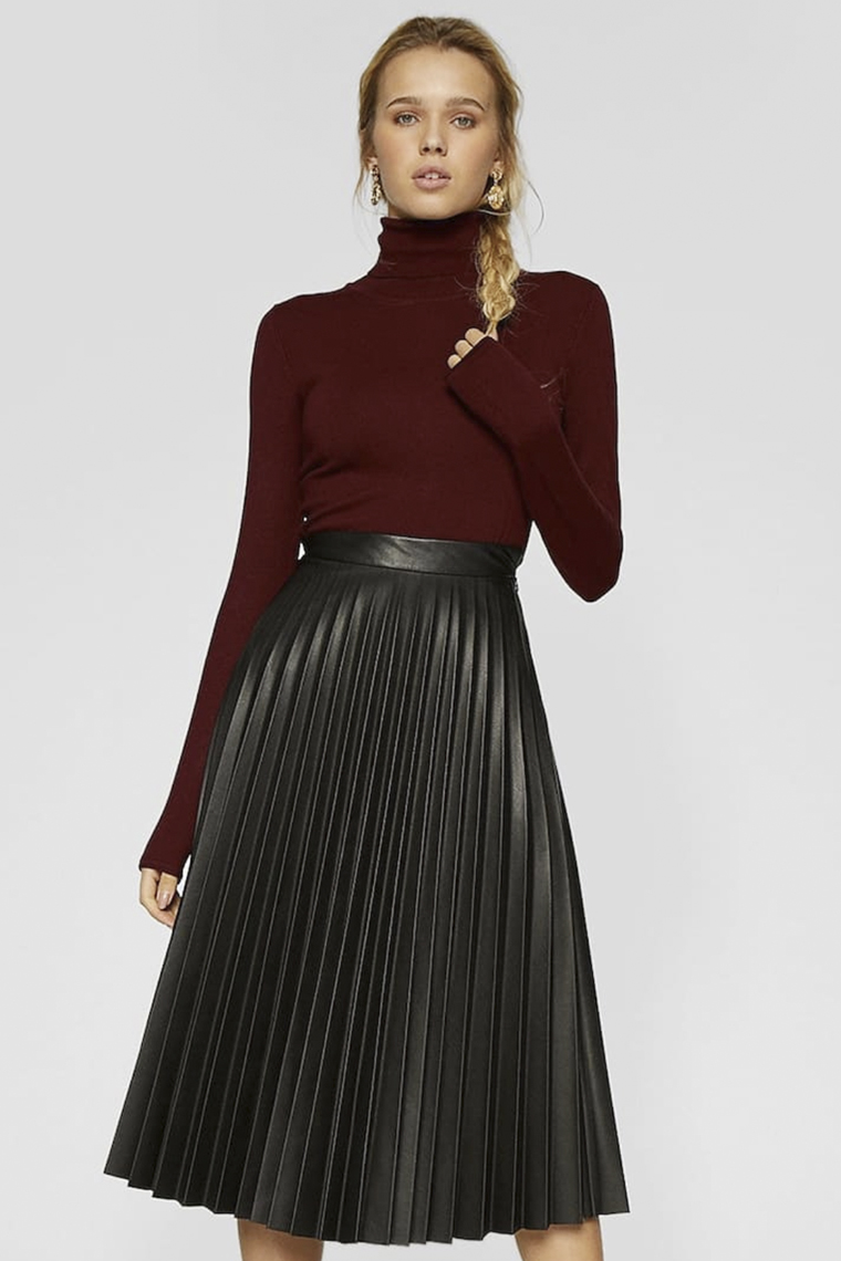 Модель со складками можно носить вместе с вещами разных стилей. Например, она прекрасно сочетается с оверсайз-худи, а также со свитшотами. Добавляйте к этому челси или ботинки на шнуровке, и у вас получается повседневный образ. Для официальных встреч надевайте к кожаной юбке свободный пиджак и рубашку, а обувь выбирайте более строгую — лодочки на каблуках или лоферы. Для более дерзкого лука носите однотонную футболку, а сверху надевайте косуху в тон юбке.