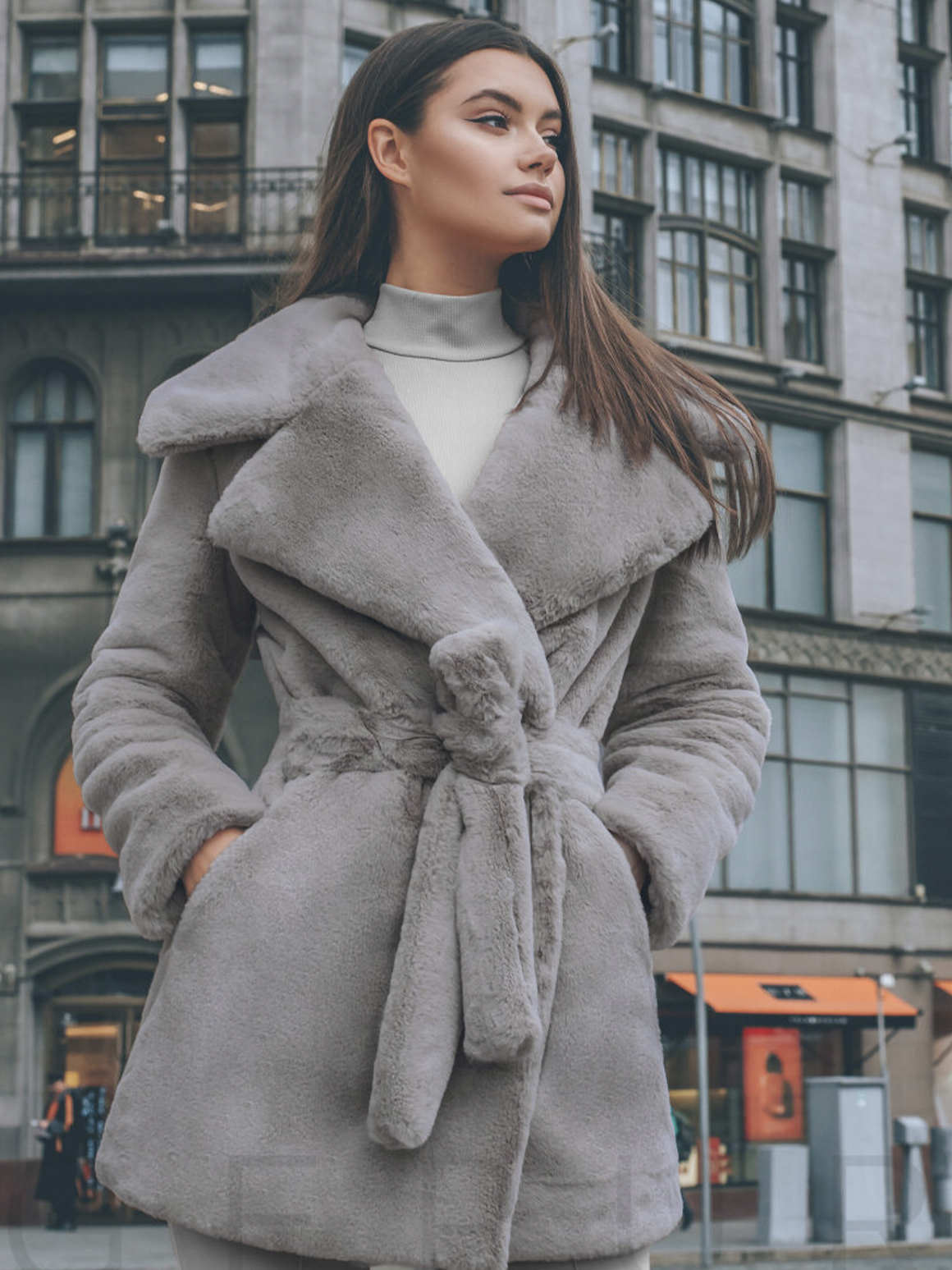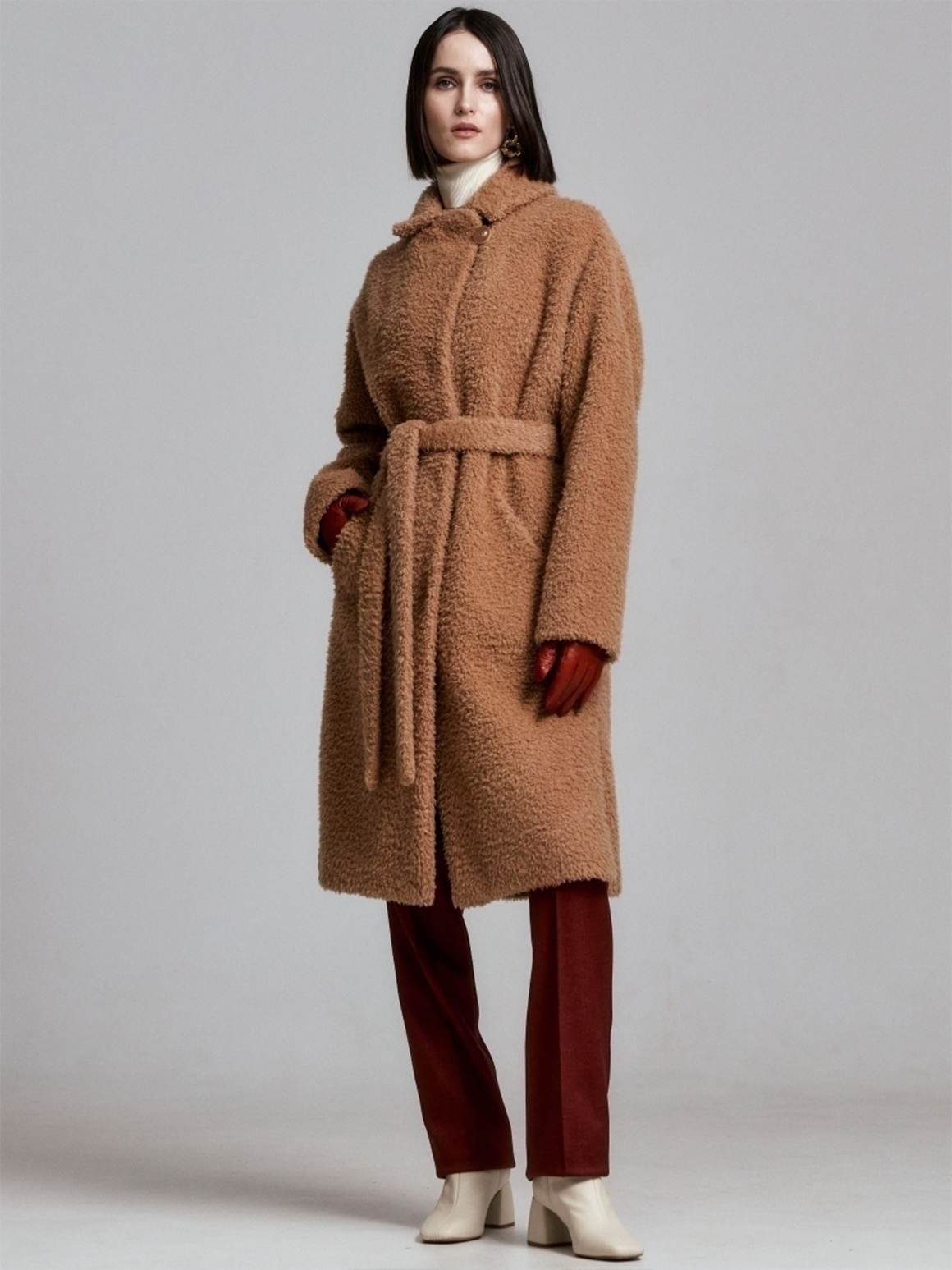 Стильный полушубок с поясом в натуральной цветовой гамме. Для комфортного городского шопинга и поездок за рулем.