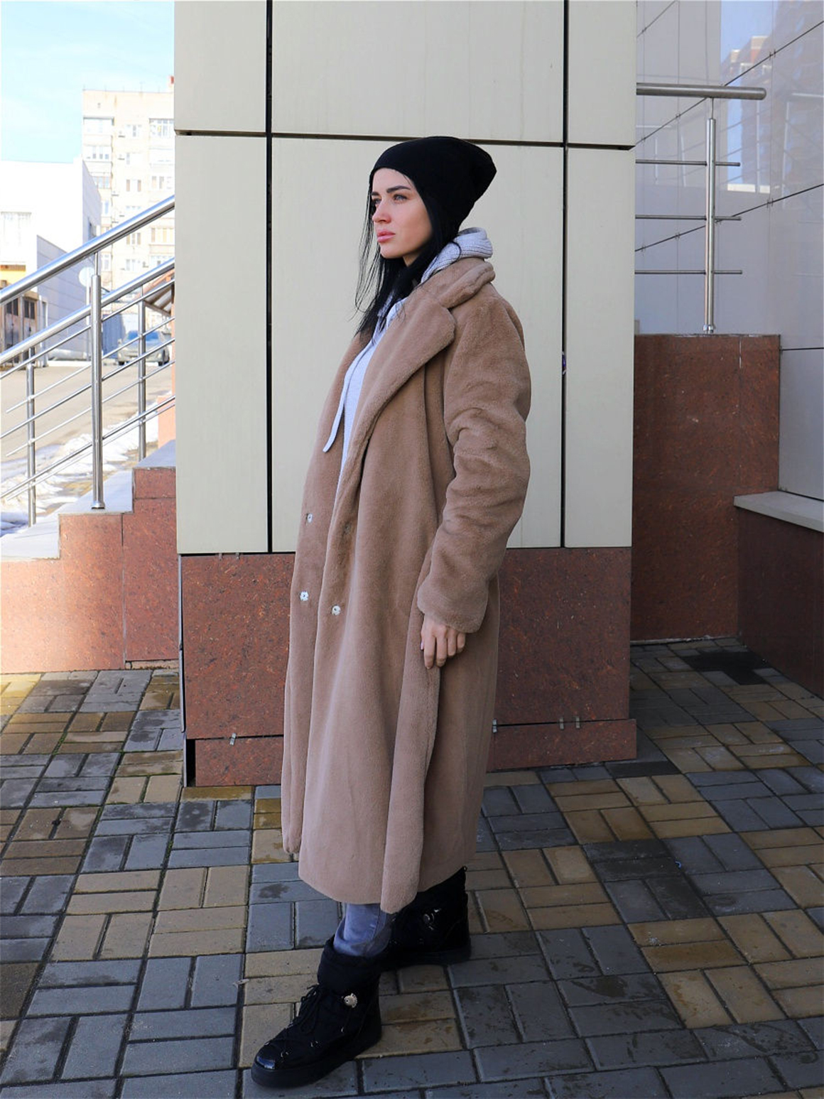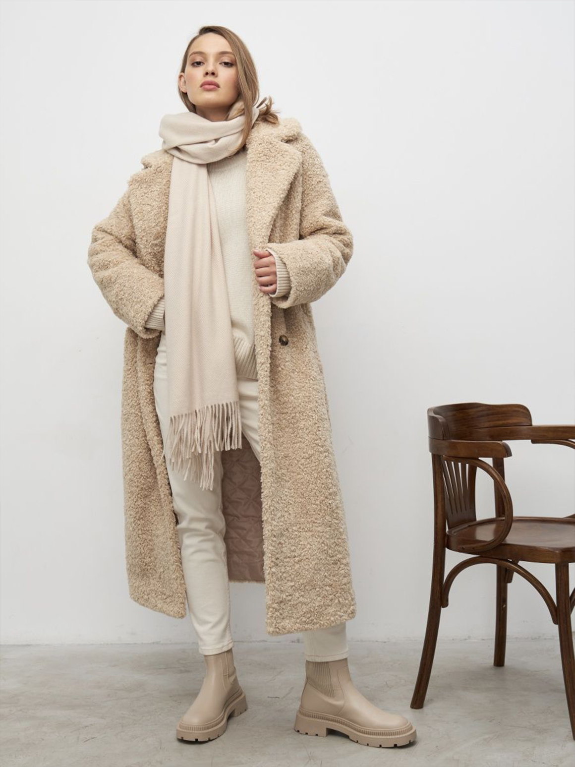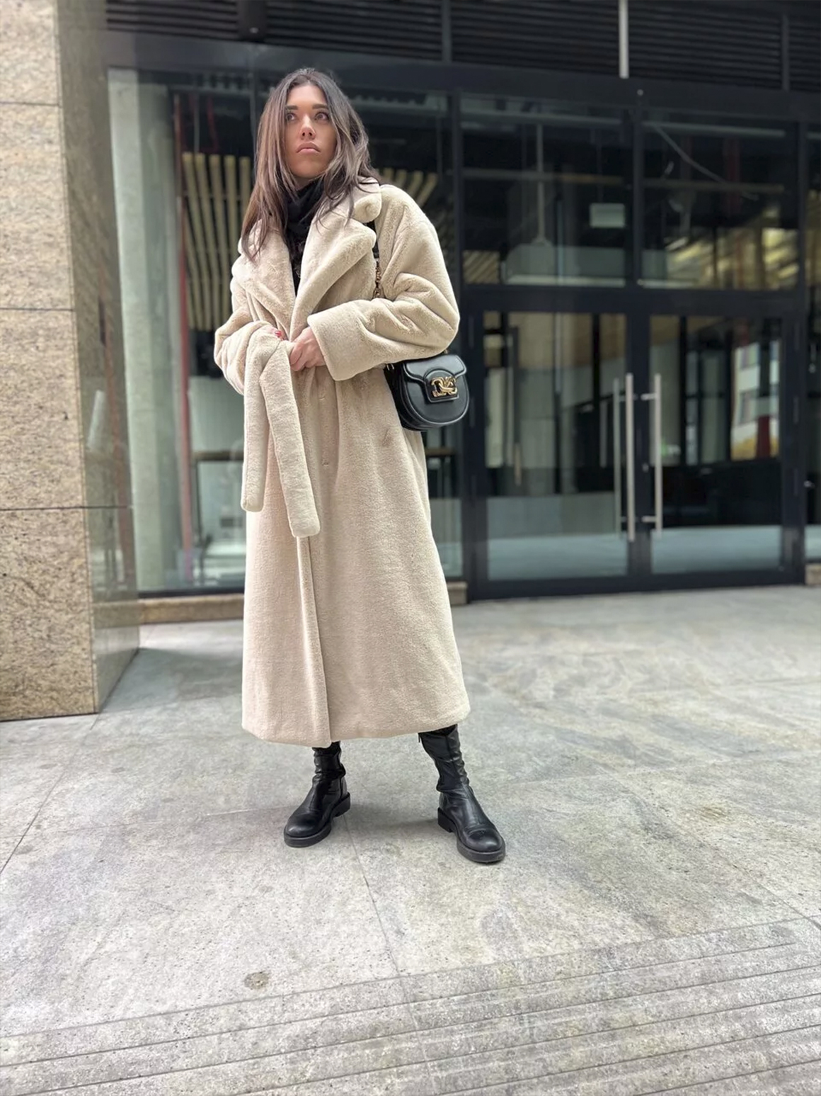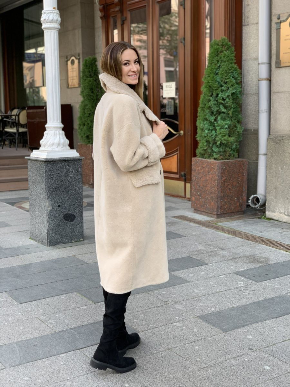 На фото ㅡ хит сезона 2022/23. Бежевая модель оверсайз из искусственного меха. Удлиненный вариант не даст нам замерзнуть в холодные зимние дни.