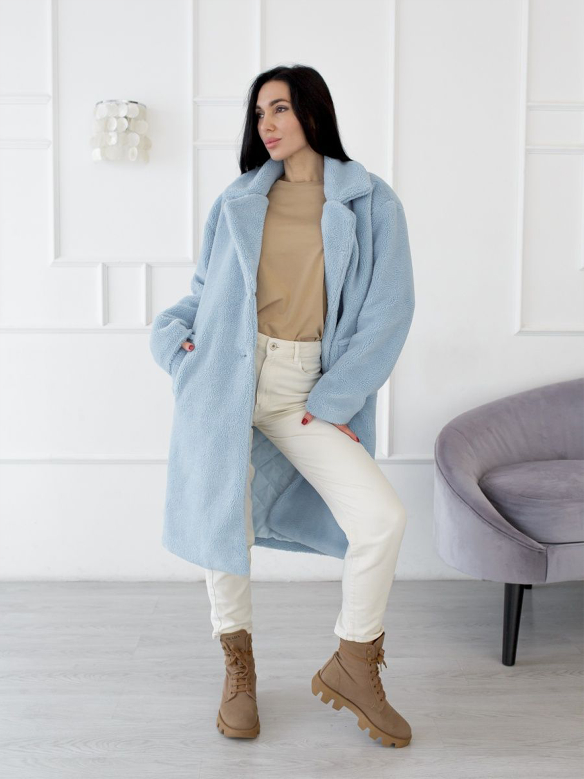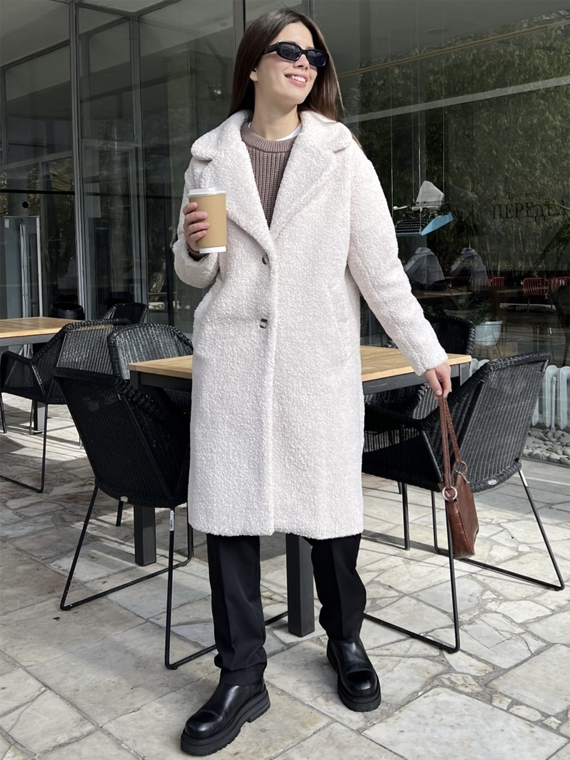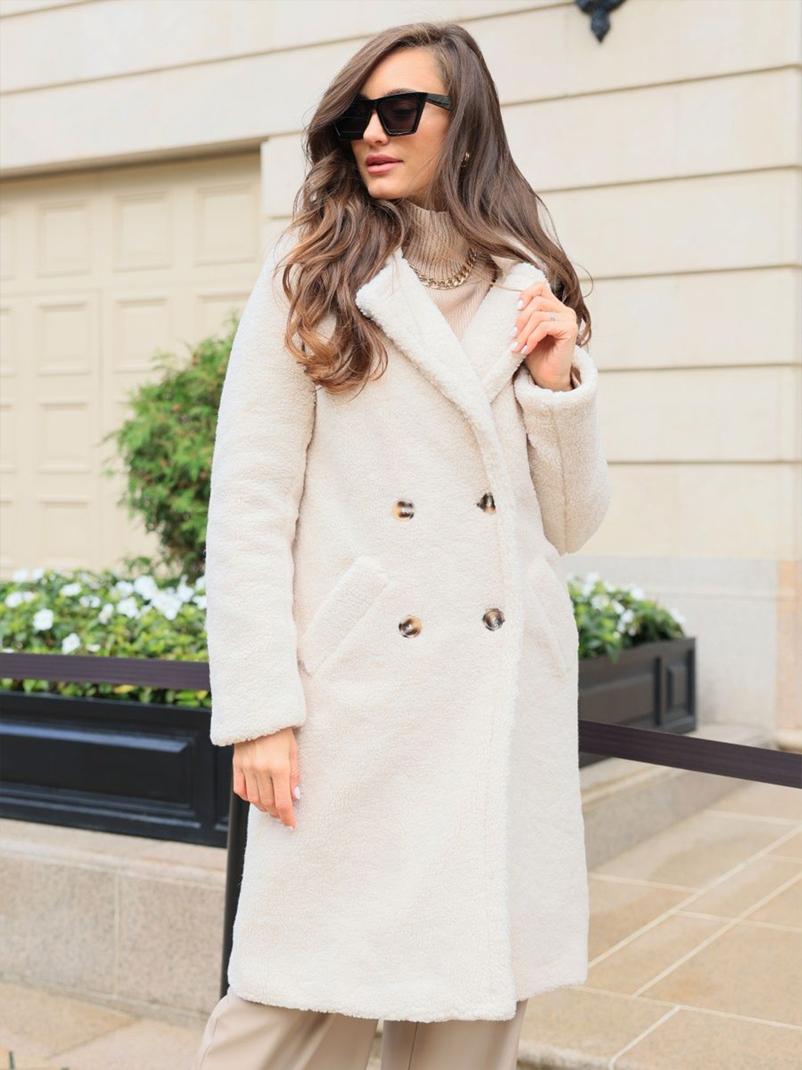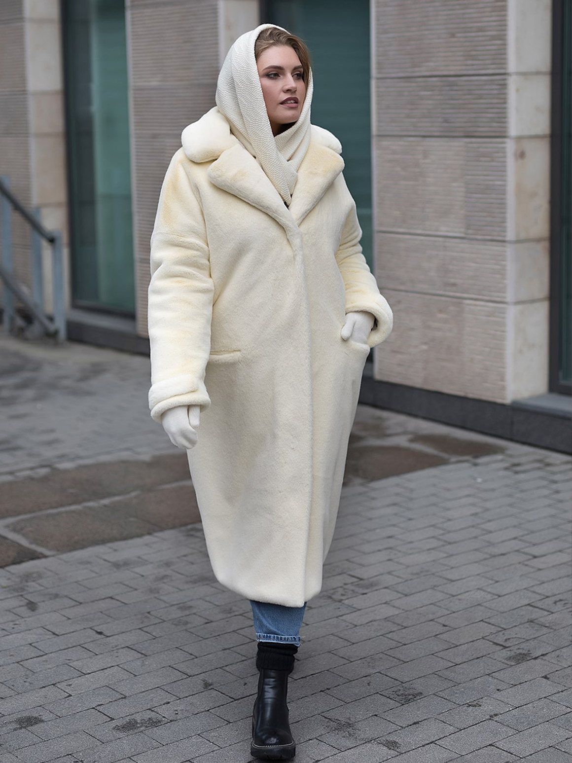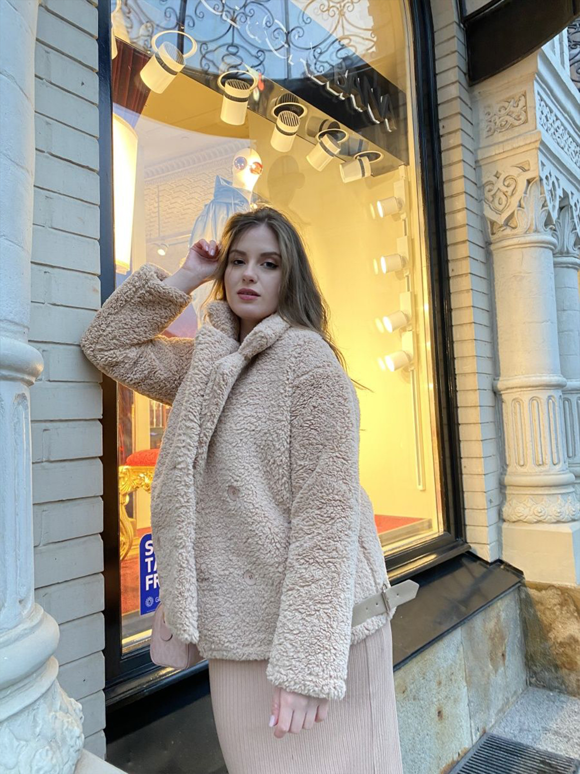 На фото ㅡ хит сезона 2022/23. Бежевая модель оверсайз из искусственного меха. Удлиненный вариант не даст нам замерзнуть в холодные зимние дни.