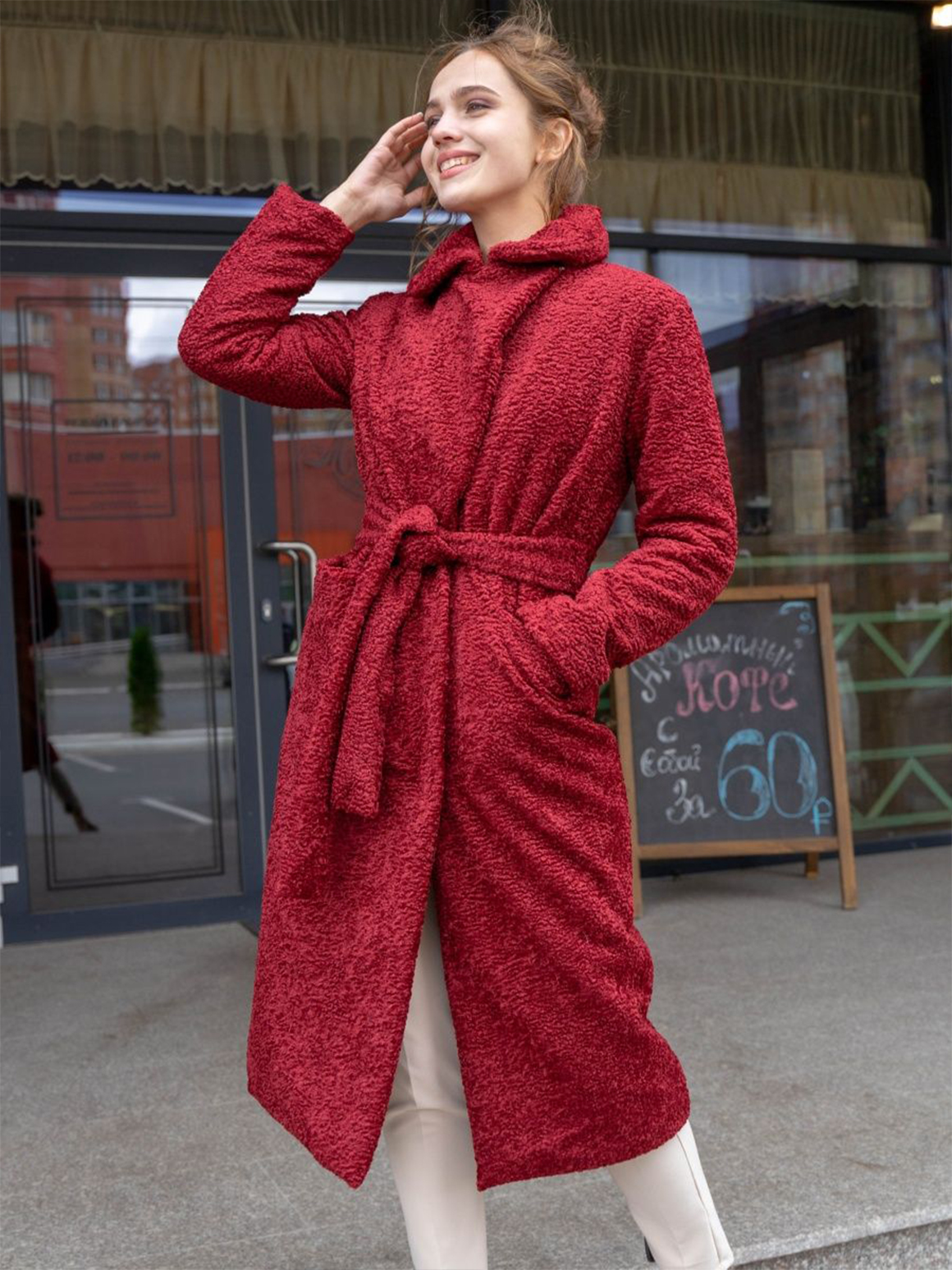 - Фасон халата. Длиной до колена или ниже, с поясом и широким воротником. Шуба может быть пастельного оттенка или с характерным для халата узором.