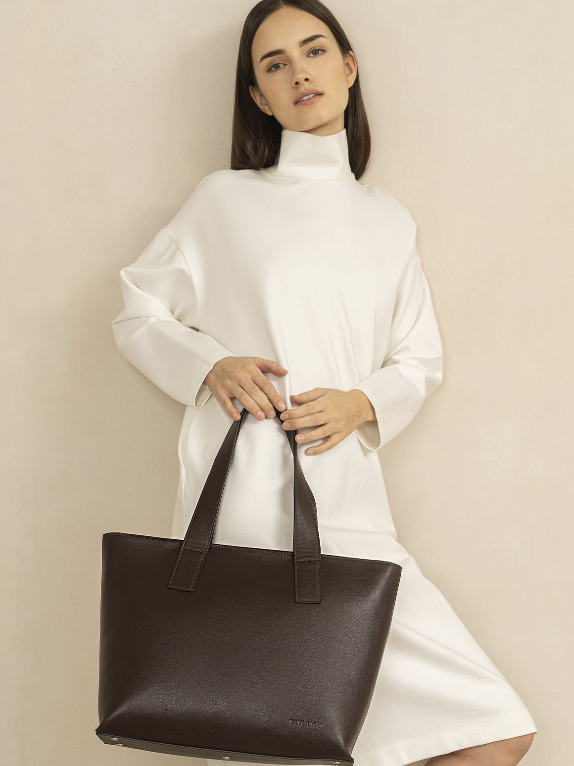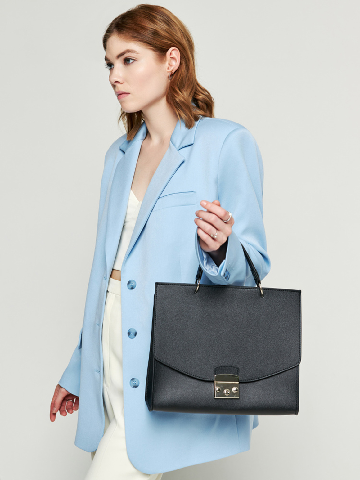 - Тоут. Это повседневный женский аксессуар, который больше всего подойдет для работы и деловых встреч. Классическая вещь достаточно большого объема с двумя ручками. Тоут практически никогда не выходит из моды. Если купить его в универсальном оттенке, например коричневом, то можно носить в любое время года с любой одеждой. Тоут лучше покупать брендовый, сделанный из натуральной кожи.