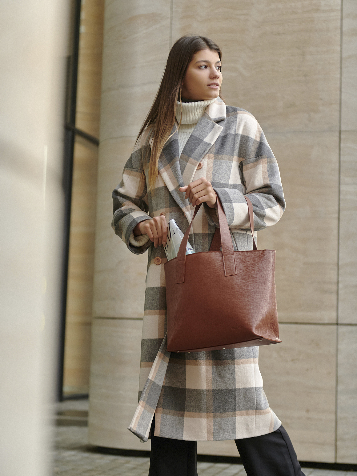На следующем фото вариант для девушек, которые предпочитают короткие куртки. Модный образ на учебу, работу. Объемный кожаный тоут с твердым каркасом ㅡ то, что нужно для осени и зимы.